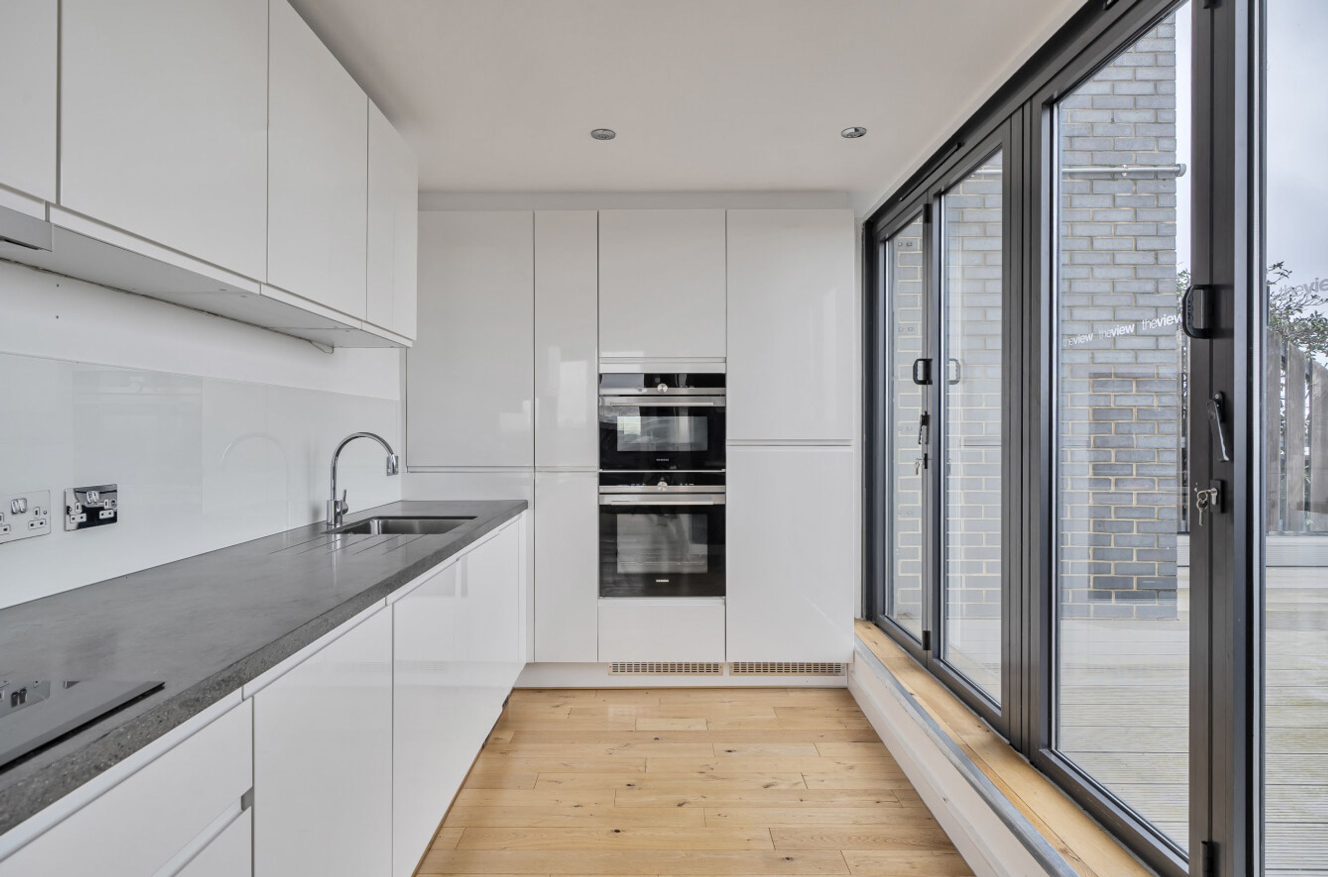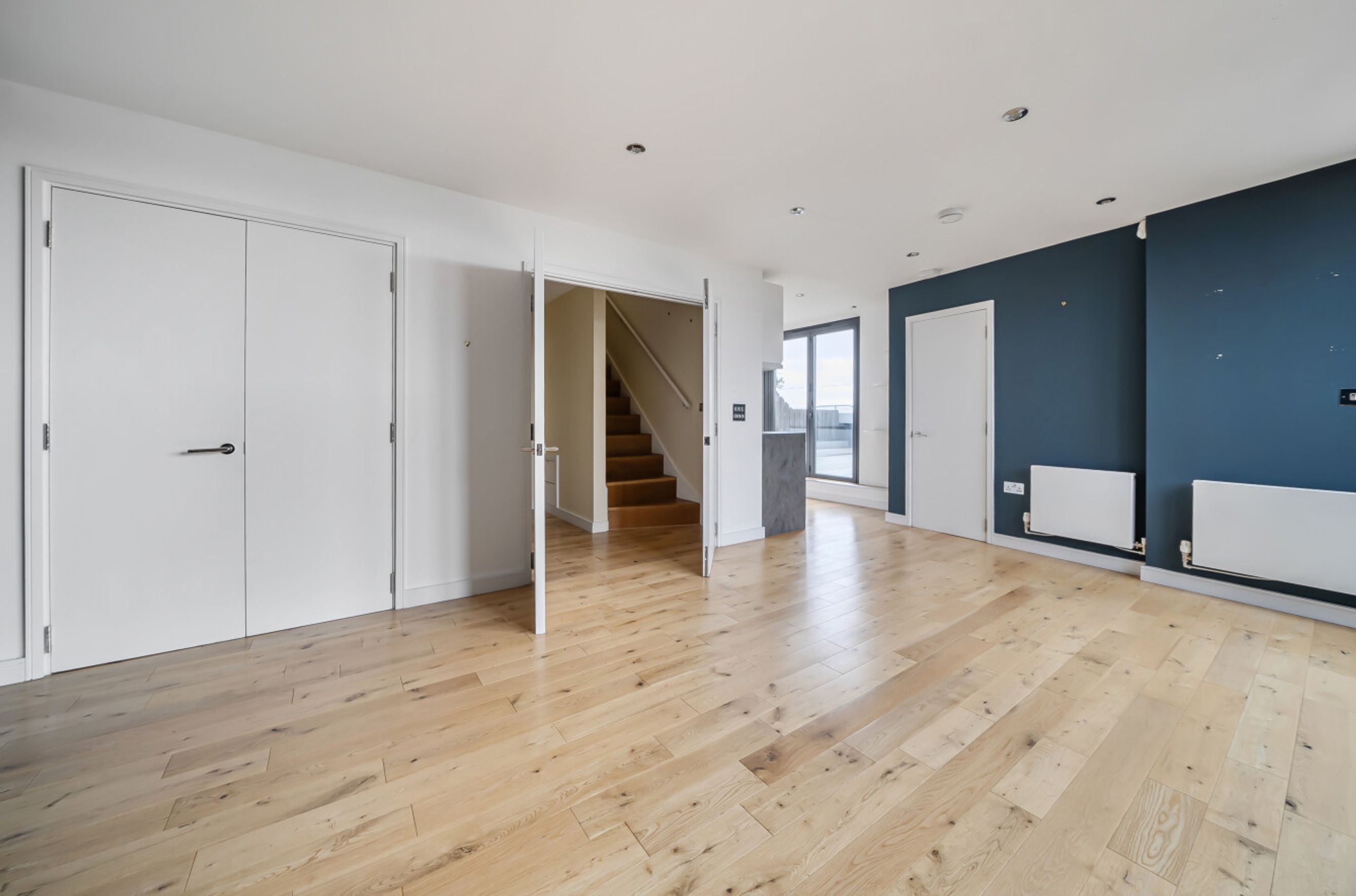 Also on this level is a separate kitchen, positioned away from the main living space for a more traditional layout. It connects conveniently to the hallway and sits adjacent to a second balcony, which adds further outdoor access and ventilation. A guest cloakroom is located off the entrance hall, and an internal staircase leads up to the private bedroom floor.