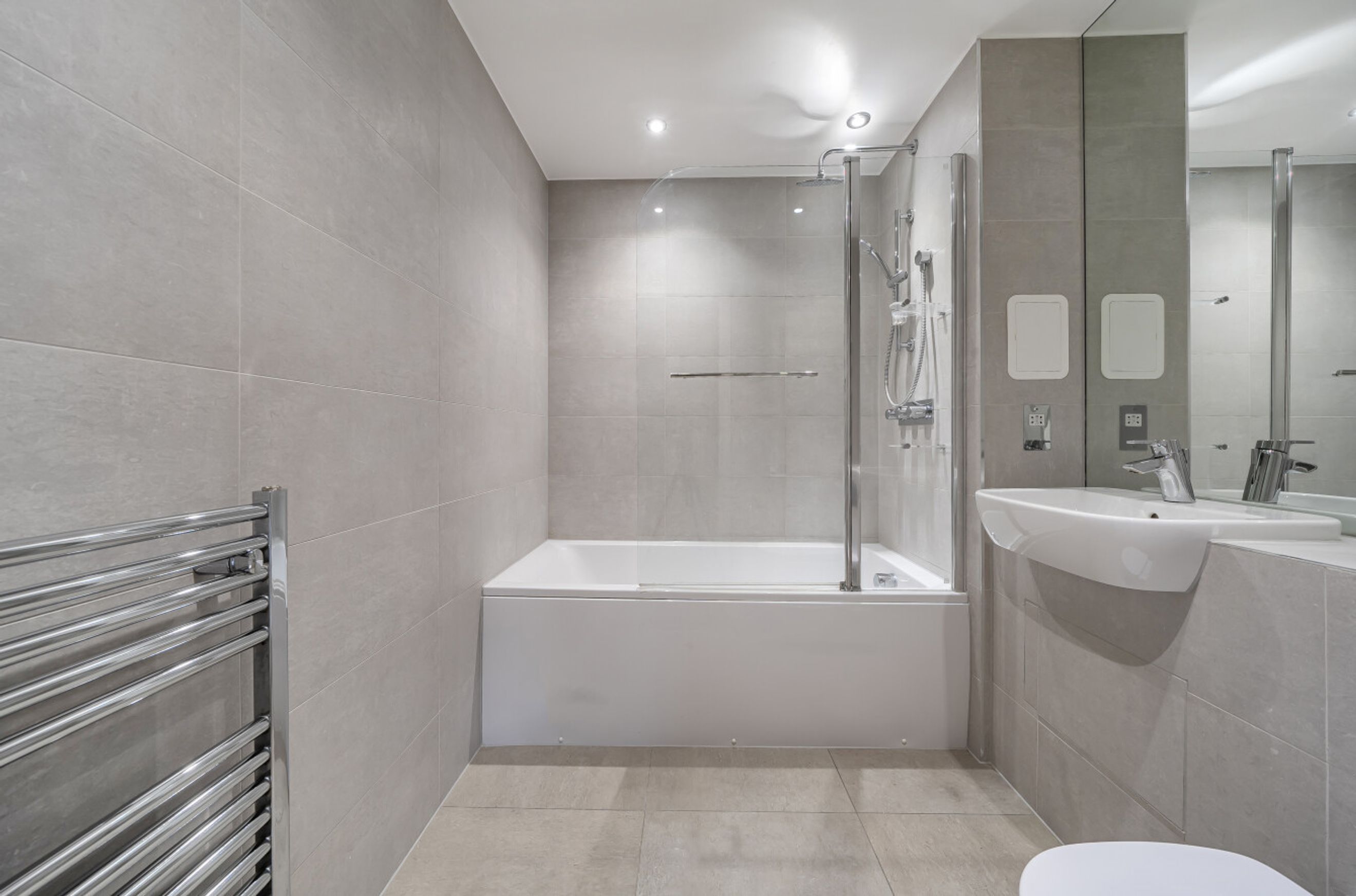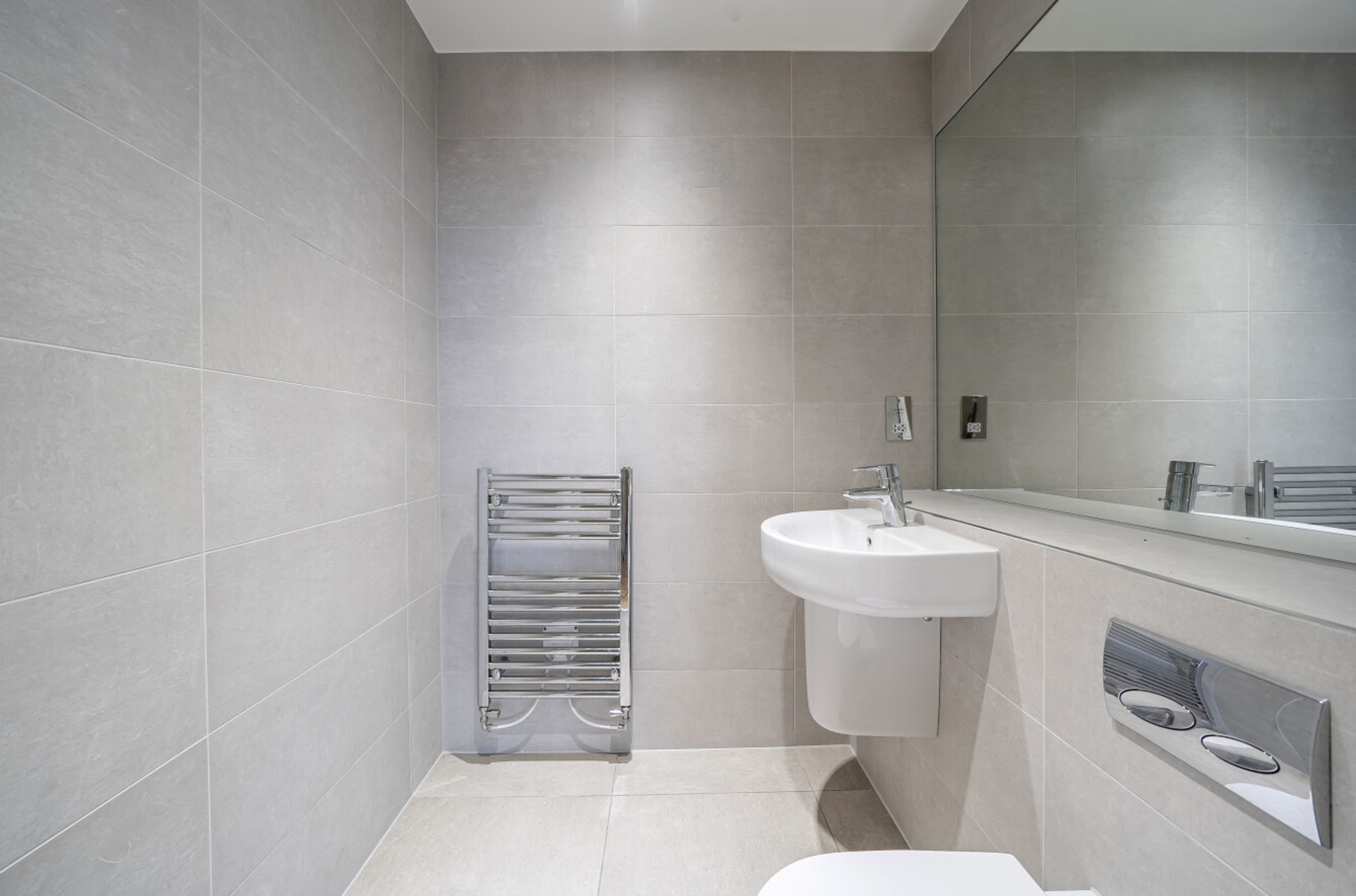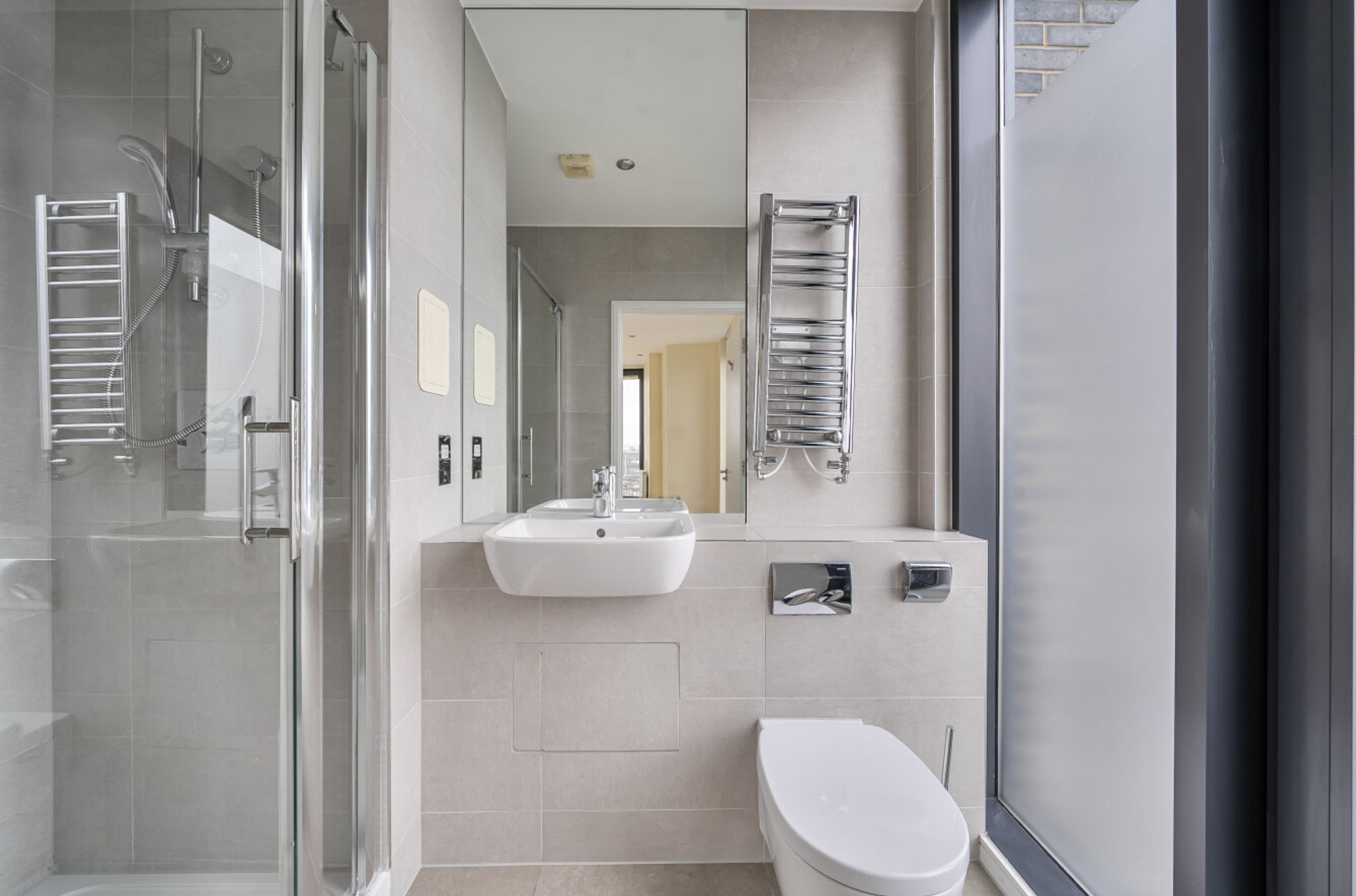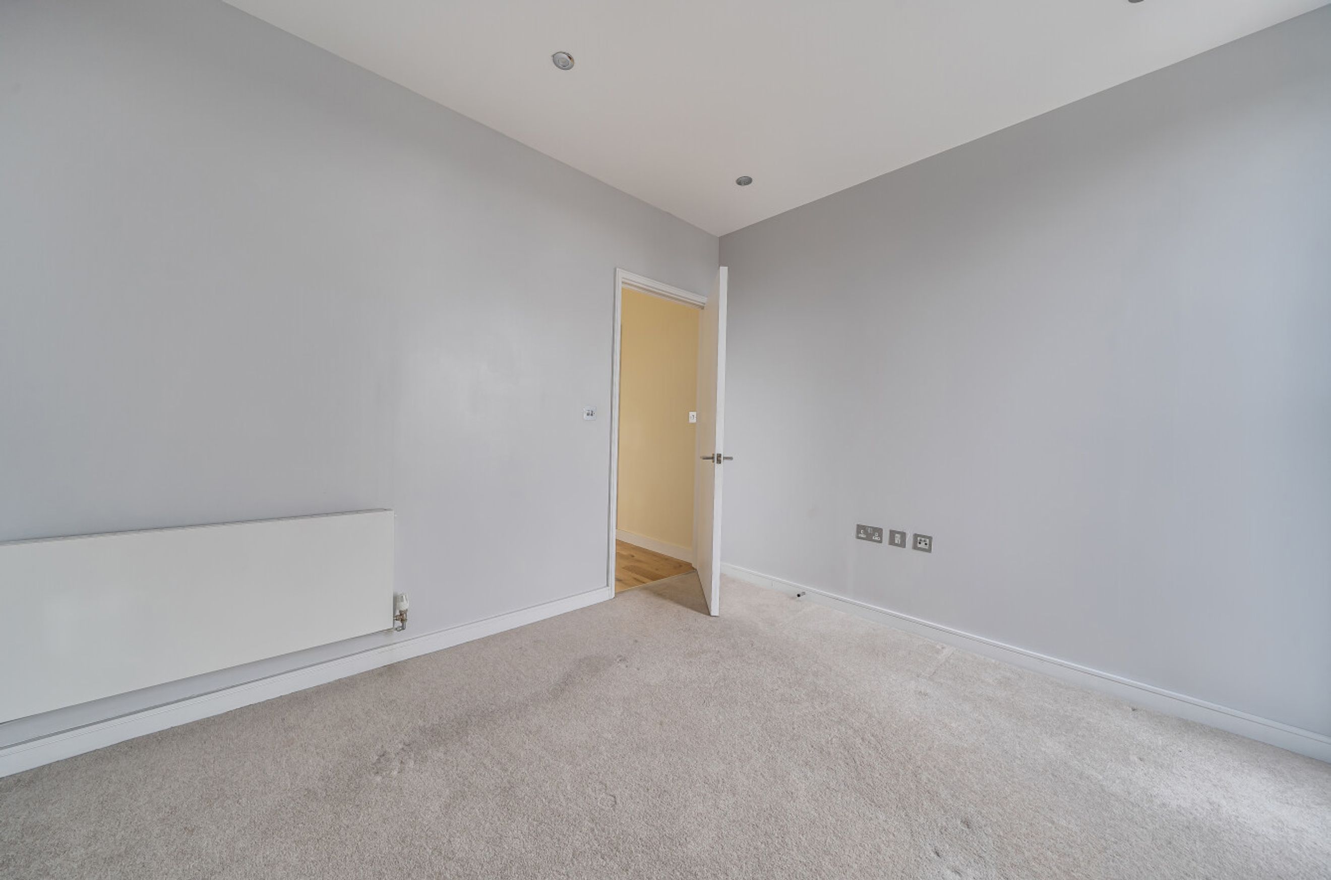The upper level is dedicated to sleeping accommodation and bathrooms. The principal bedroom occupies the outer corner of the building and follows the same angled line as the living room below, giving it a distinctive shape and good light. A second bedroom sits nearby and would work equally well as a guest room, study, or nursery. Bathrooms and storage are arranged off the landing, keeping circulation practical while maintaining privacy between rooms.