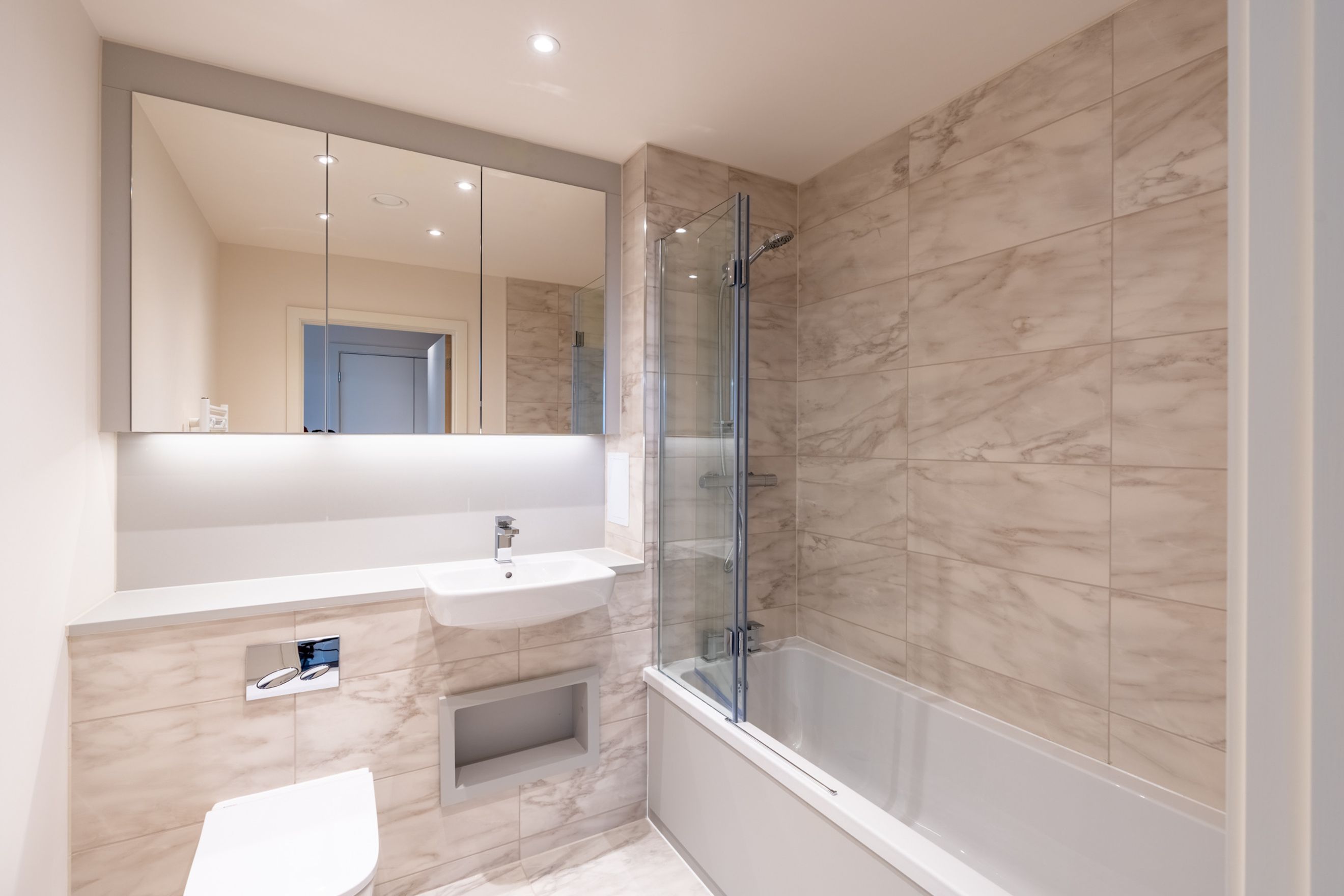 Contemporary bathroom with ceramic tiling and heated towel rail