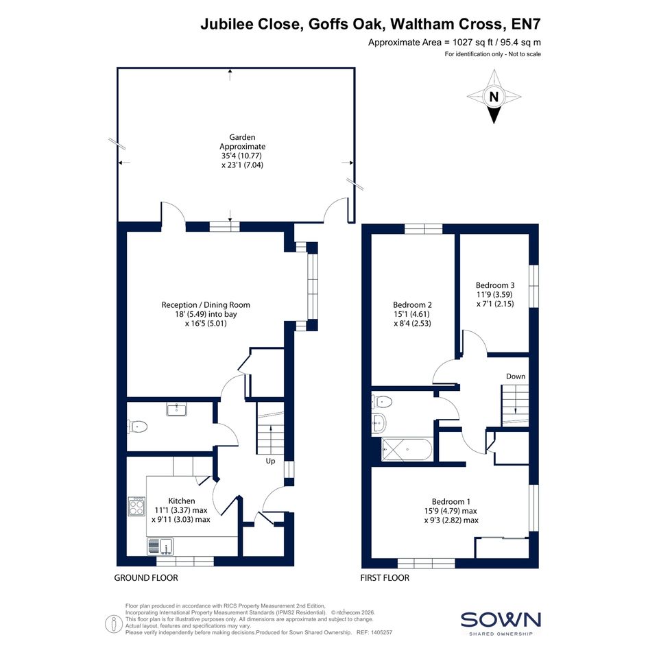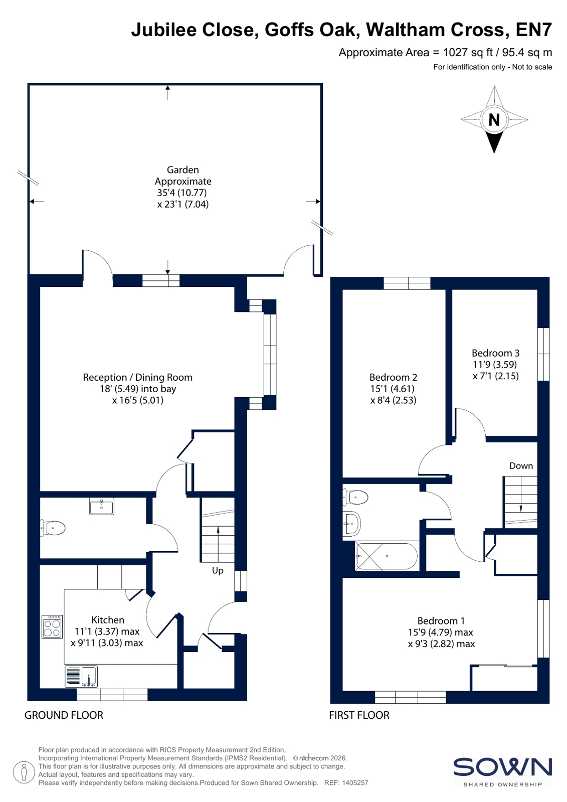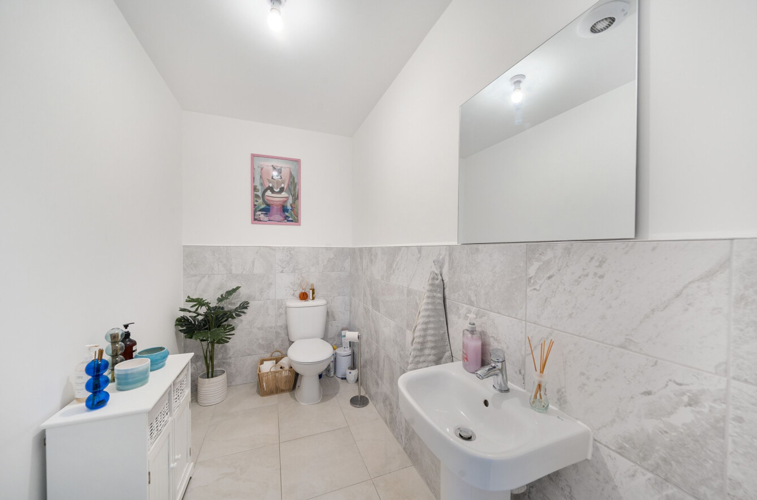 The ground floor features a bright entrance hall leading to a generous reception and dining room, providing an excellent space for both everyday living and entertaining. To the rear, doors open onto a well-proportioned garden, creating a pleasant indoor-outdoor flow. The kitchen is positioned to the front and is complemented by useful storage and a convenient ground-floor cloakroom.