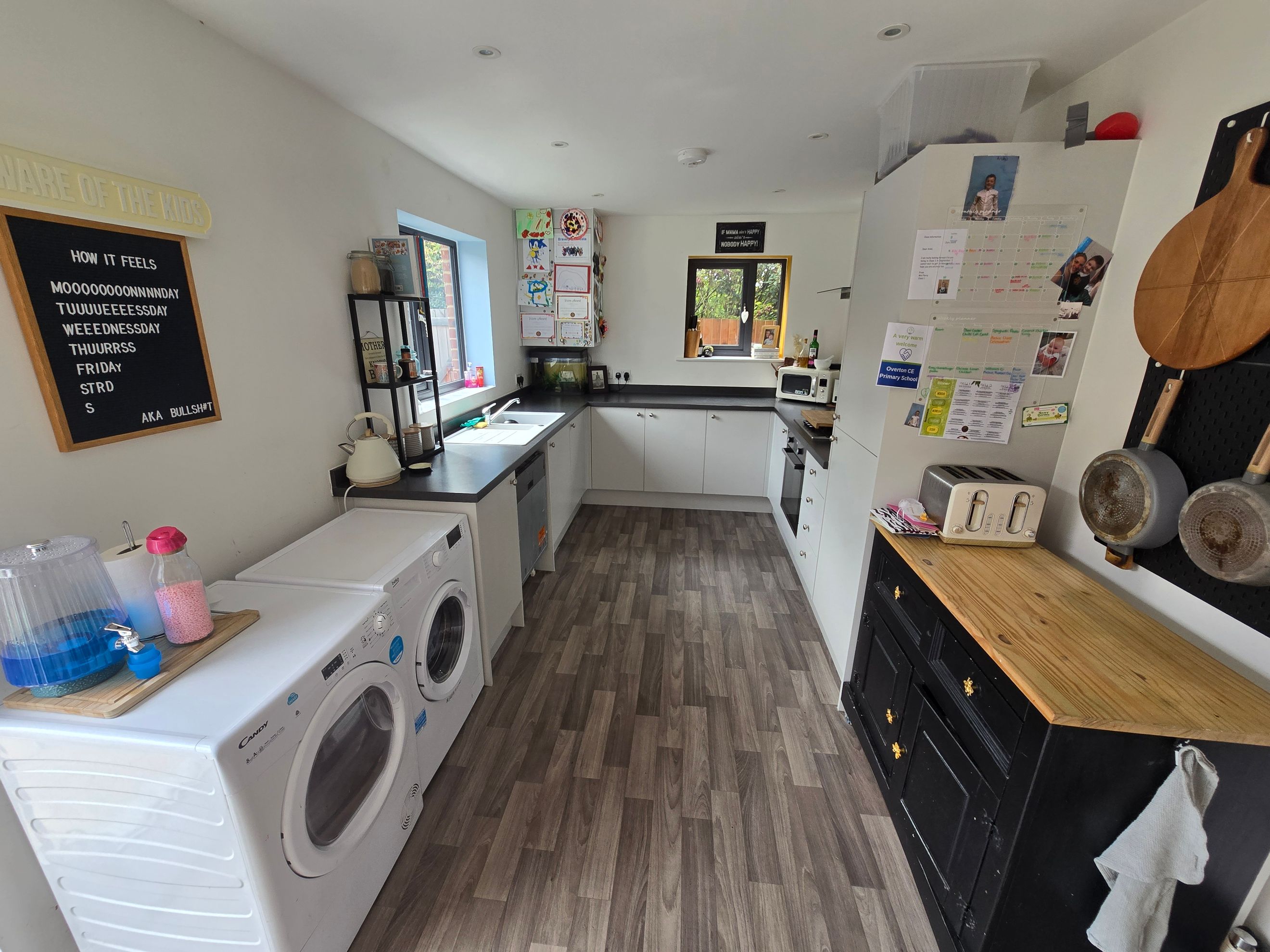 The ground floor features a bright kitchen/diner equipped with an integrated fridge freezer, oven, hob and extractor fan, providing a clean and efficient space for daily use. A separate lounge opens directly onto the private rear garden.