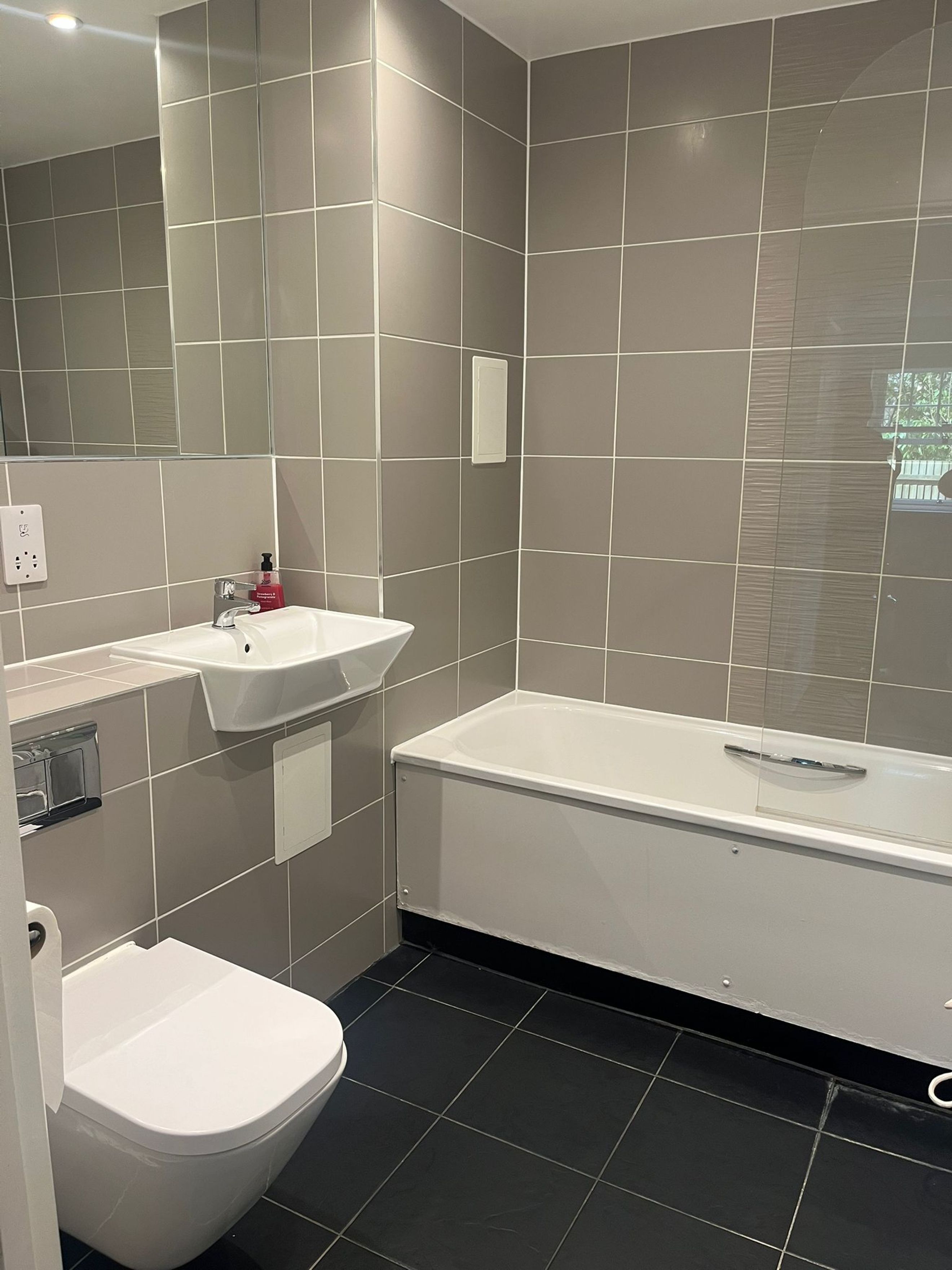 Stylish family bathroom with a modern white suite, part-tiled walls, and a bath with shower and screen