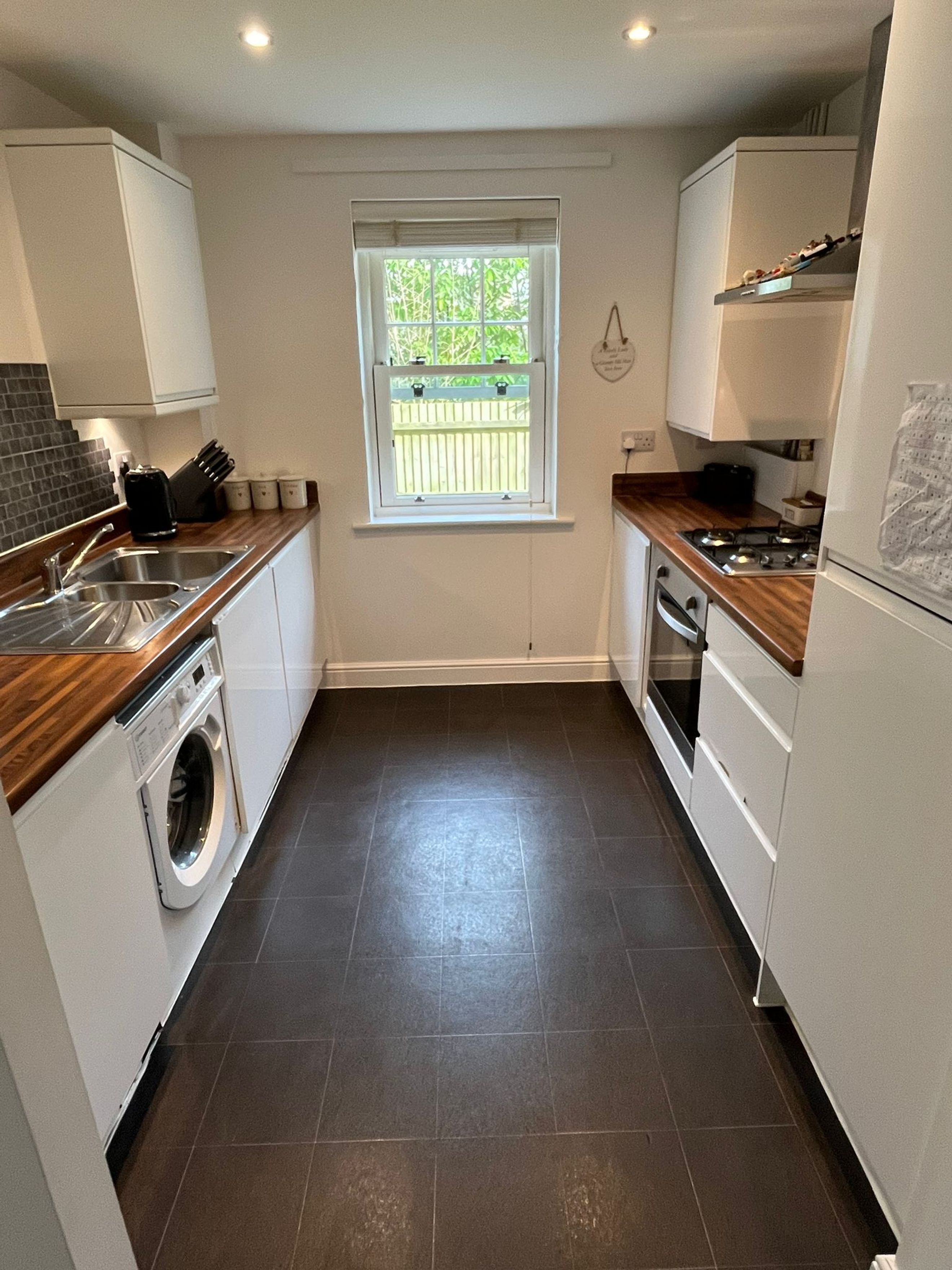 Modern kitchen with a range of base and wall units, laminate worktops, and integrated appliances
