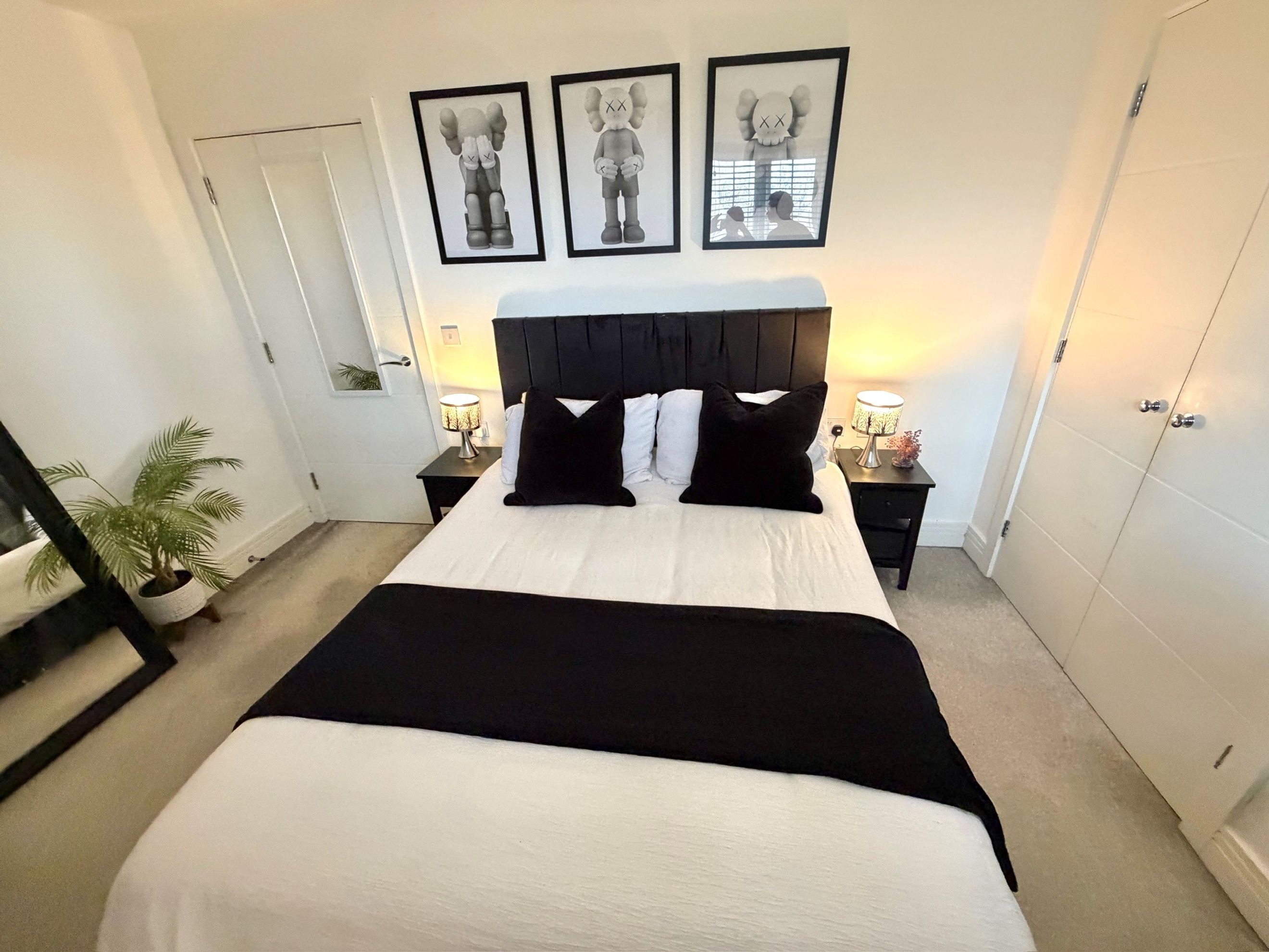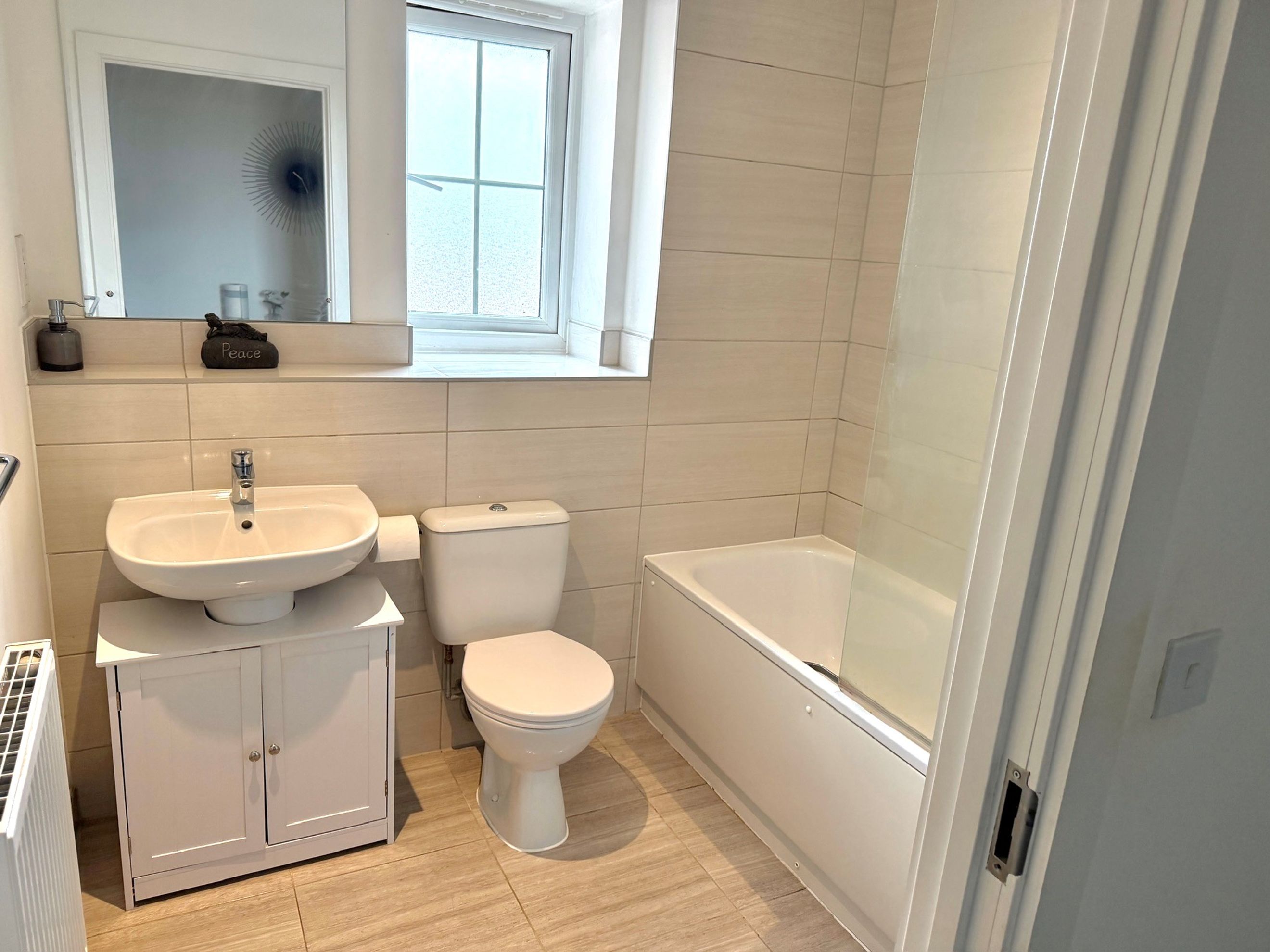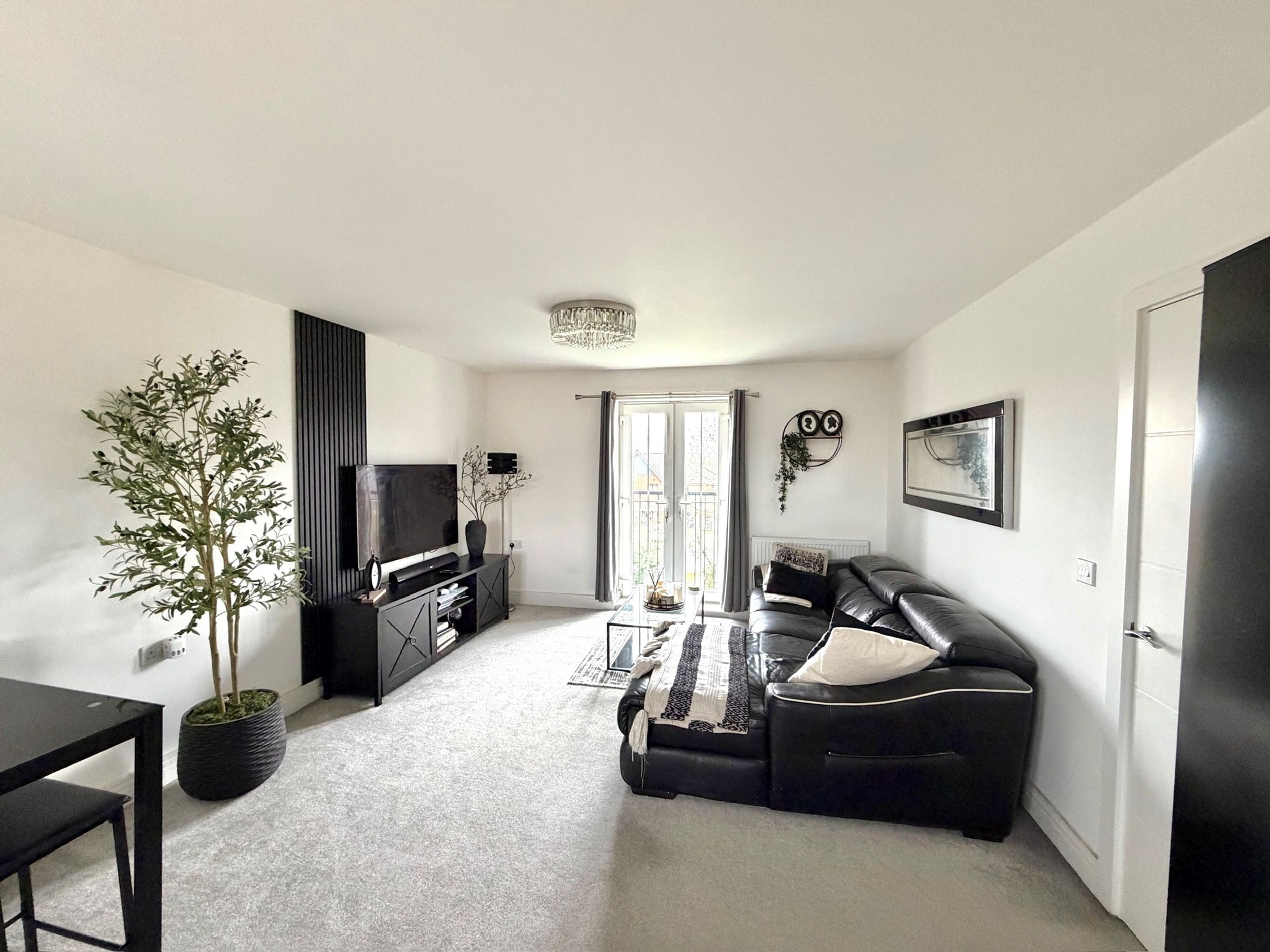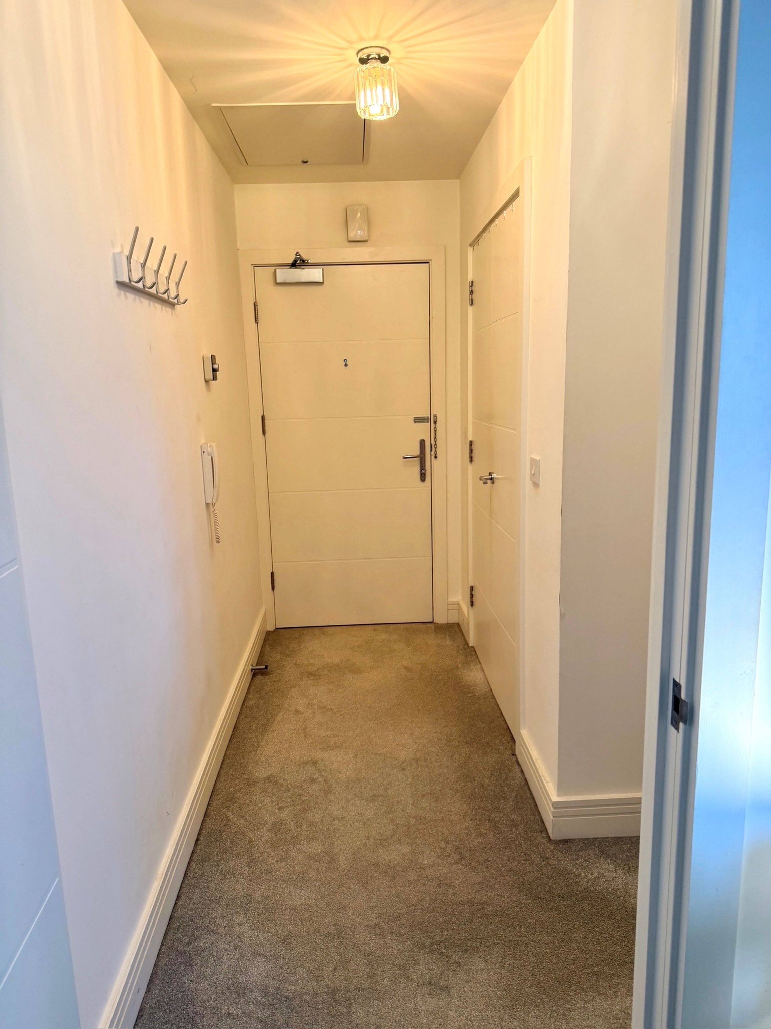 The bedroom includes a built‑in wardrobe, and there is an additional built‑in cupboard in the hallway. The bathroom is well presented, and the décor throughout is modern and neutral. The apartment comes with one allocated parking space, along with access to communal bin and bike stores.