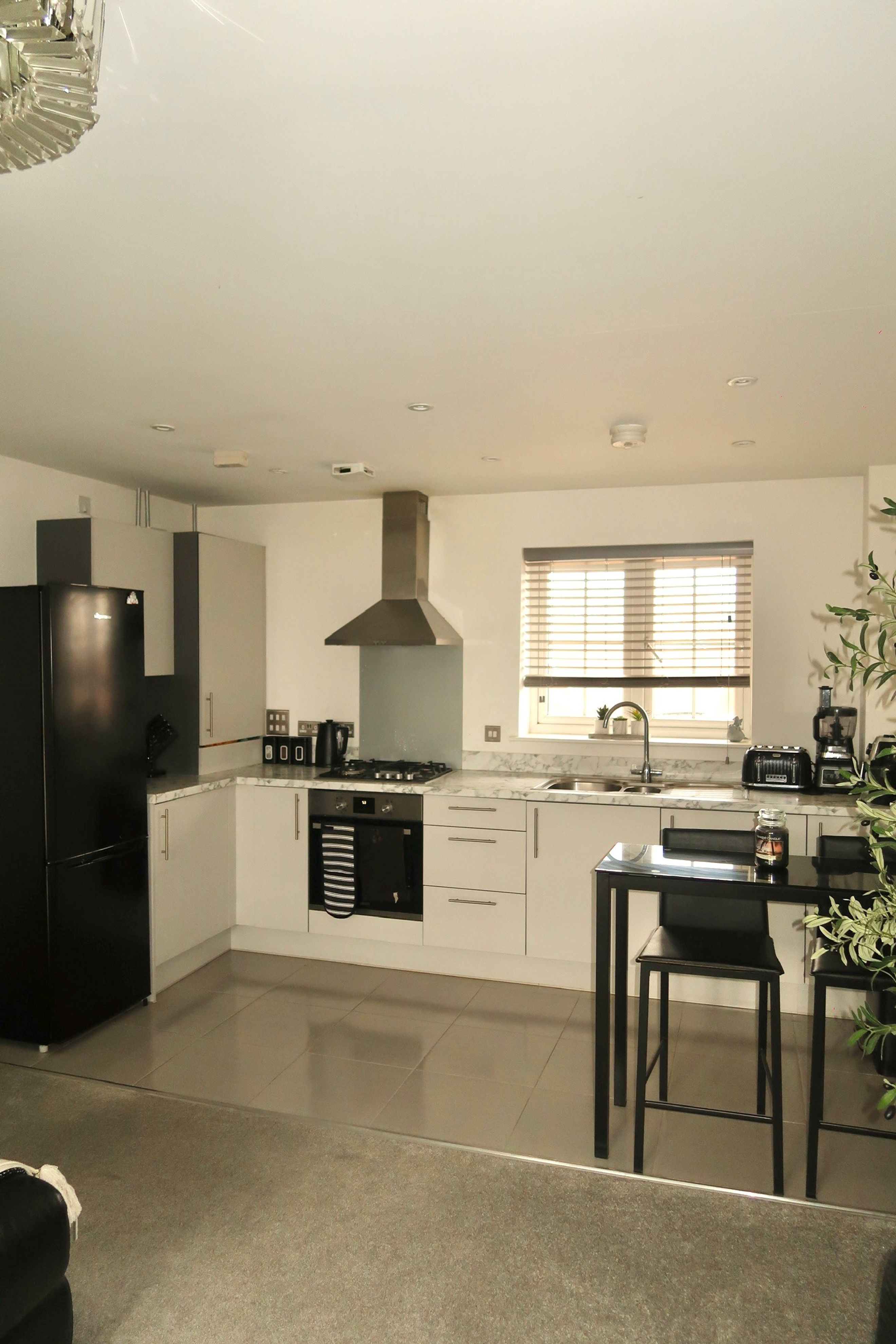 The property features an open‑plan kitchen and living area, complete with an integrated oven, hob and extractor fan, and benefits from a Juliette balcony that brings in plenty of natural light.