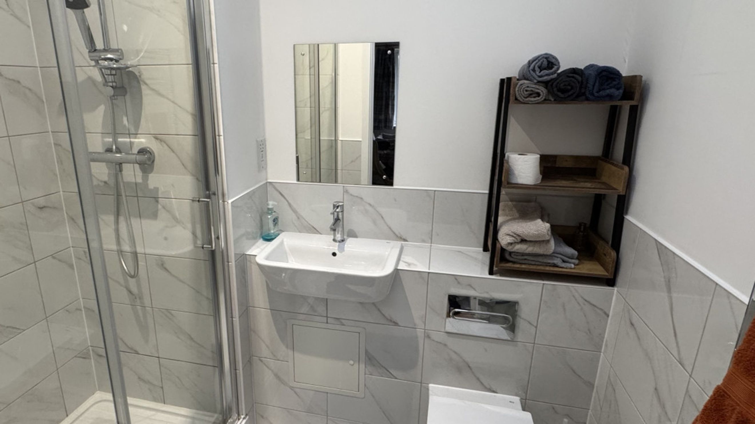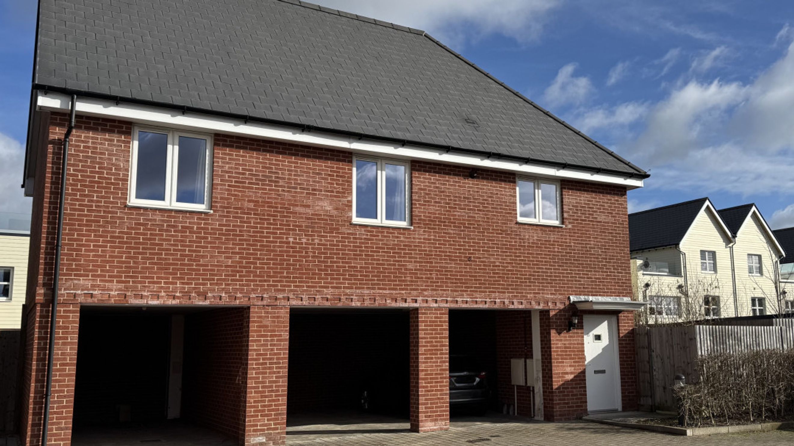 A first floor two bedroom detached coach house with a dedicated ground floor entrance, open plan kitchen, lounge and diner, master bedroom with ensuite and a bathroom.