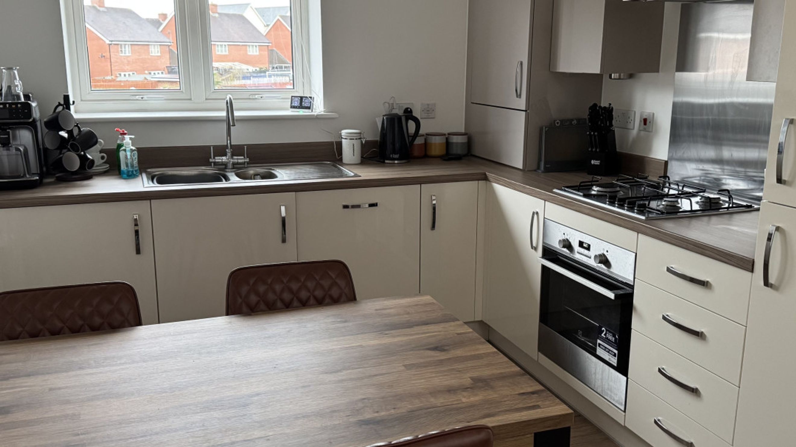 Fitted kitchen with wall and base kitchen units, Stainless steel sink and drainer. Built in appliances including dishwasher, washing machine and fridge-freezer.