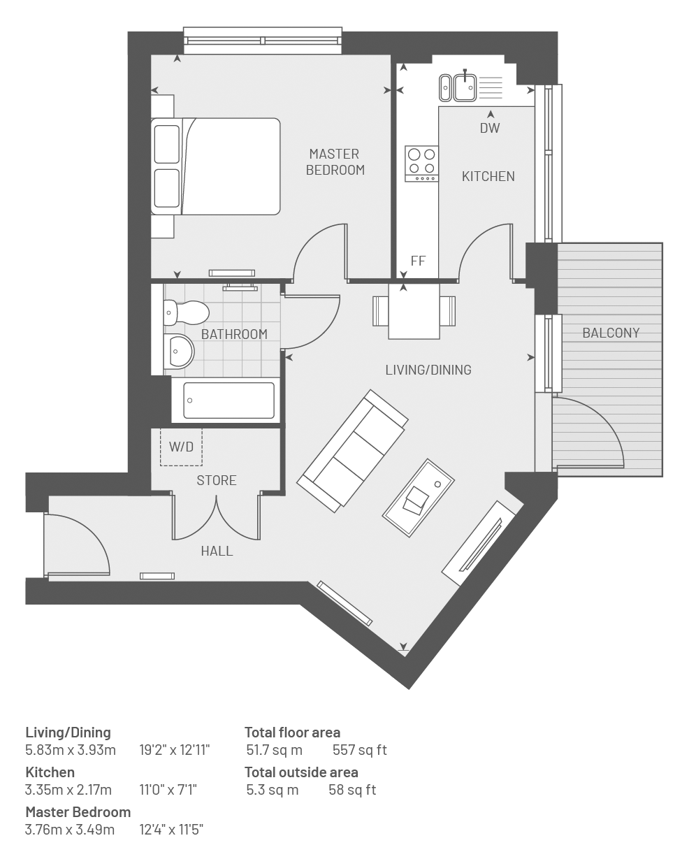 Plot 017- The Beech,1 bed,1 bath, with balcony - 557 sq. ft