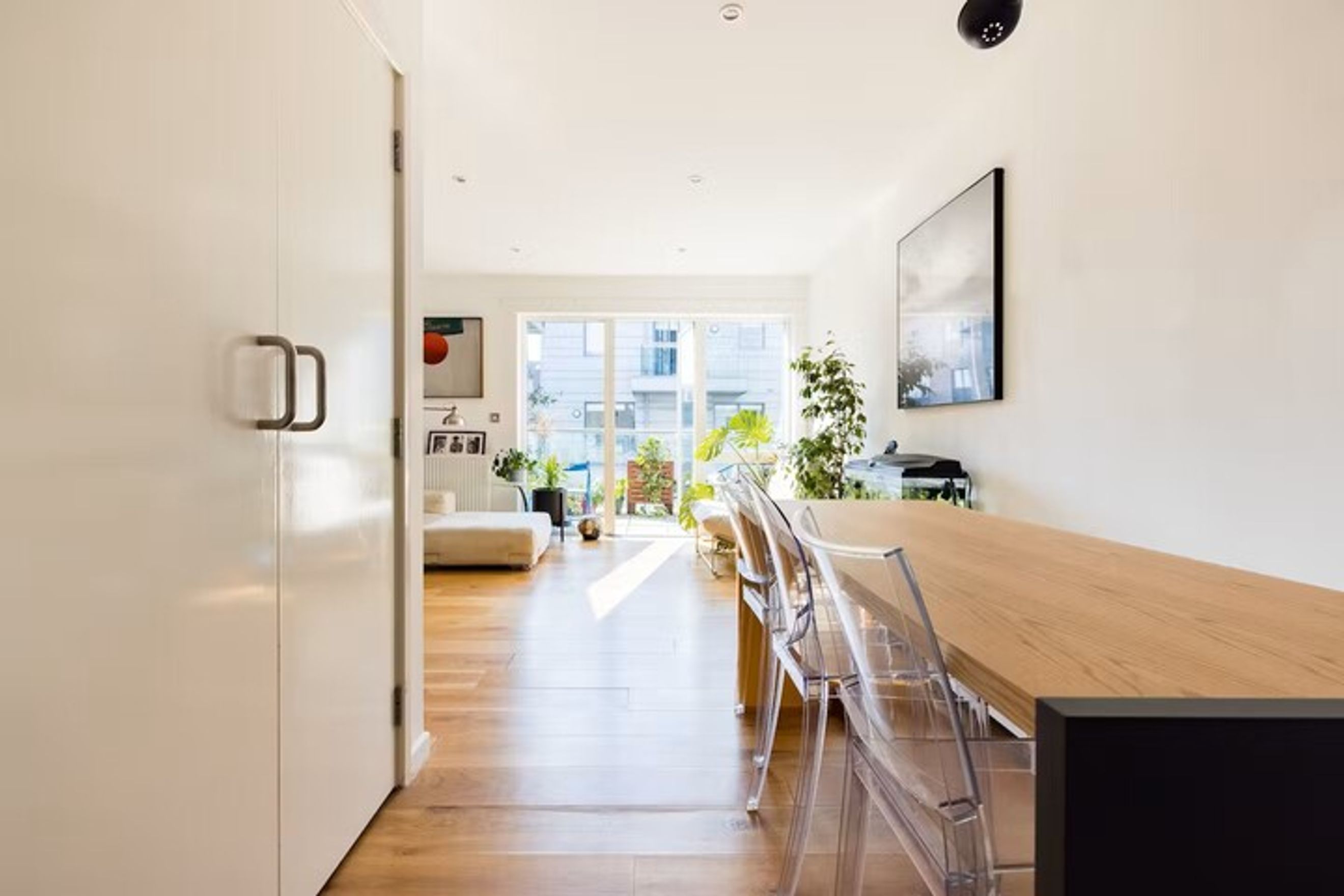This contemporary home features 2 well-proportioned, south-facing bedrooms, both enjoying excellent natural light throughout the day, and an open-plan living area with floor-to-ceiling windows. The living space benefits from both south and west-facing aspects, allowing sunlight to move through the room from late morning into the evening. The sleek kitchen comes complete with integrated appliances. The master bedroom includes a fitted wardrobe for added convenience.