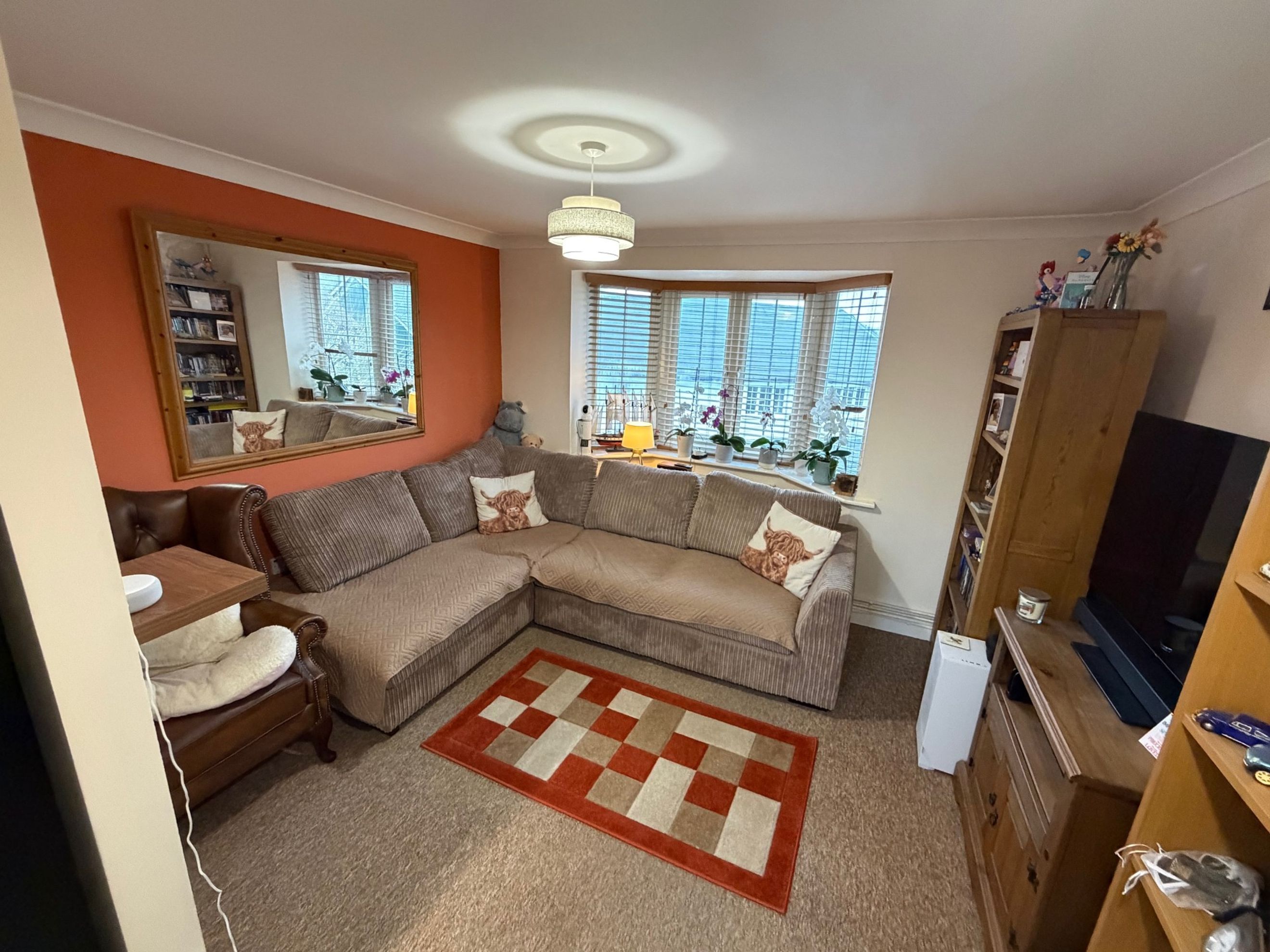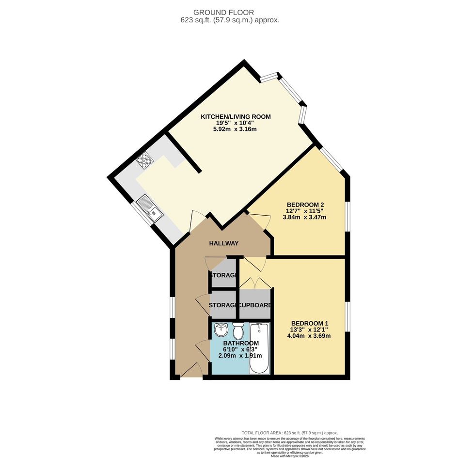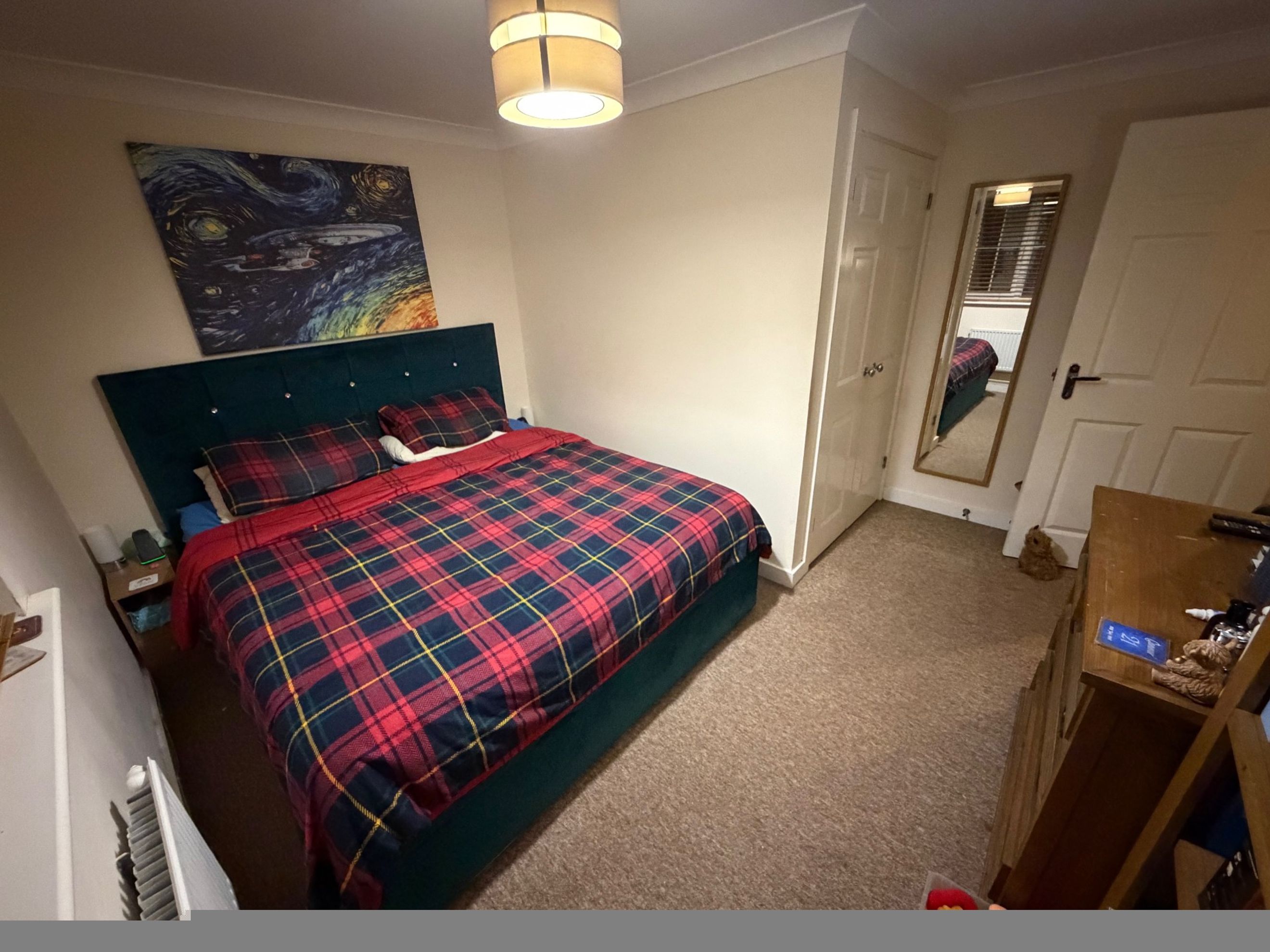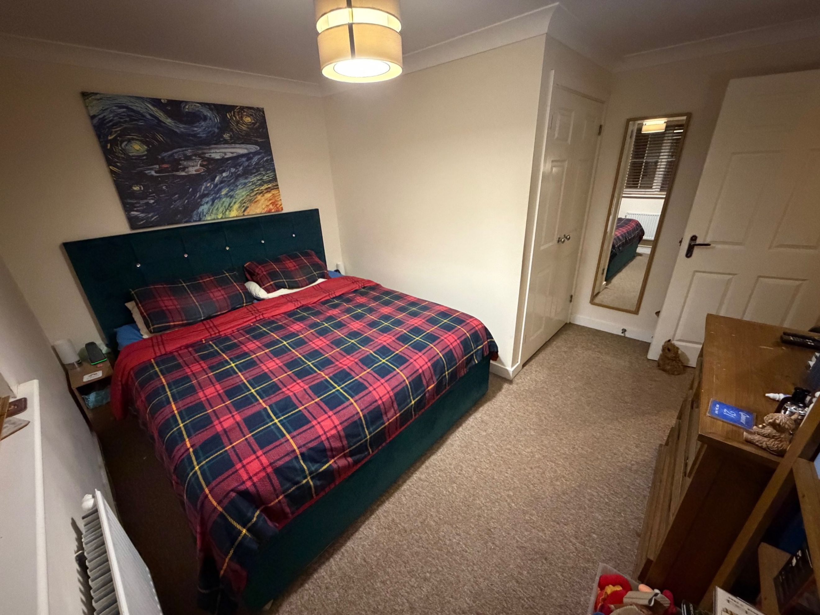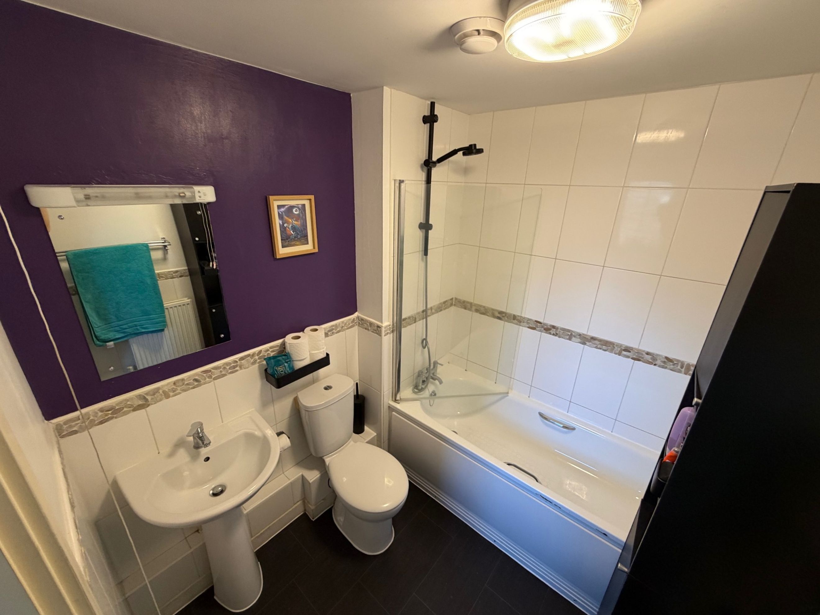 Both bedrooms are good‑sized doubles, with the main bedroom benefiting from a large built‑in storage cupboard. The bathroom features a modern three‑piece suite with a shower over the bath.