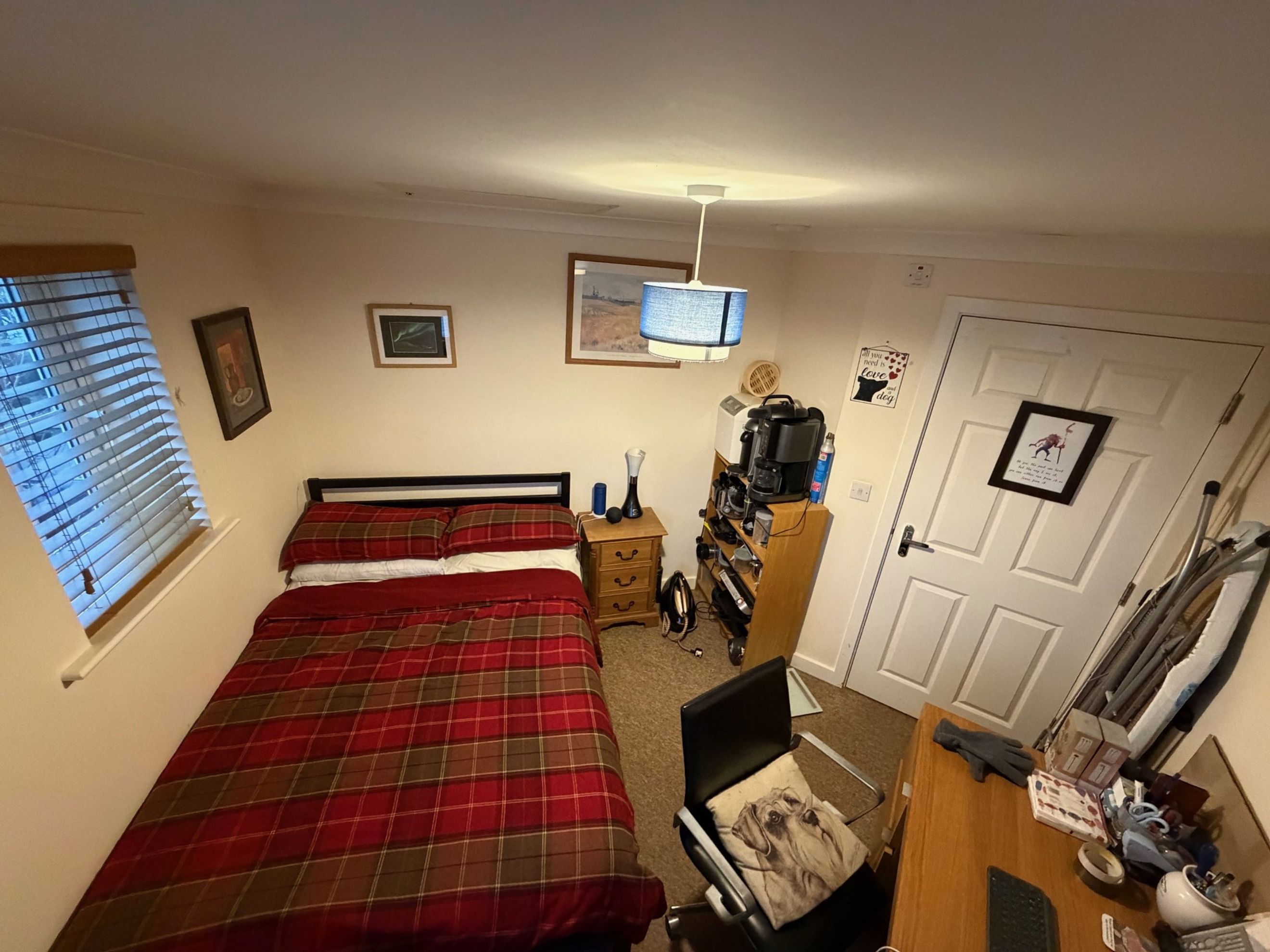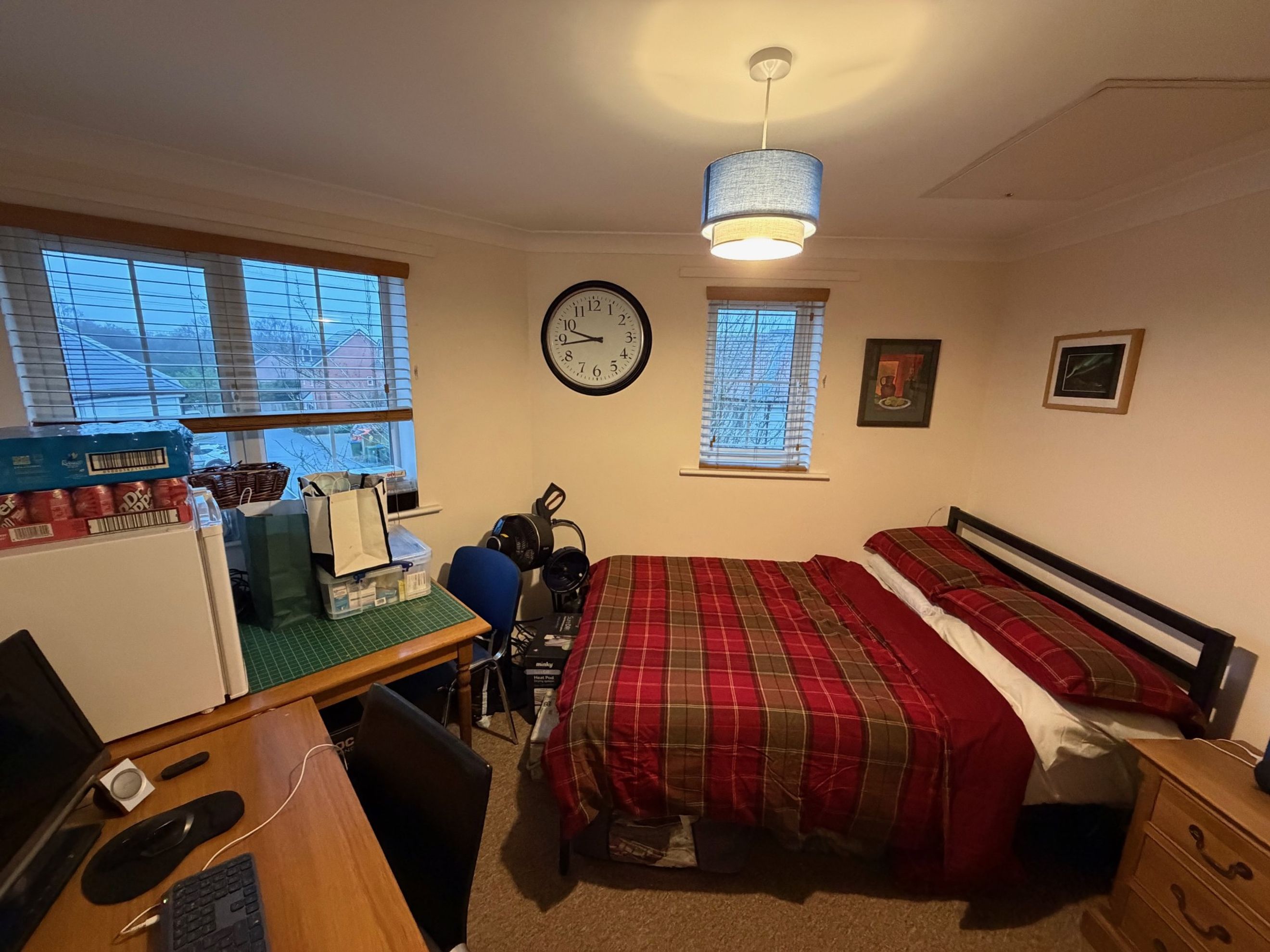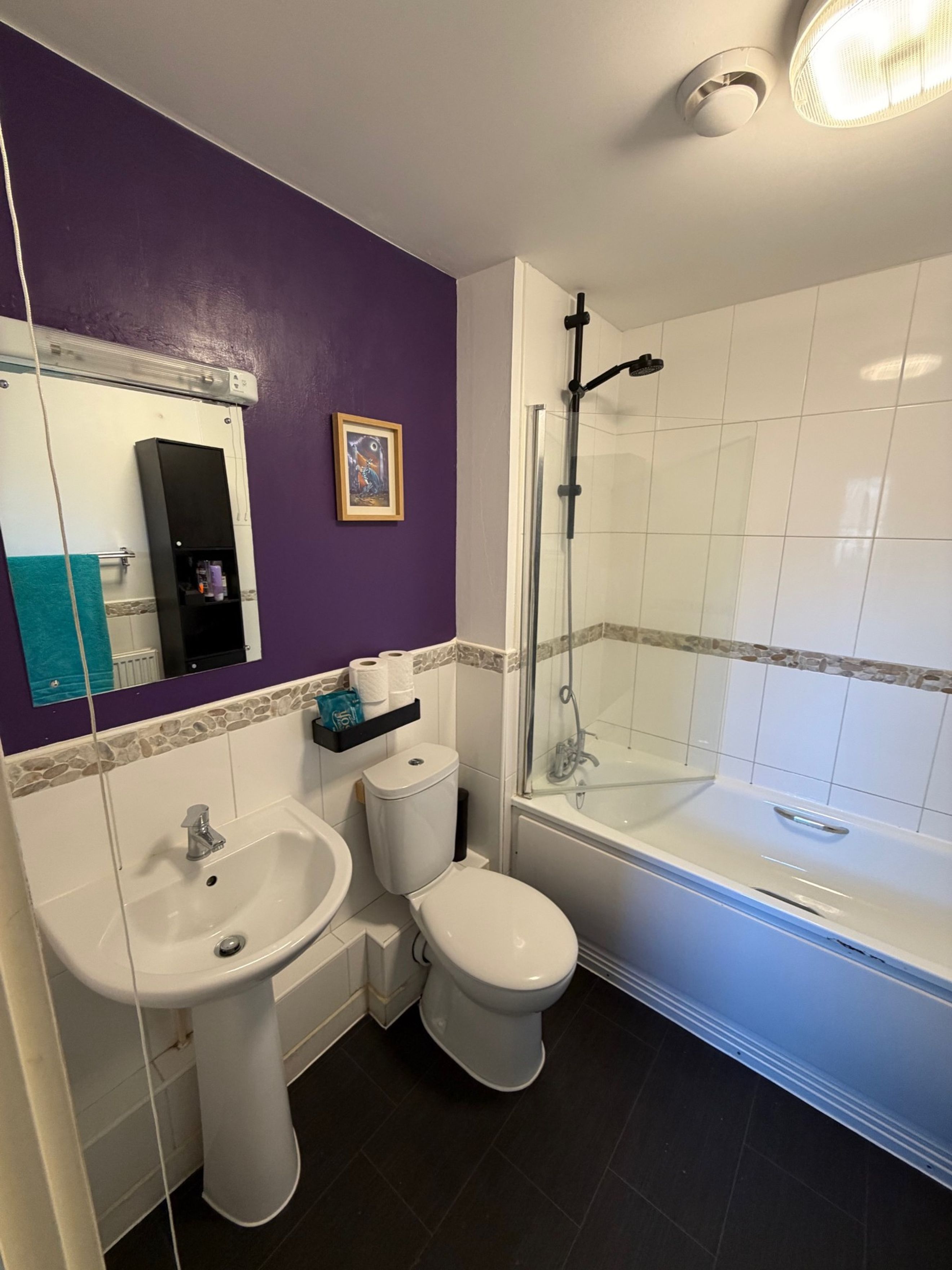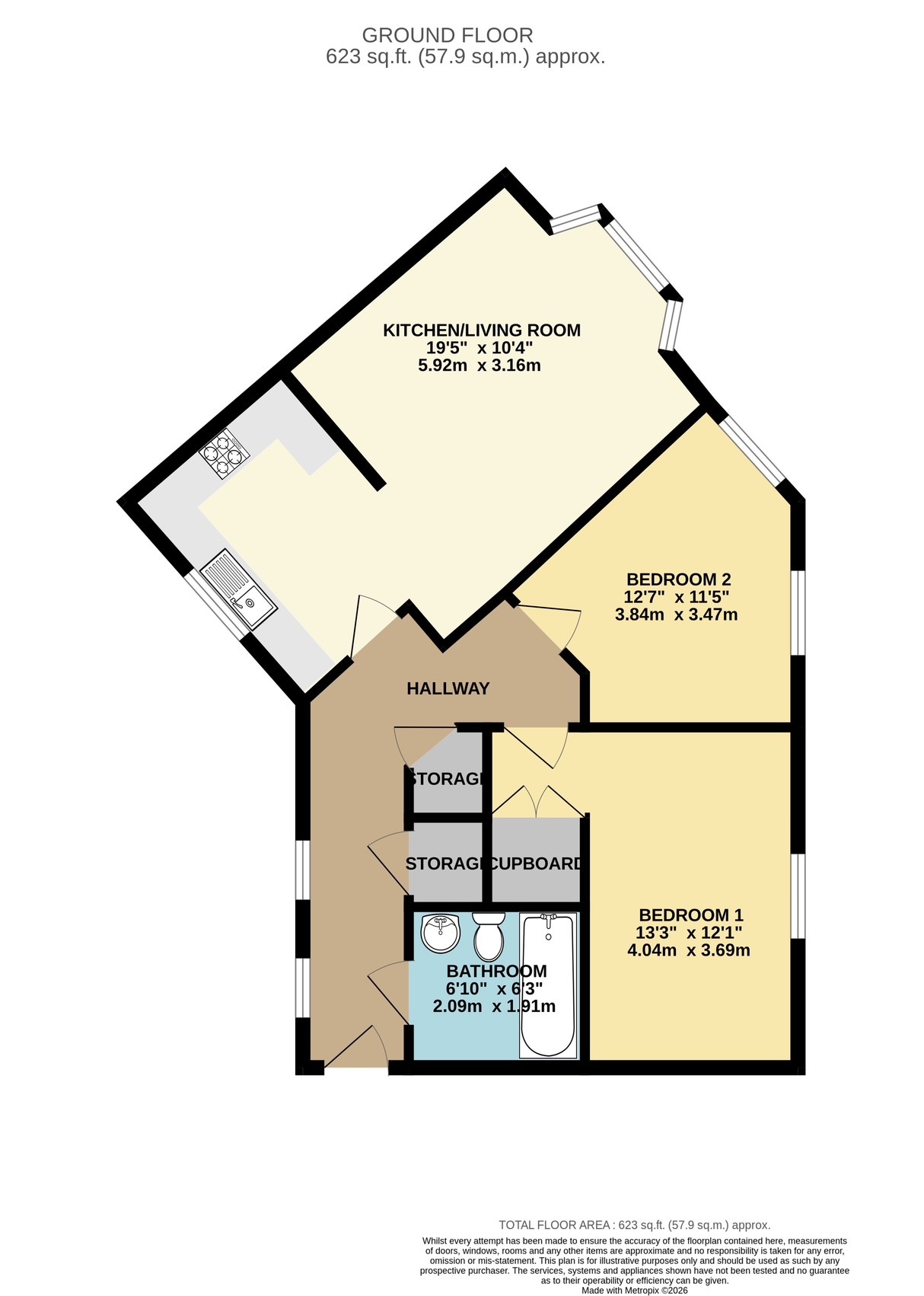 Both bedrooms are good‑sized doubles, with the main bedroom benefiting from a large built‑in storage cupboard. The bathroom features a modern three‑piece suite with a shower over the bath.