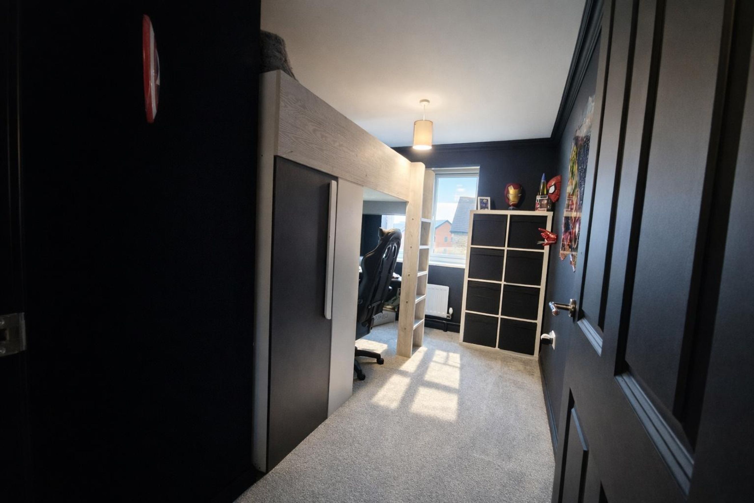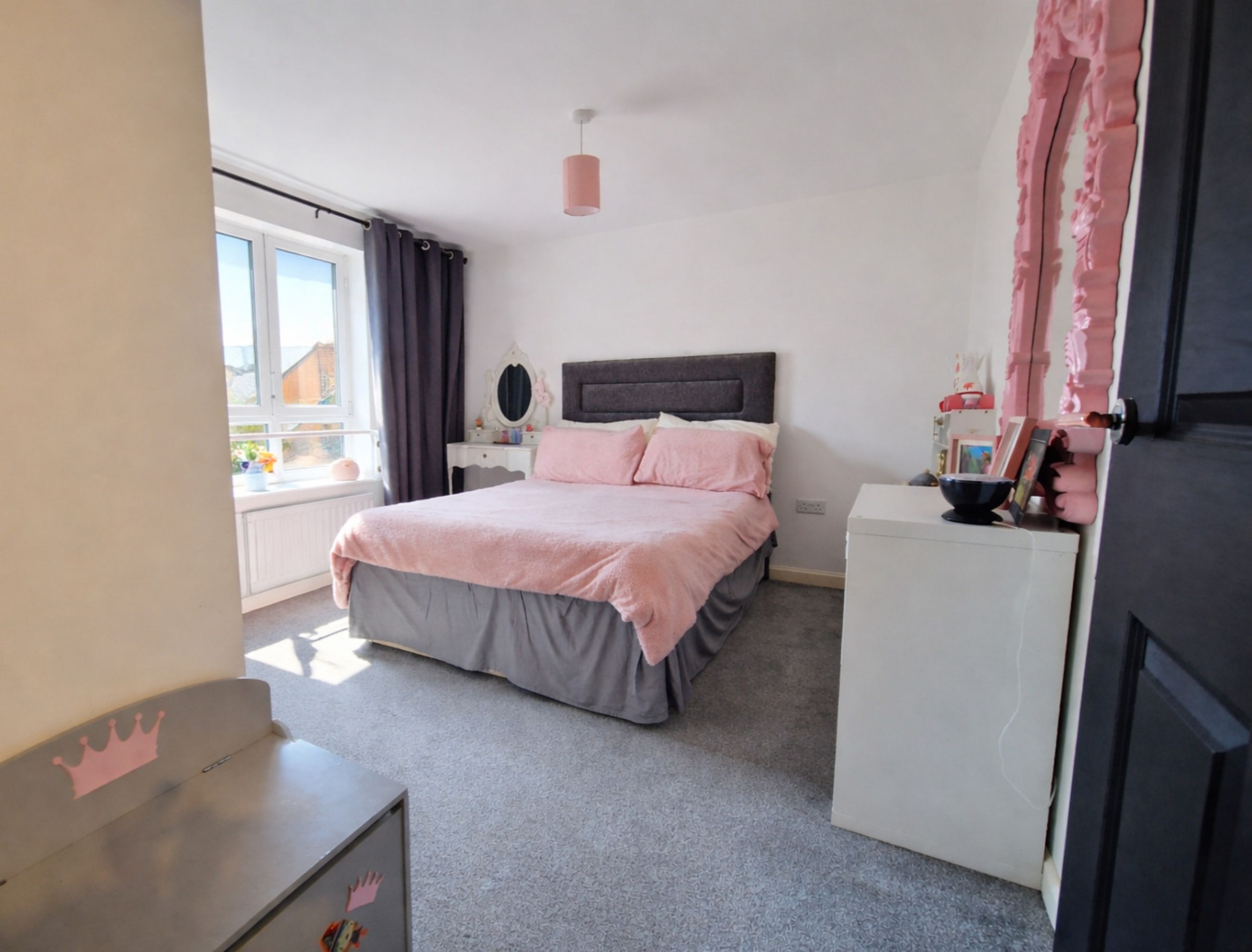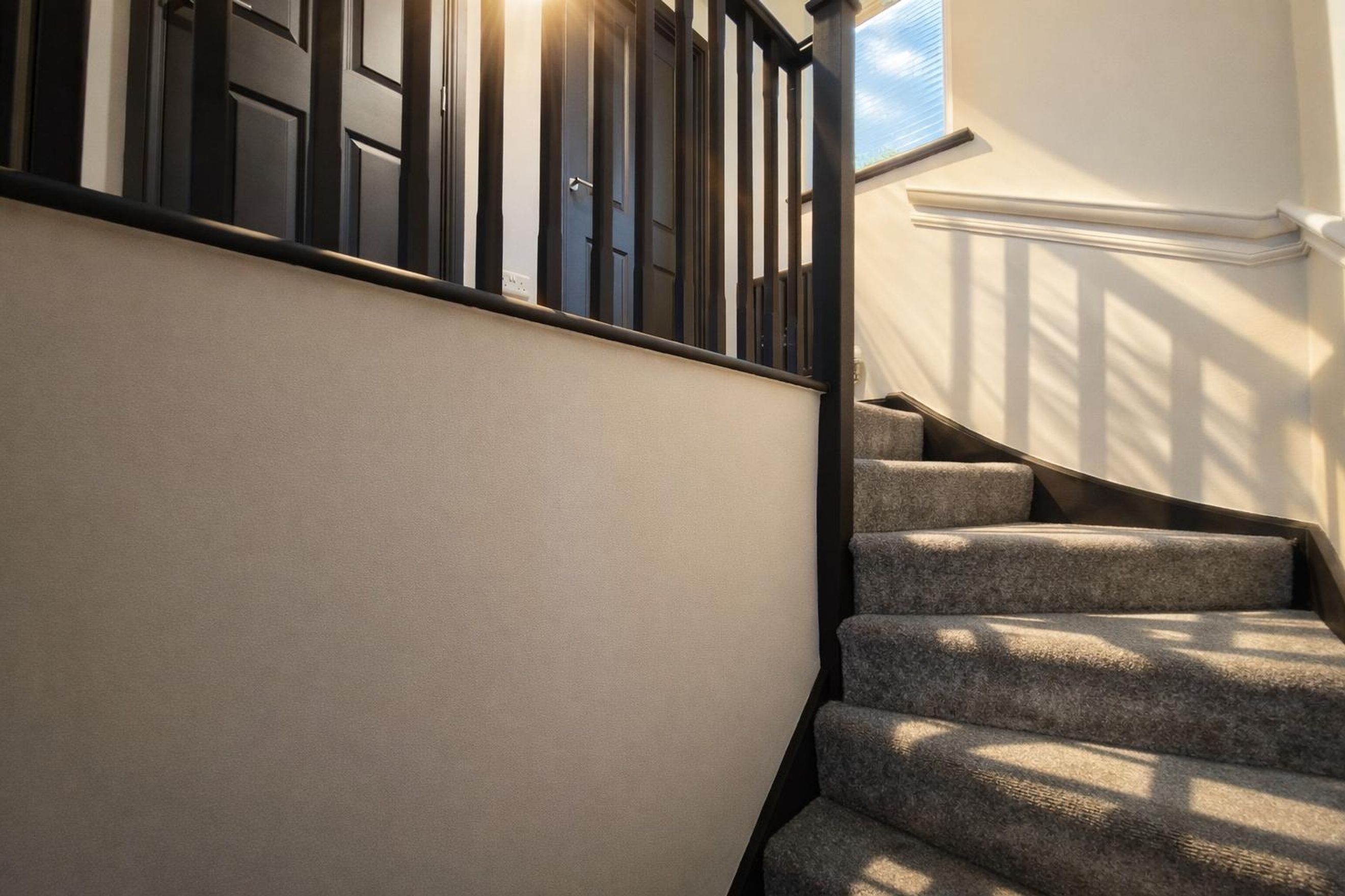 Upstairs, the master bedroom includes an ensuite and a walk‑in wardrobe/dressing room. The second bedroom features a built‑in wardrobe, and there is a further landing cupboard for additional storage. The family bathroom serves the remaining bedrooms and is finished to a high standard.