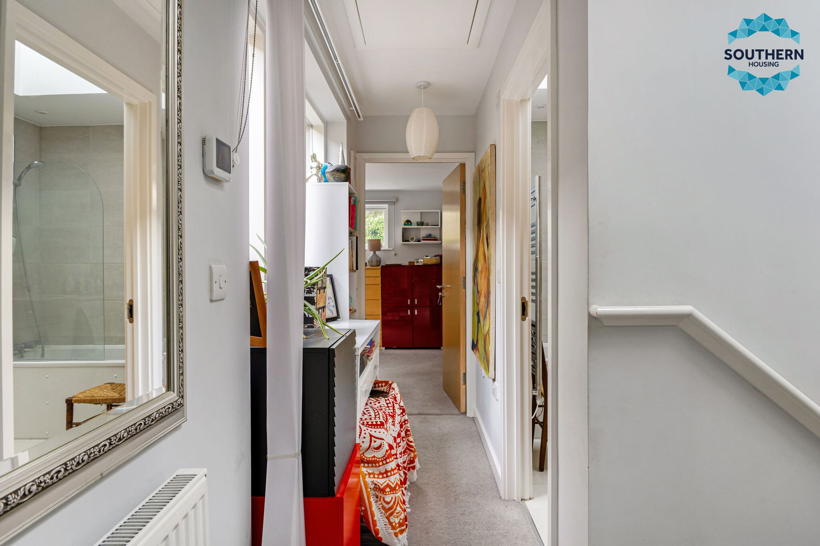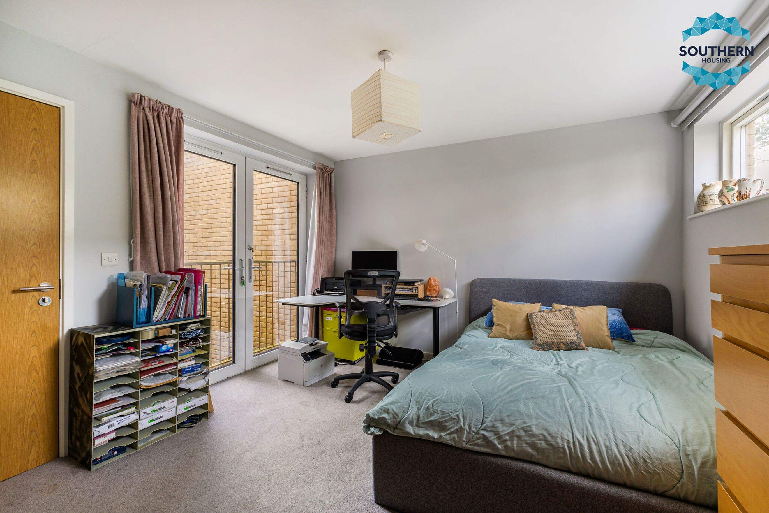 Upstairs, the master bedroom is generously sized, easily accommodating all your furniture needs. It benefits from a double fitted wardrobe and a private en‑suite bathroom. Natural light floods the room through the Juliet balcony, creating a bright and airy feel. The second bedroom is also spacious and enjoys the added feature of its own private balcony. The third bedroom, located downstairs off the hallway, is equally versatile and a good size.