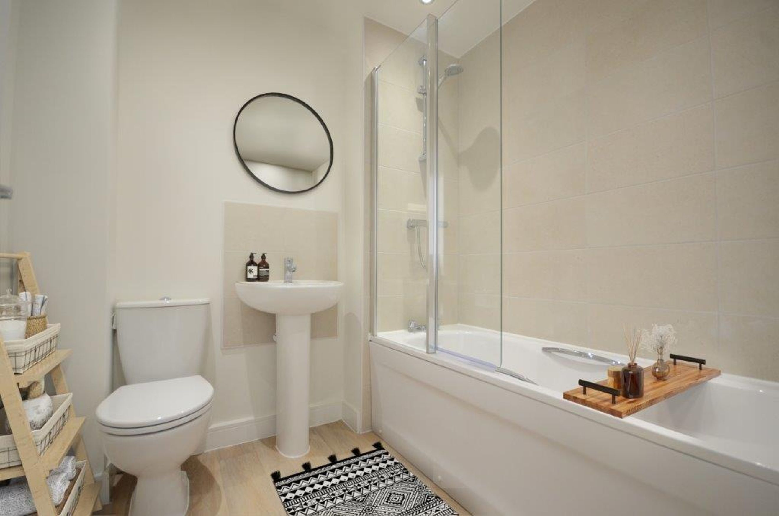 The first floor gives access to two bedrooms all with large windows for natural light. Here you can also find the three piece bathroom with shower over bath & further storage.