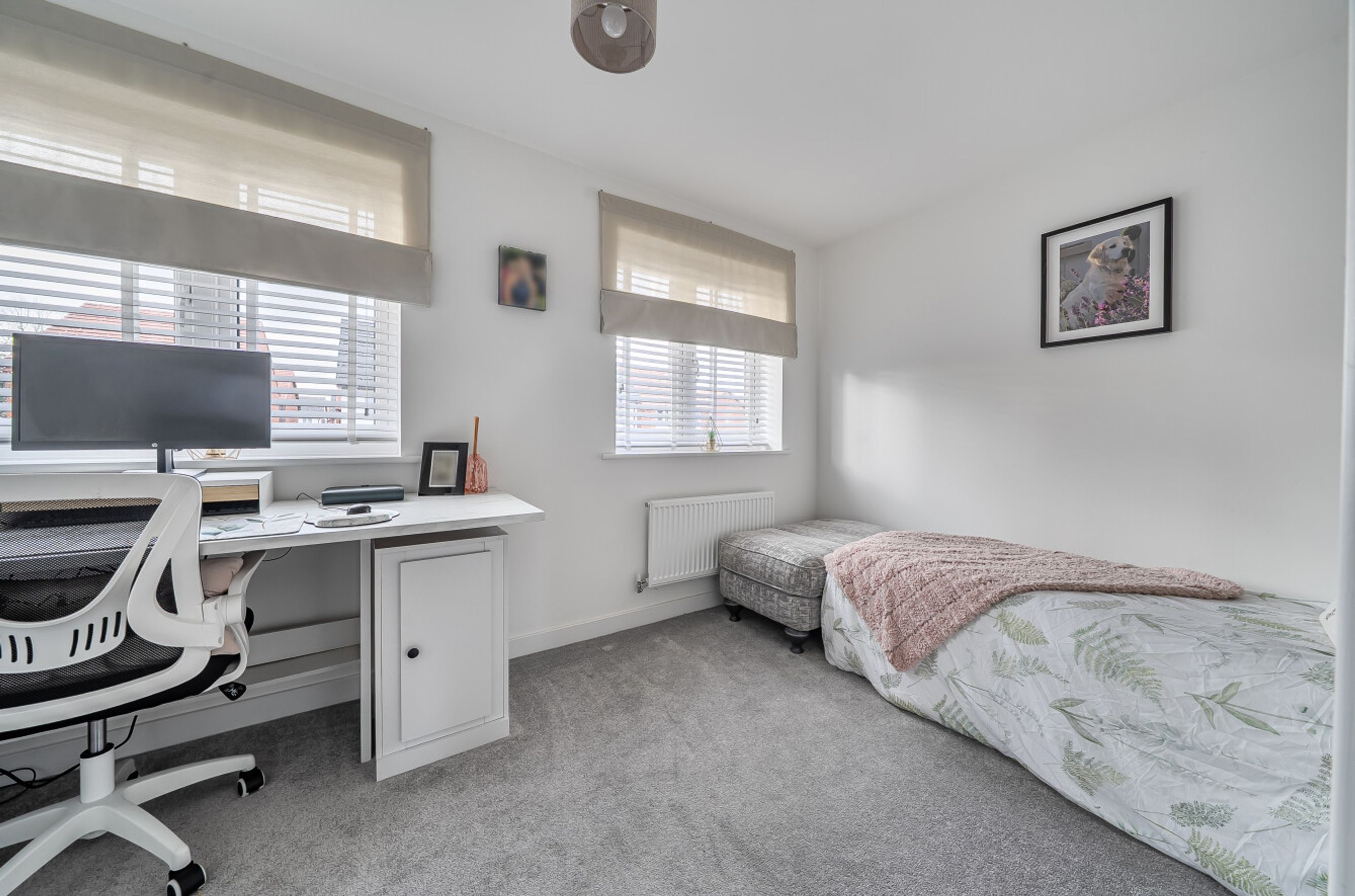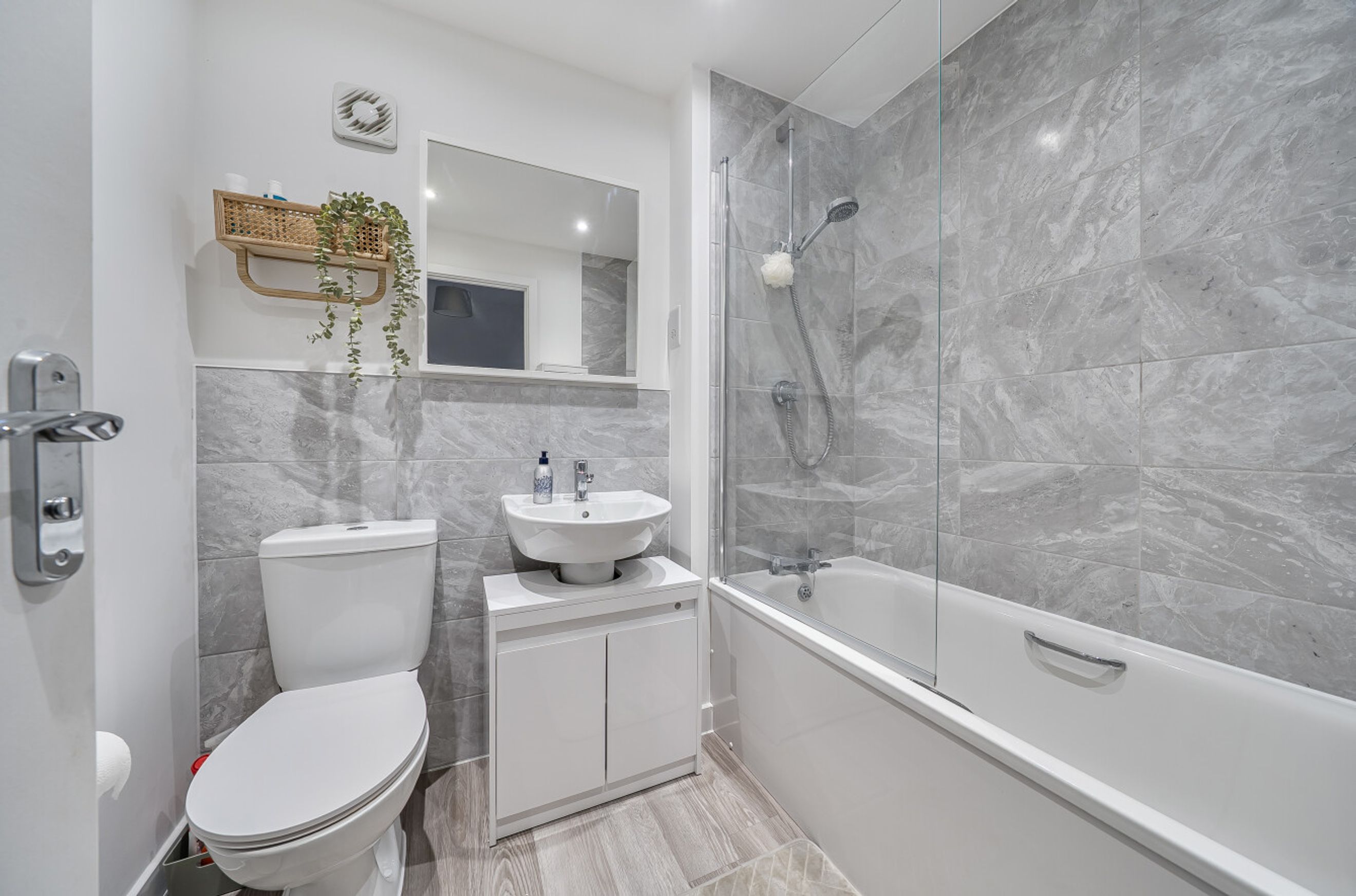 Upstairs, there are two comfortable bedrooms. The bathroom has a modern, white suite. You'll also have two parking spaces.