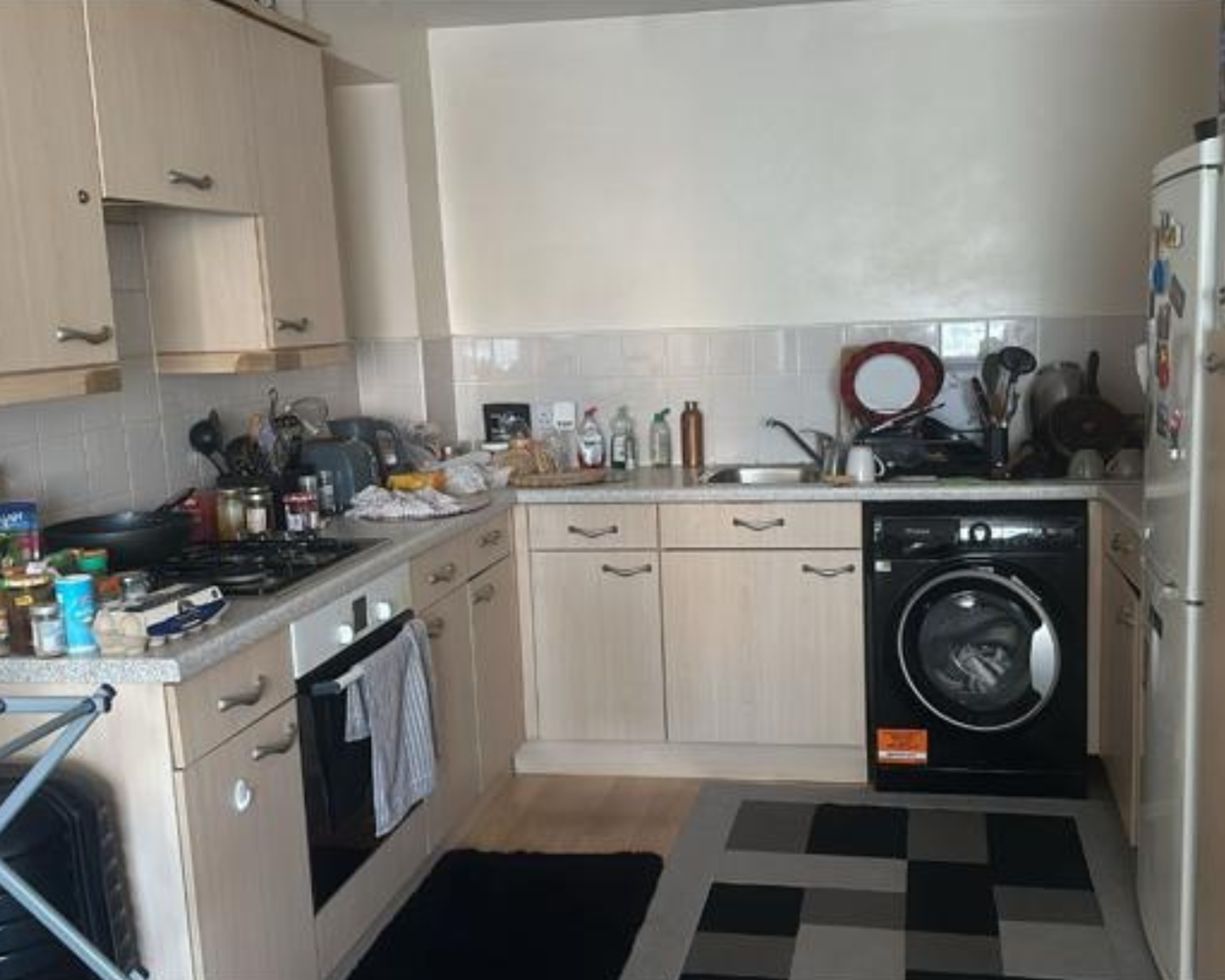The property opens into a private entrance hall, which leads to an open plan kitchen, dining and carpeted living area with a built-in kitchen, which offers a practical and sociable space. All kitchen appliances will remain. The home also provides two double bedrooms with ample storage space, and a family bathroom with a shower over a bath. The property benefits from an allocated parking space, and a communal garden area just outside.