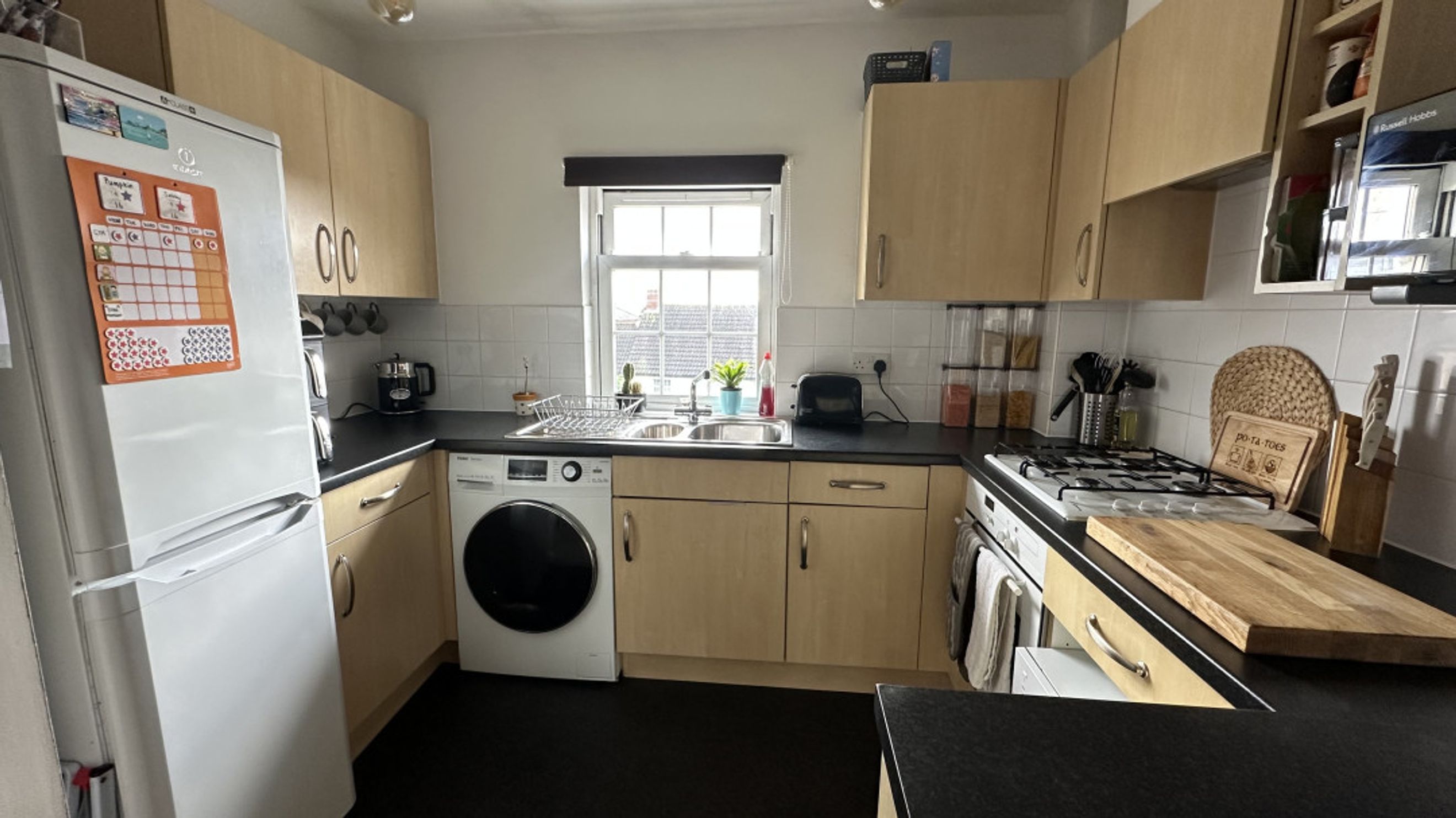 Double glazed sash window to rear. Range of matching eye and base level units. Working surfaces. Stainless steel sink unit with mixer tap. Fitted electric oven and GAS hob. Extractor. Space for washing machine and fridge freezer. Vinyl flooring. Part tiled walls.
