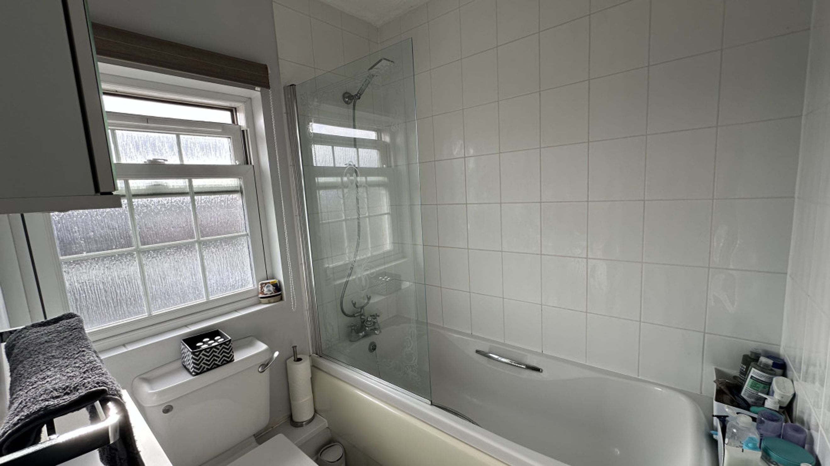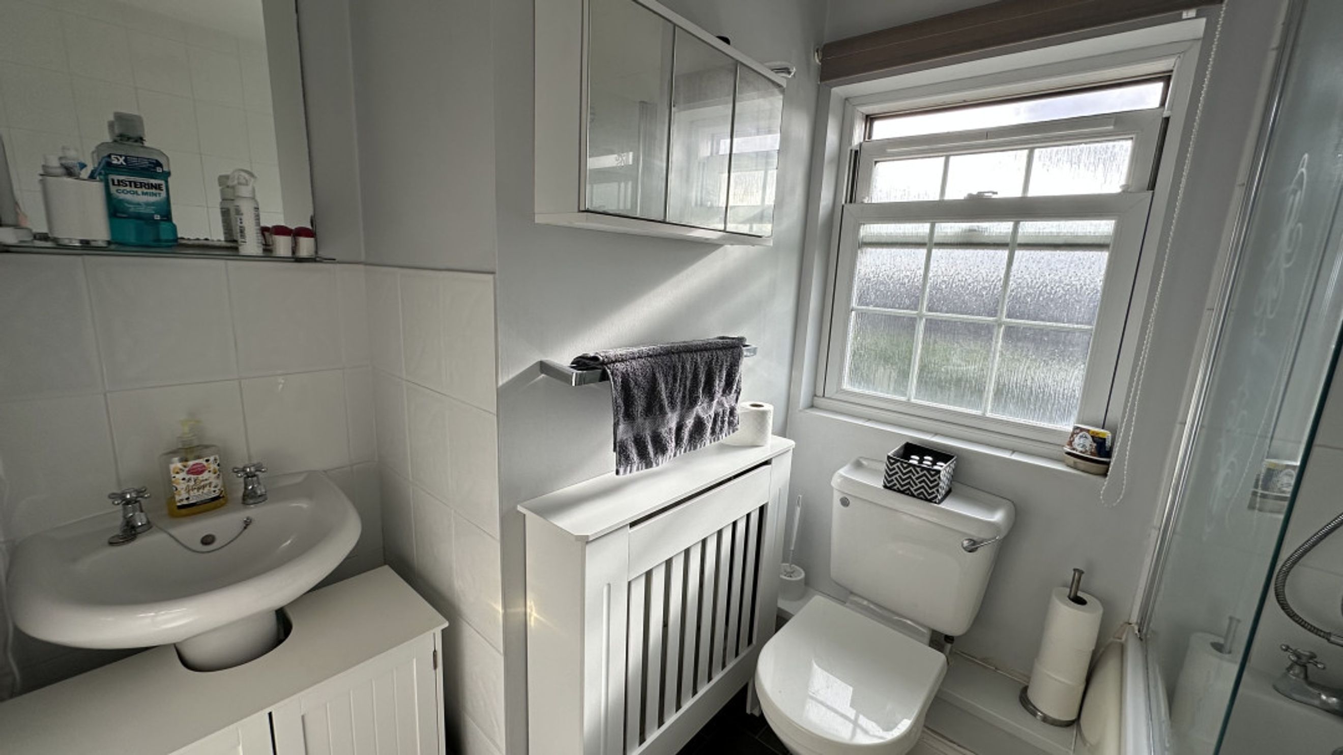 Double glazed patterned glass sash window to rear panelled bath with shower over and screen. Low level w.c. Pedestal Wash hand basin. Radiator. Tiled walls.