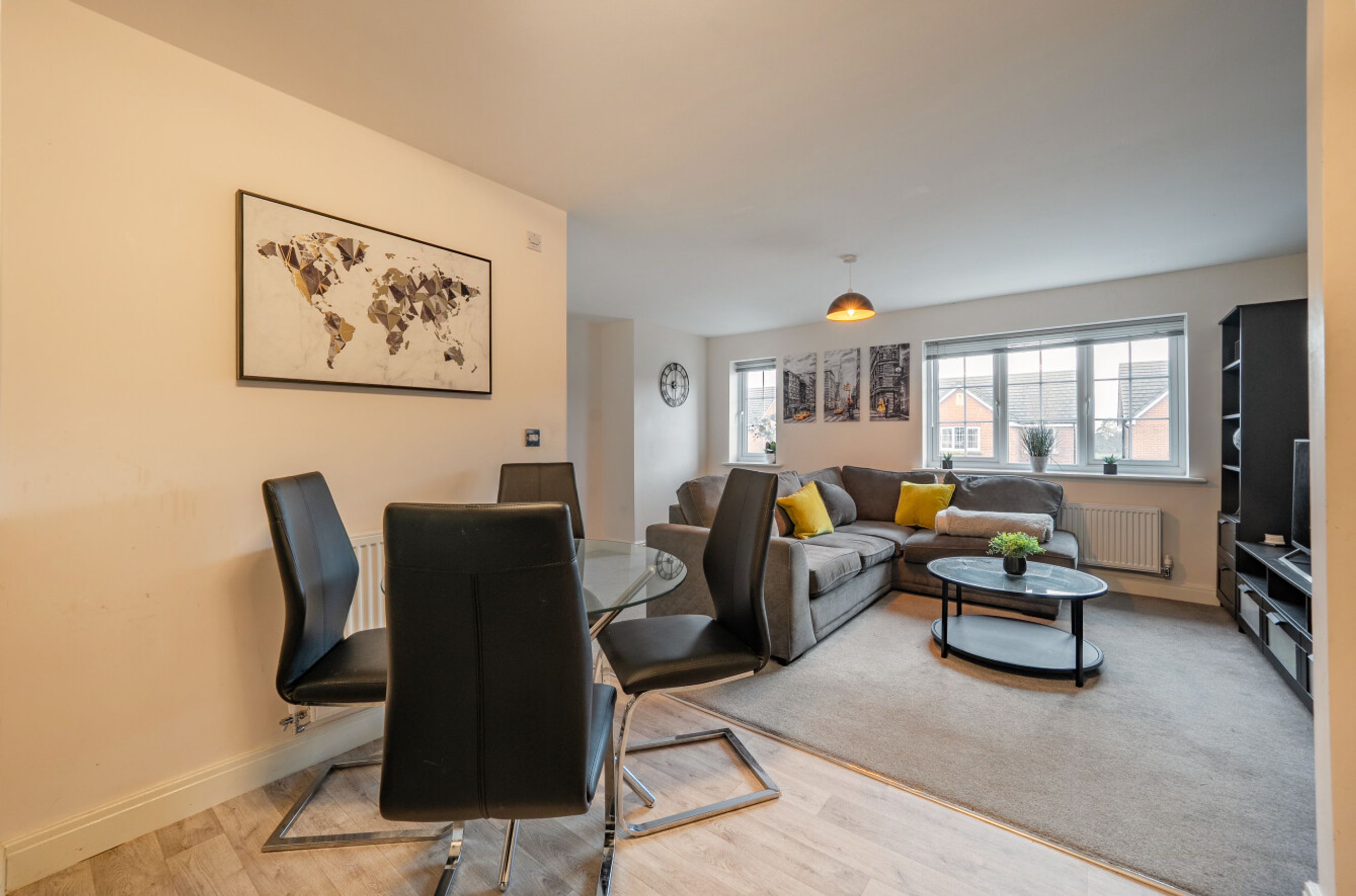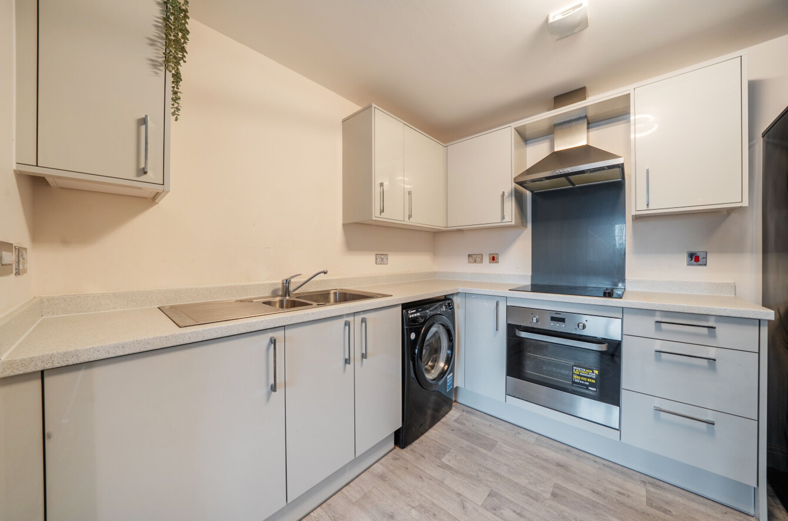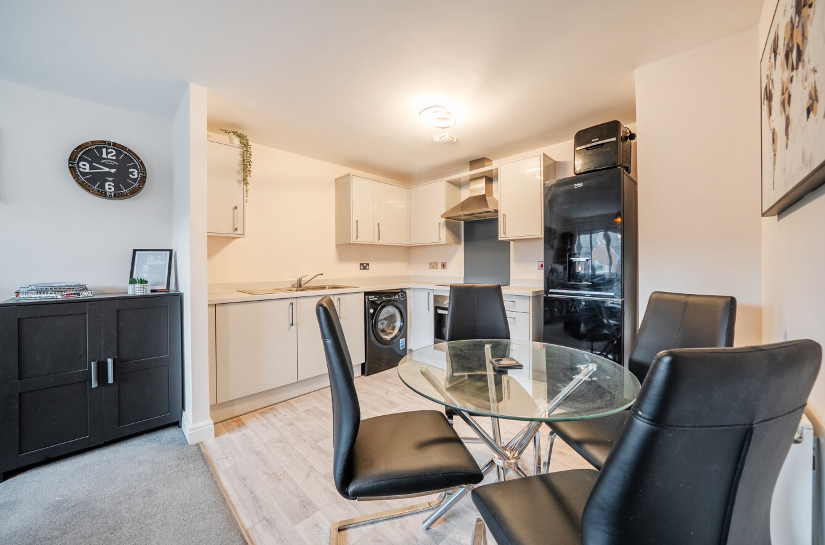 Inside, the apartment offers bright and well-balanced accommodation. The open-plan living and dining area provides a comfortable space to relax or entertain, complemented by a modern fitted kitchen with ample storage and preparation space.