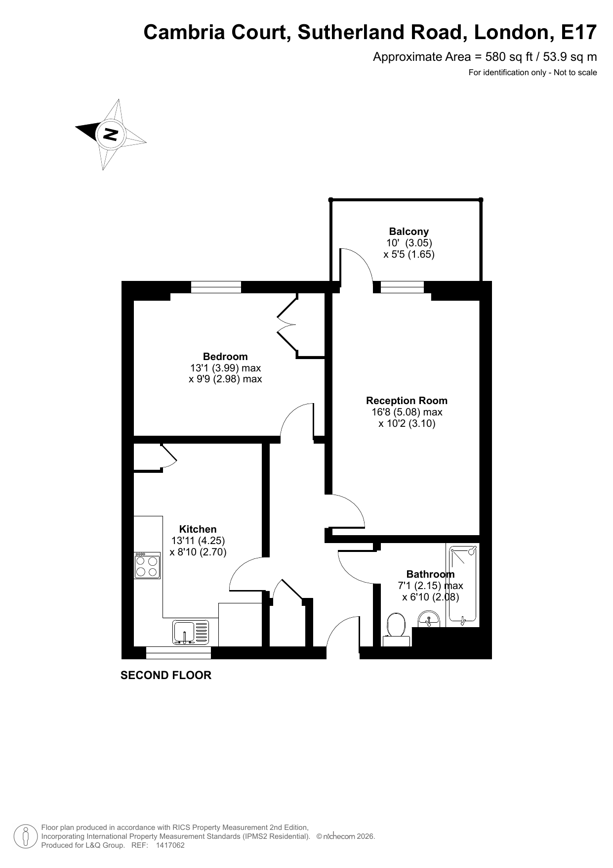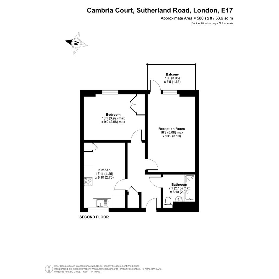 Enter this second floor apartment via a central entrance hall with storage. The separate kitchen is to your left and fitted with a range of white wall and base units with black worktops. There is an integrated oven, hob, extractor fan and spaces for white goods as well as room for a dining table. A double bedroom with in-built storage faces east as does the main reception room that has doors to a private balcony. A bathroom with shower over bath, completes the accommodation.