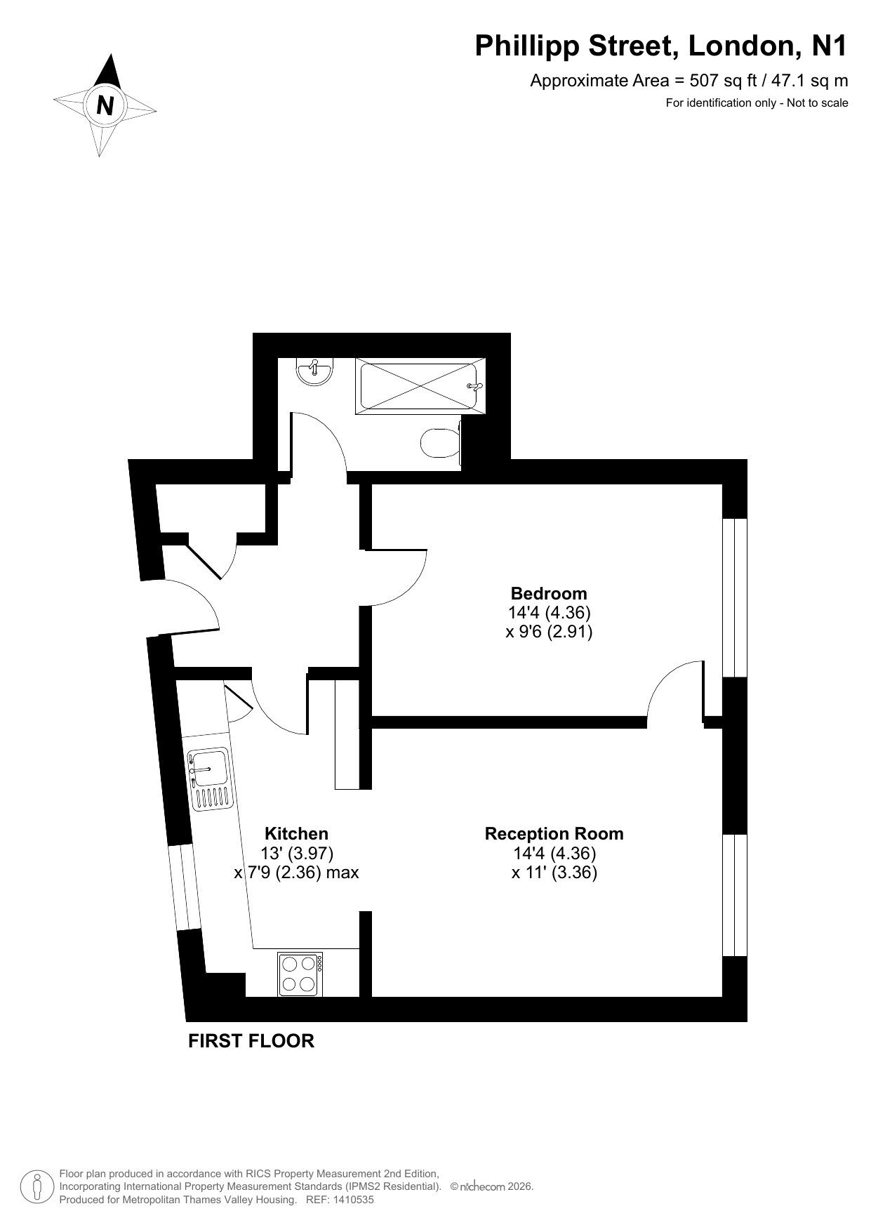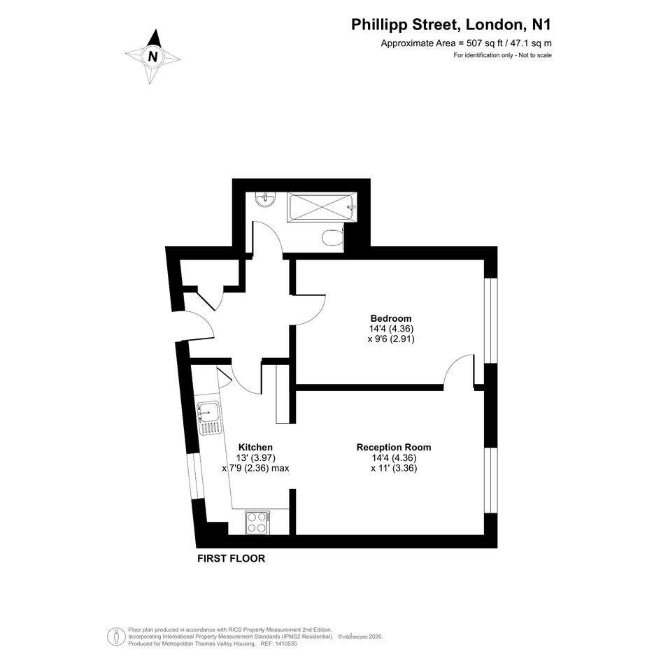 The property is situated on the first floor of a four-storey building. The flat comprises an entrance hallway with integrated storage, a fitted kitchen and living room area, a bedroom and a bathroom.