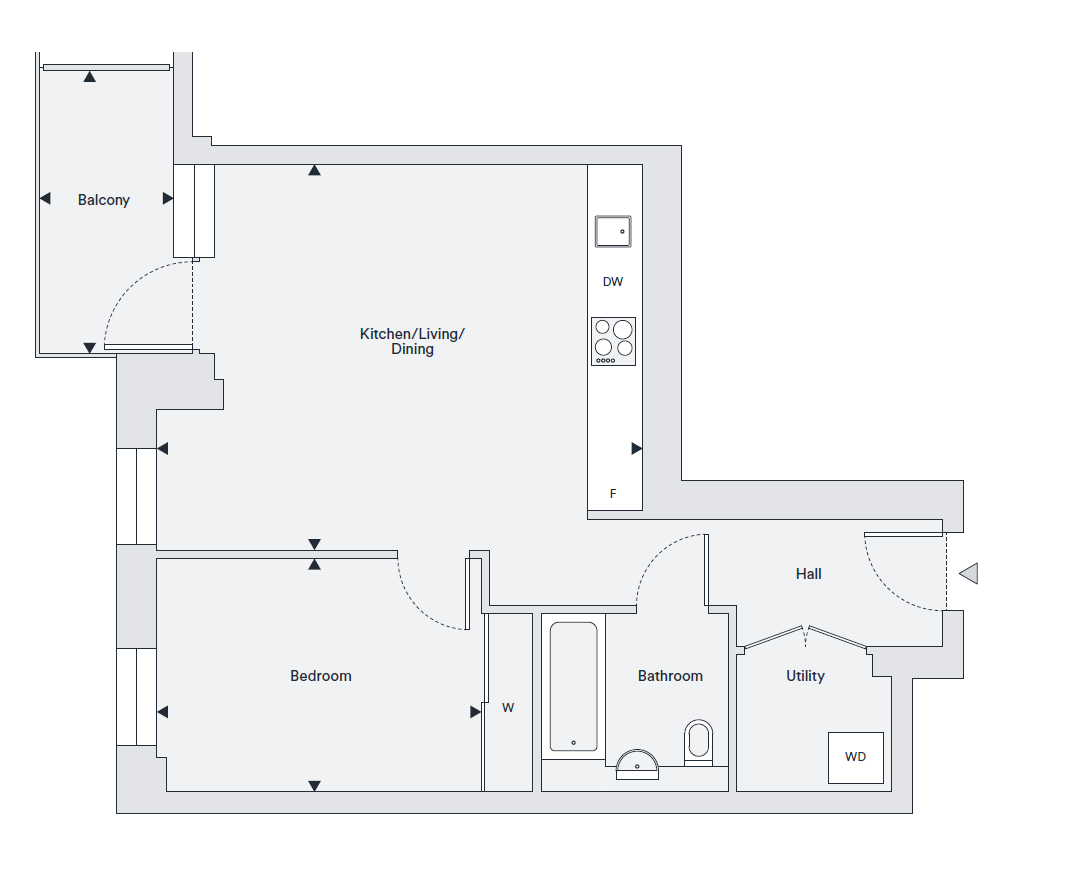 1 bedroom, 1 bathroom, 8th floor apartment offering 50.6 sq.m of internal floor area with outdoor space. Boasting an open-plan kitchen/living/dining area with double aspect windows and Bosch integrated appliances, alongside a double bedroom with a fitted wardrobe.