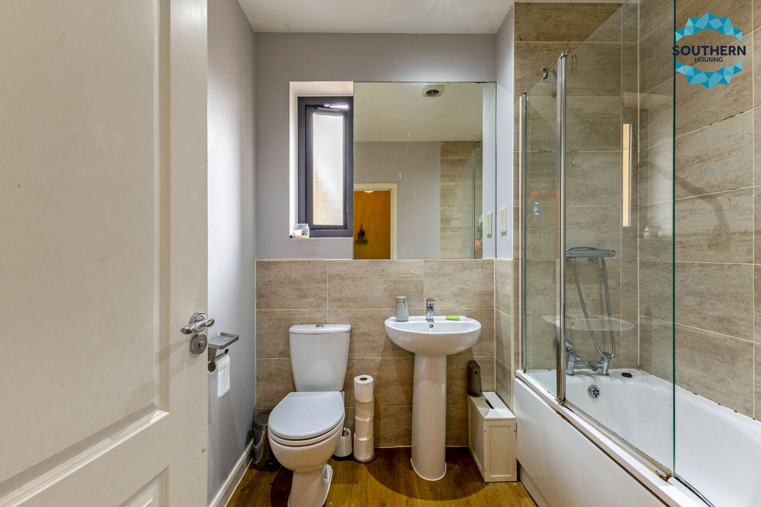 The large family bathroom features a shower over the bath, catering to all household needs.