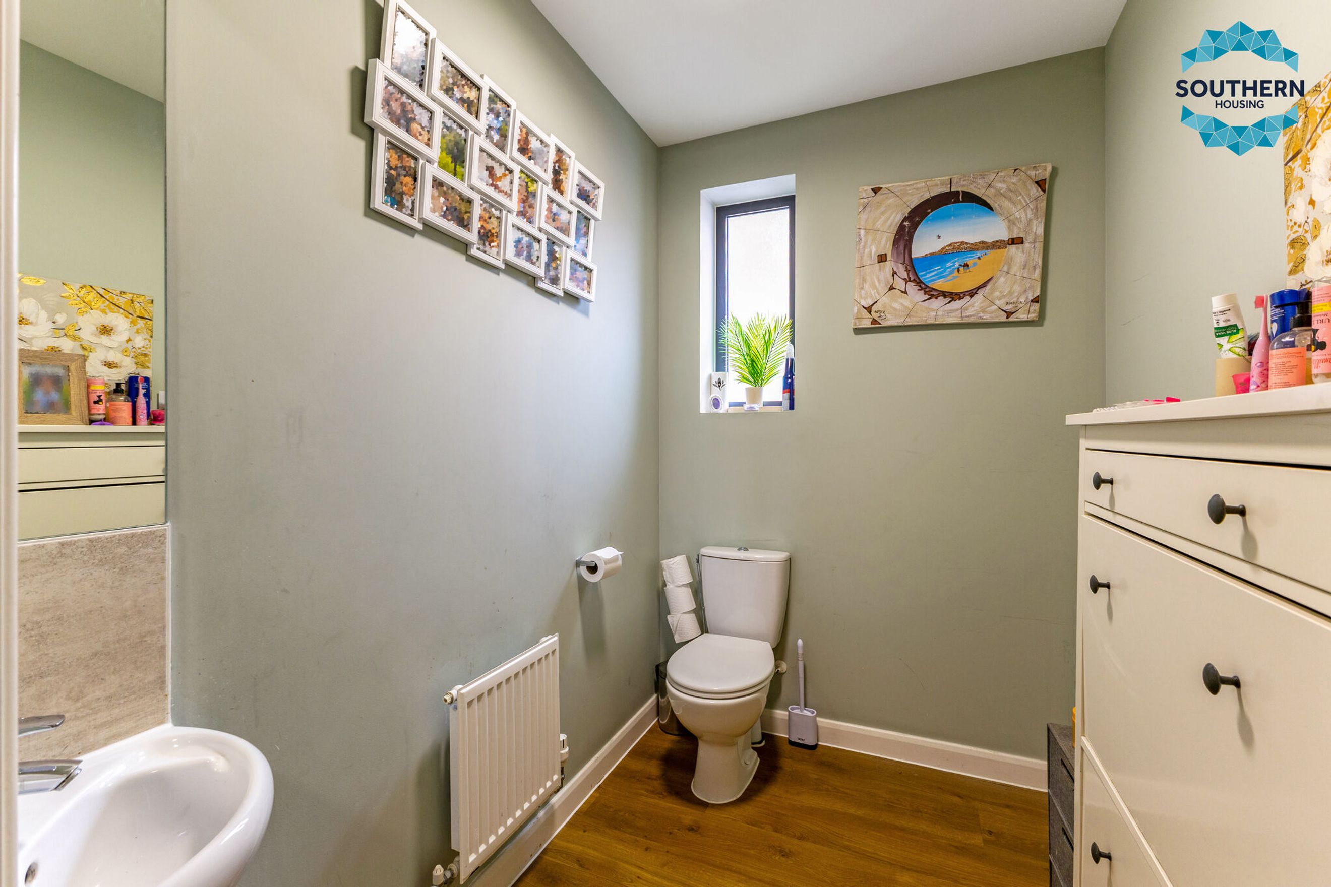 Step into a bright and spacious hallway that connects all main living areas. Here, you'll find a large storage cupboard, ideal for appliances and household essentials, as well as a contemporary downstairs WC with a sink.