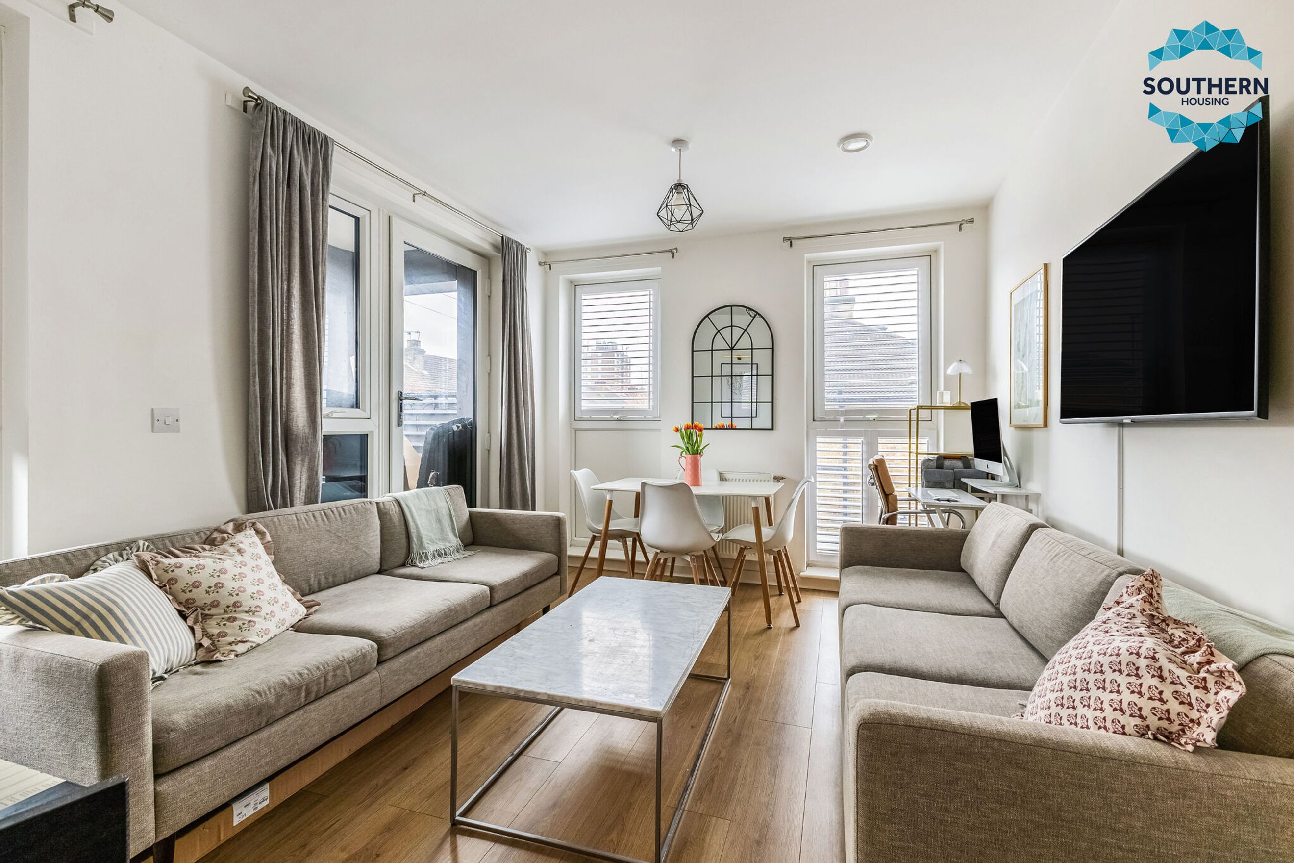 A generous entrance hallway with built-in storage leads into a spacious dual-aspect reception room, enjoying both south and east-facing windows and direct access to a private balcony. The orientation allows sunlight to flood the living space throughout the day, creating a warm and inviting environment ideal for relaxing or entertaining.