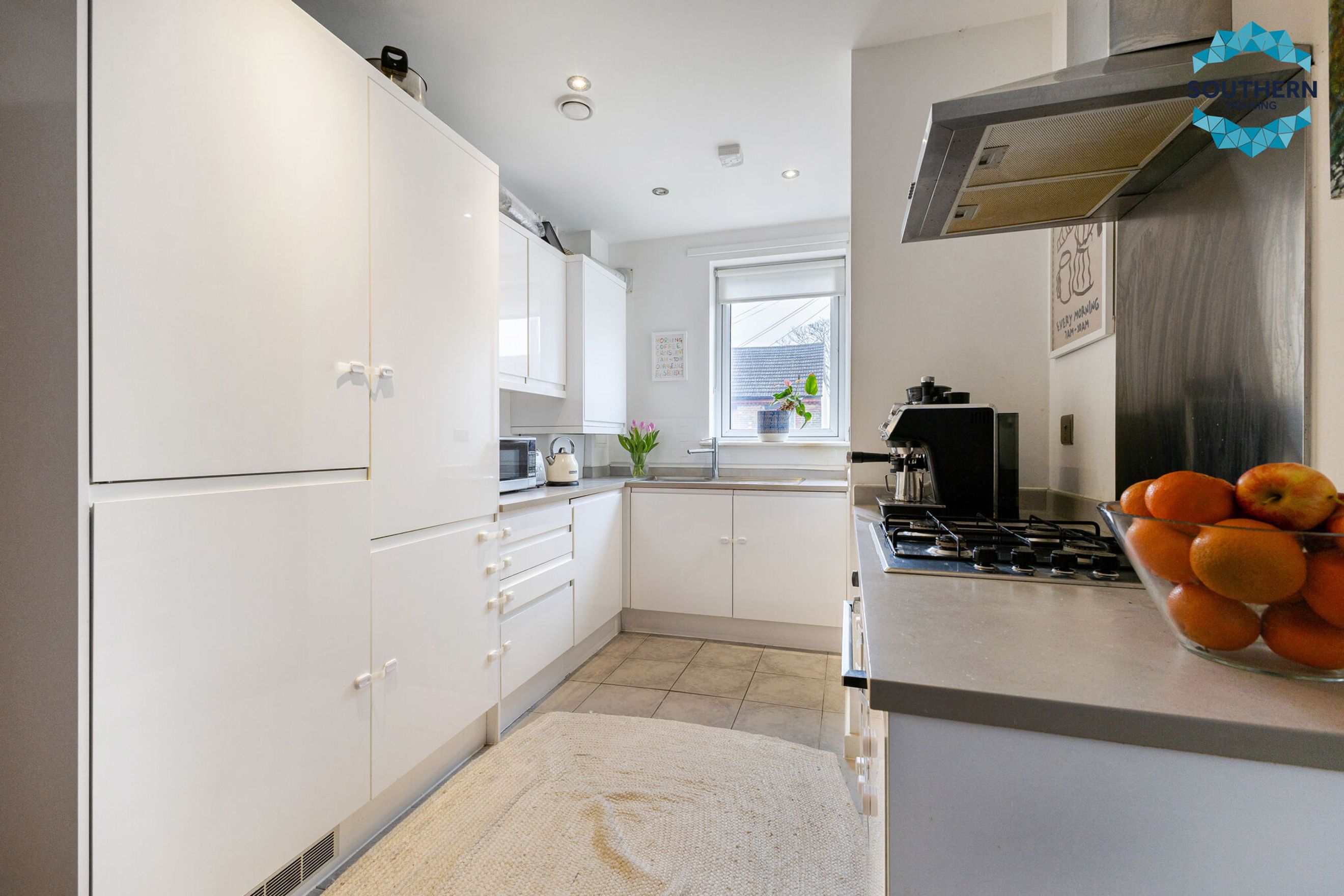 The kitchen is arranged in a semi open-plan layout, positioned just off the reception area while maintaining a defined cooking space. It offers ample worktop preparation areas and storage, integrated appliances and its own window providing additional natural light and ventilation.