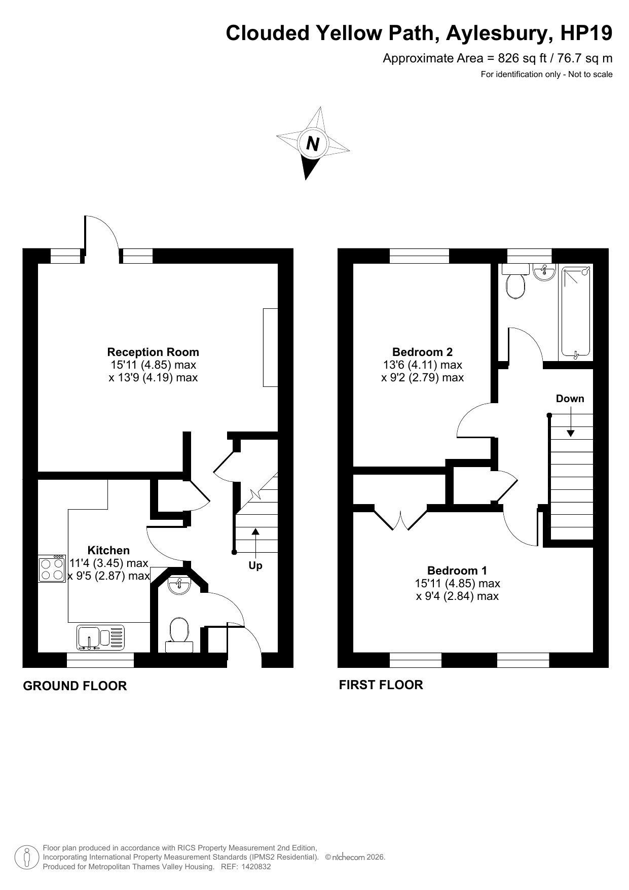 The property on the ground floor comprises an entrance hallway, a separate WC, a fitted kitchen, and a large reception room. On the first floor, there are two bedrooms and one bathroom.