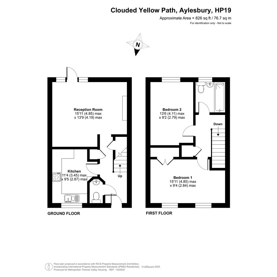 The property on the ground floor comprises an entrance hallway, a separate WC, a fitted kitchen, and a large reception room. On the first floor, there are two bedrooms and one bathroom.
