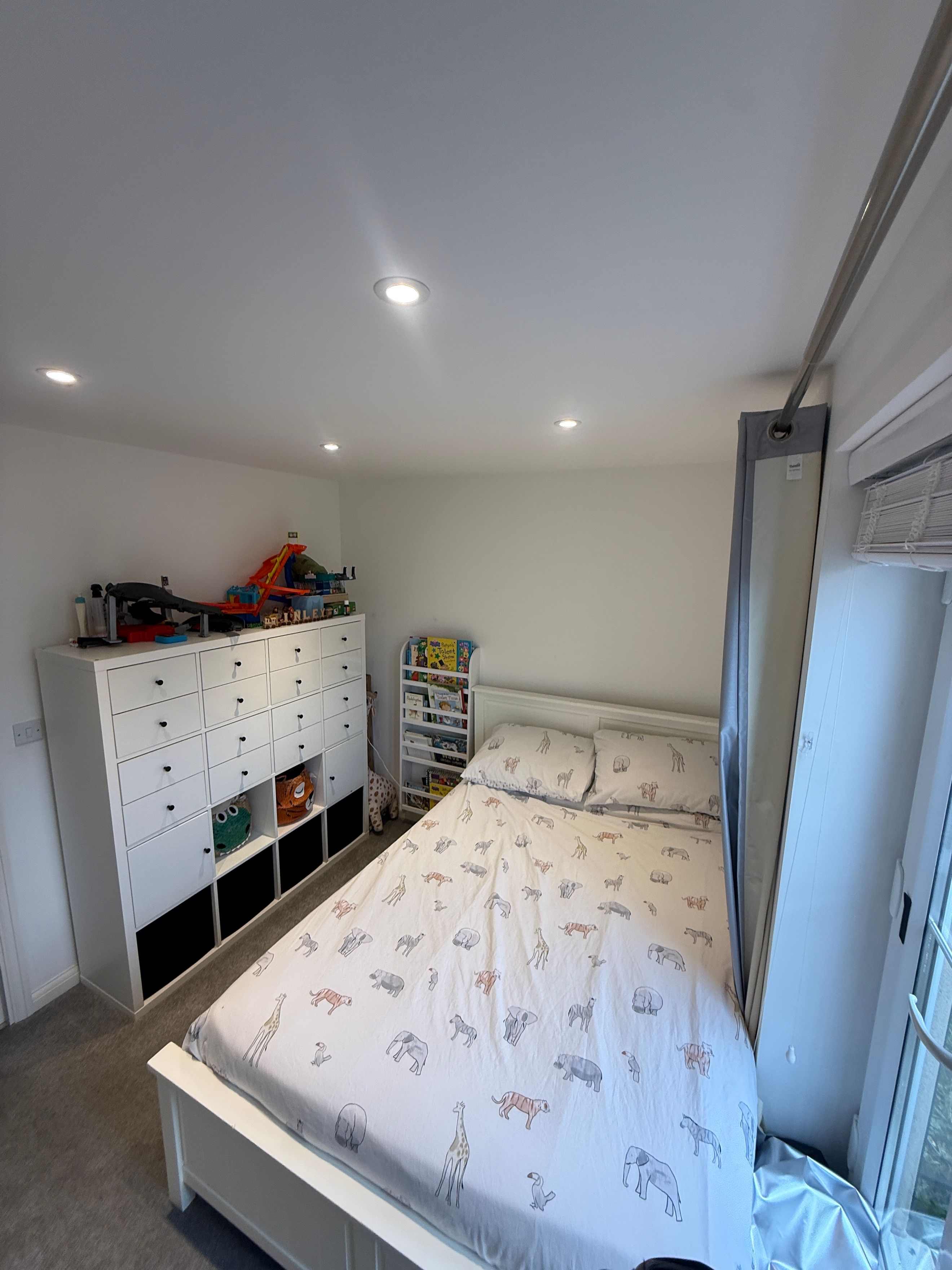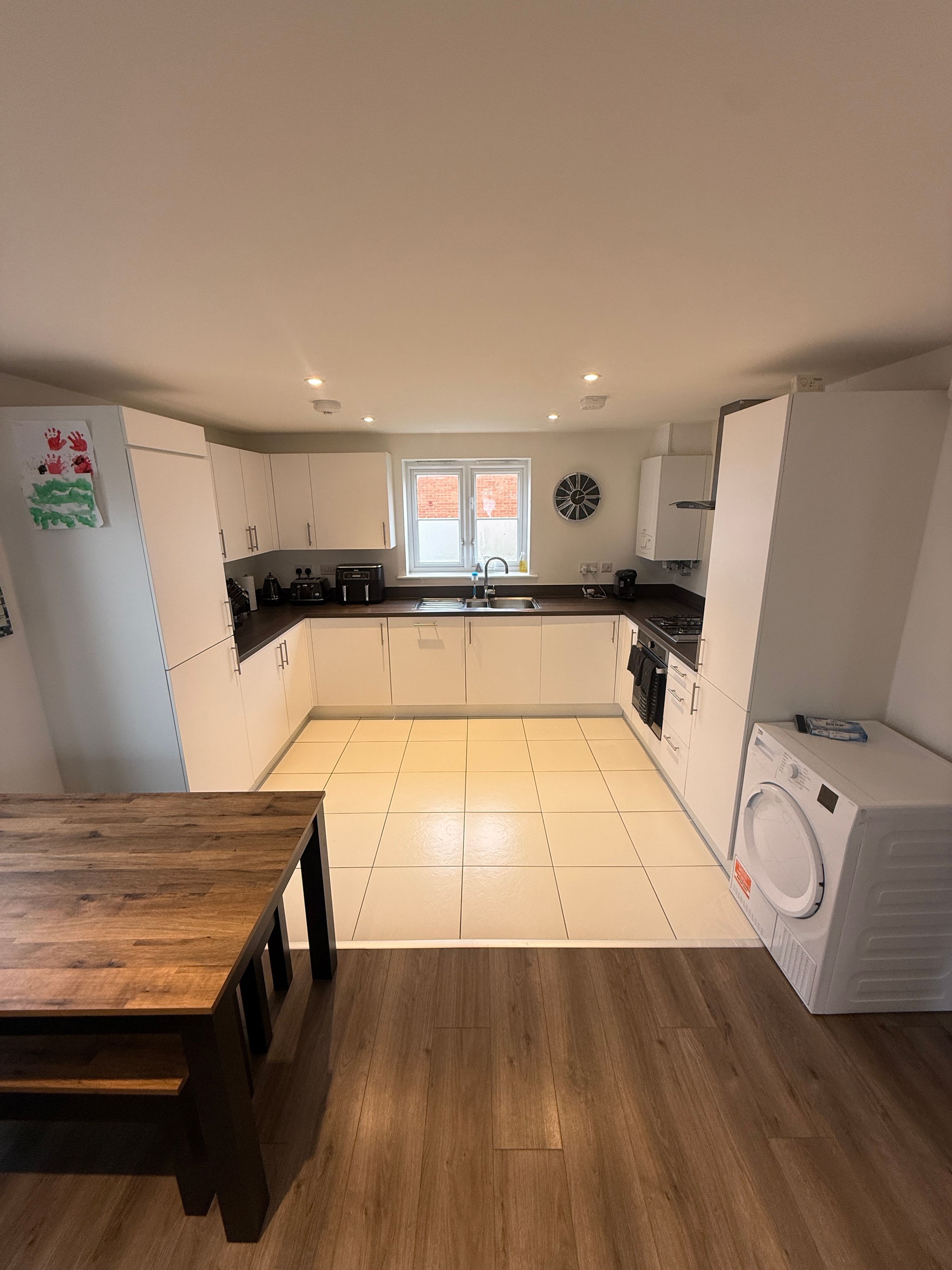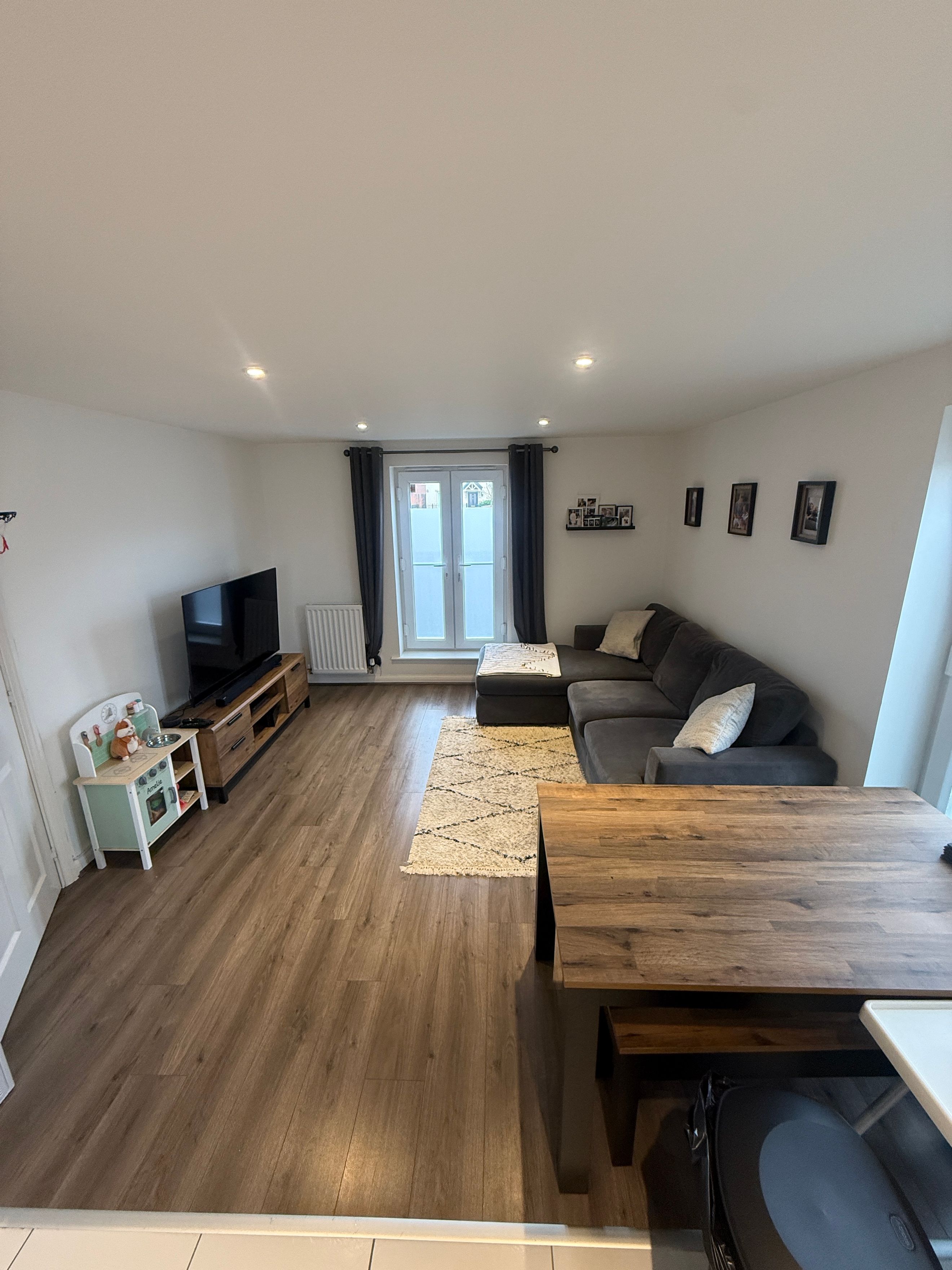 The open-plan living room and kitchen serve as the heart of this home, designed with both relaxation and entertainment in mind. This spacious area accommodates a dining table, making it ideal for hosting family and friends. The sleek kitchen is well-appointed with a combination of wall and base units, featuring integrated appliances such as an oven, hob, fridge, and dishwasher, alongside ample cupboard space.