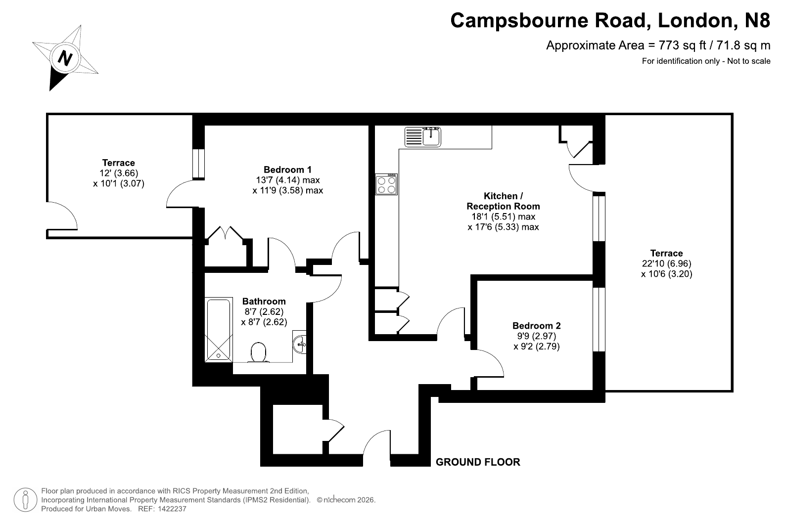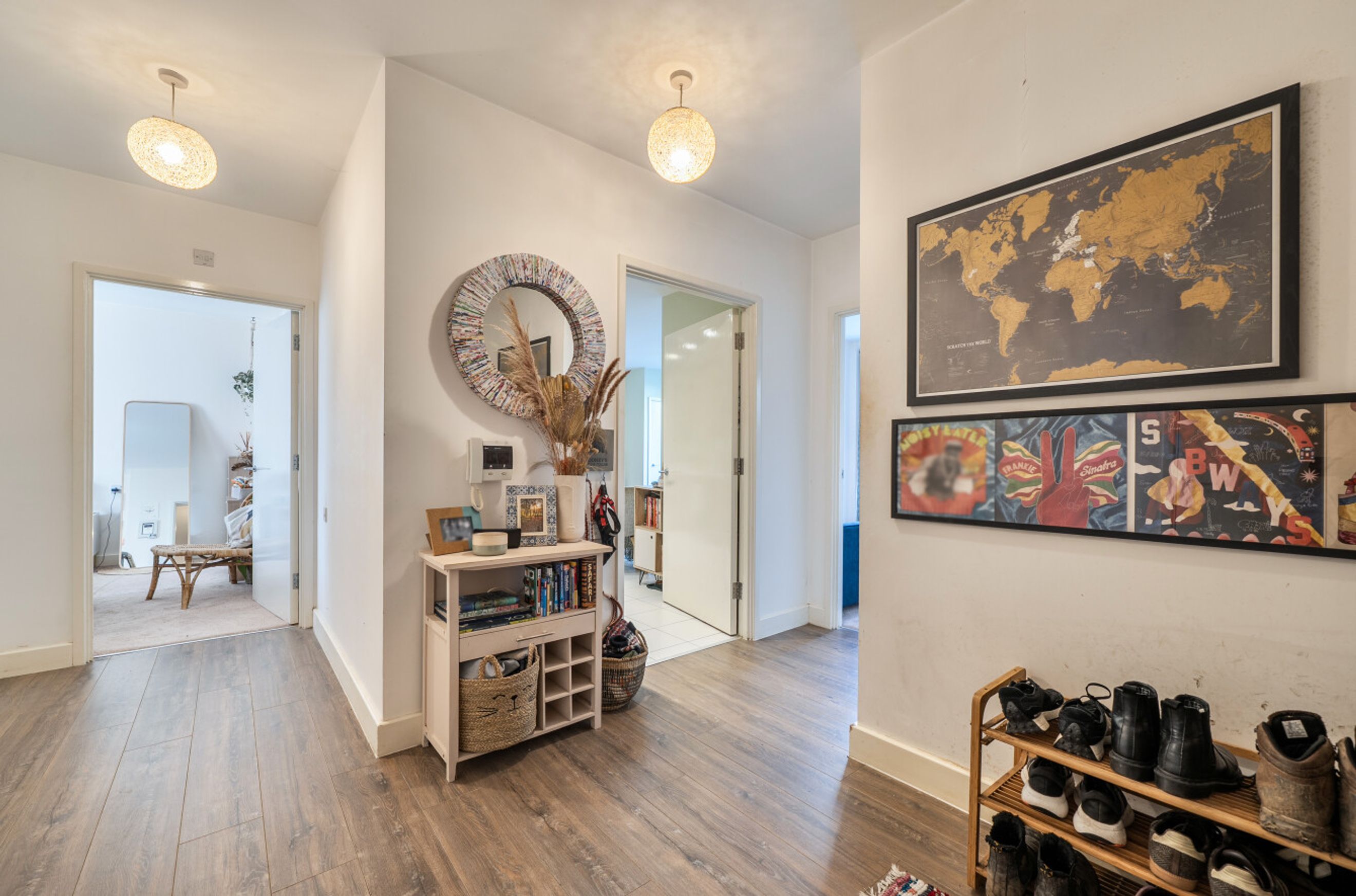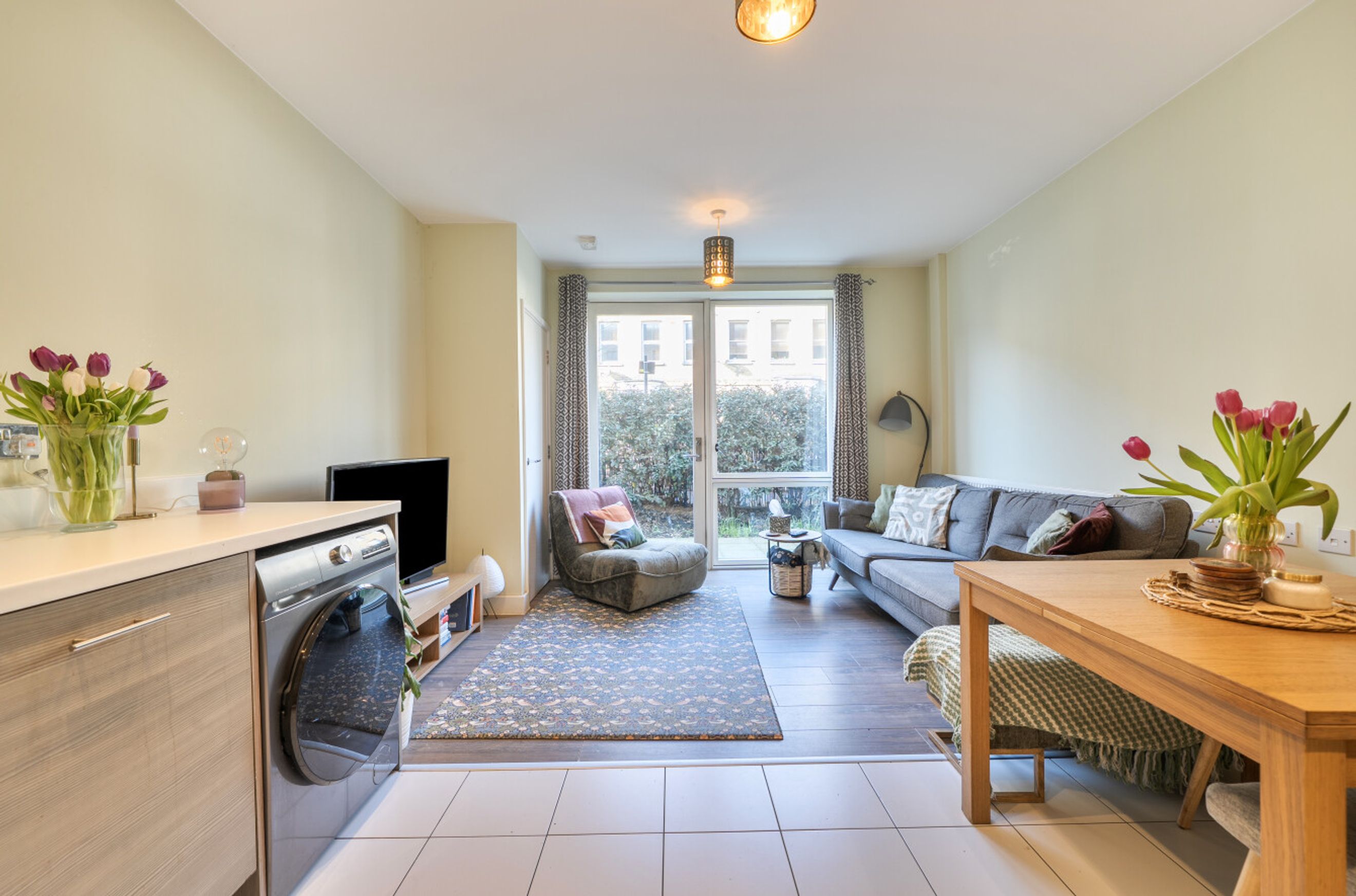 A great chance to buy a shared-ownership apartment with two private terraces. The smartly-presented, ground-floor property has an open-plan kitchen/reception room with attractive units and integrated appliances. A glazed door leads out to the larger, west-facing, terrace. The east-facing terrace is accessed via the spacious main bedroom which also includes a fitted wardrobe. There is a second bedroom, ideal for a child, occasional guest or use as a home office, and a large bathroom with limestone-style tiles. A storage/utility cupboard has been provided in the entrance hall and the well insulated walls and floor, high performance glazing and a modern gas central heating system all contribute towards a good energy-efficiency rating. Hornsey Station (mainline services in to Moorgate or out towards Hertfordshire) is close by and Turnpike Lane (Piccadilly Line) is within comfortable walking distance or brief bus/bike ride. The boutiques, bookstores, artisan coffee shops and other amenities of Crouch End are also within easy reach and Alexandra Park offers almost two hundred acres of outside space to enjoy. Ofsted list a secondary school and four primary schools within a half-mile radius, all rated 'Good'. The apartment comes with the use of an allocated space in the gated car park.