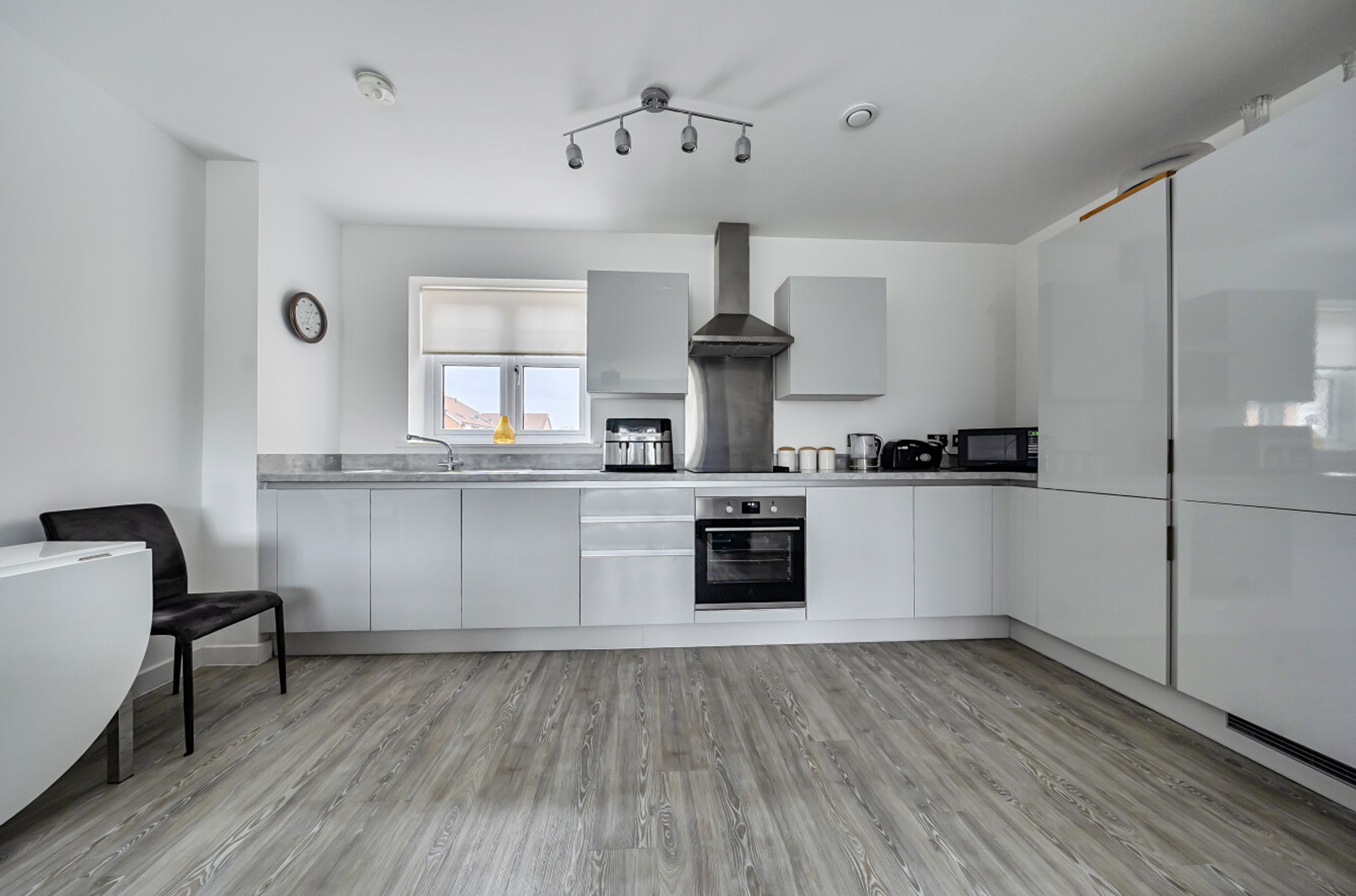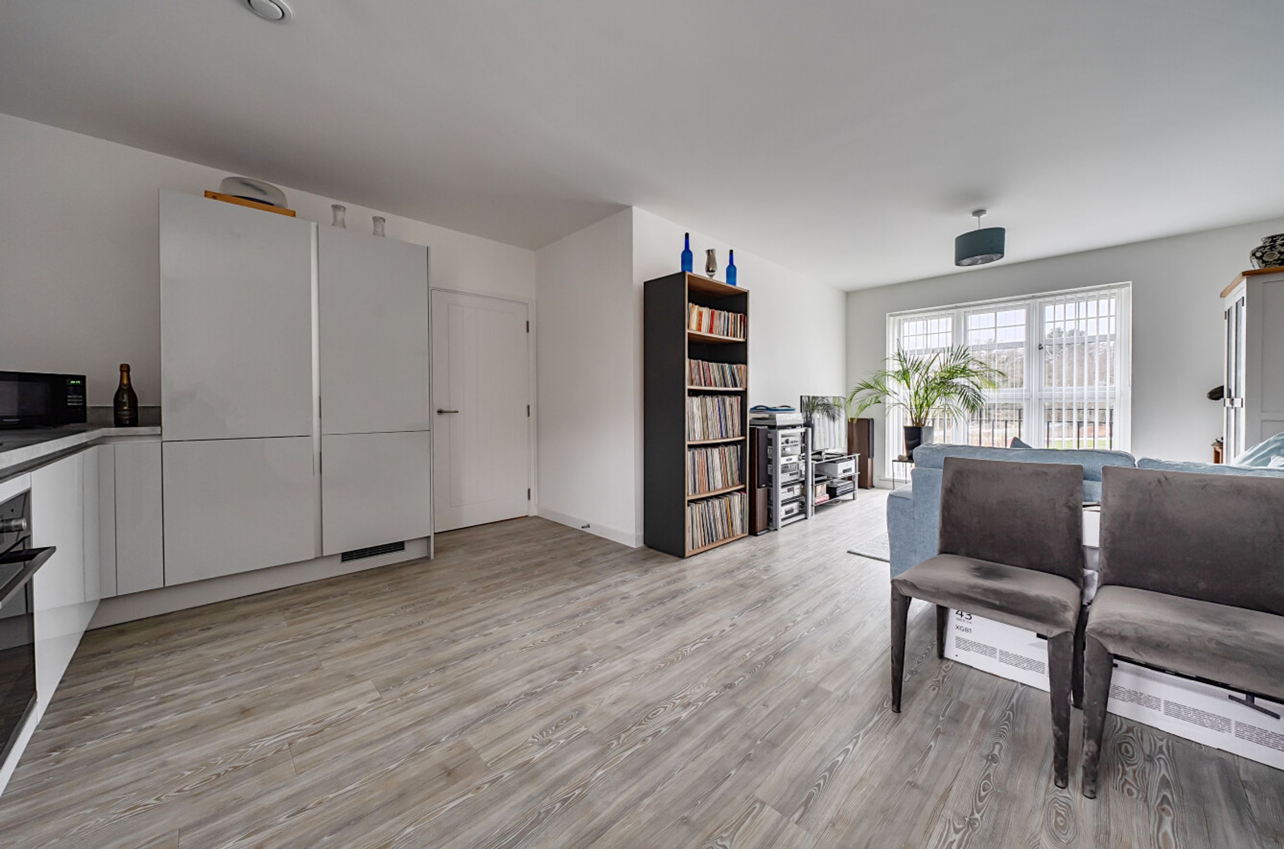 Featuring a spacious open-plan living area. The kitchen has integrated appliances including a fridge freezer, washing machine / dryer, oven, hob and hood.