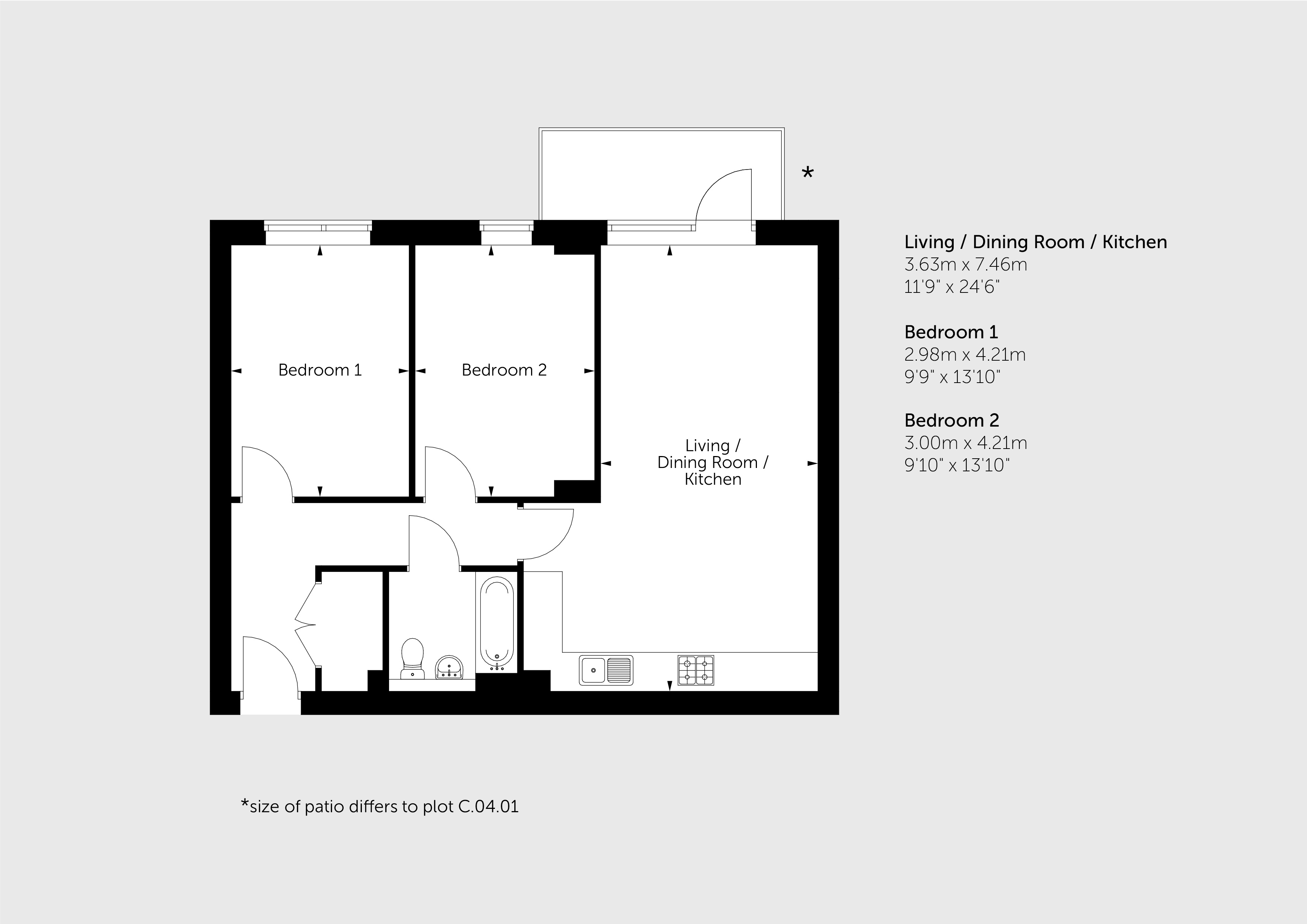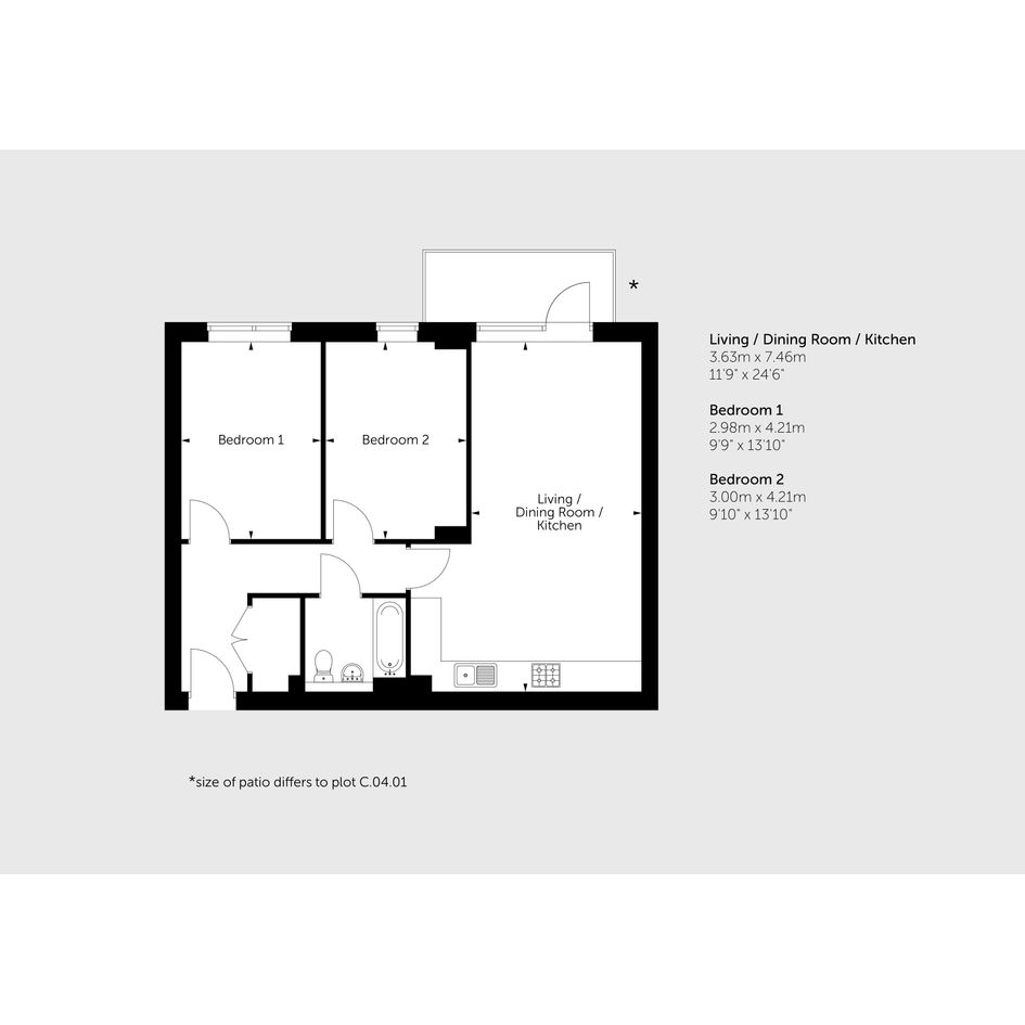 Featuring an open-plan kitchen / living / dining room with a door out to your balcony. The kitchen is fitted with an oven, hob and hood.
