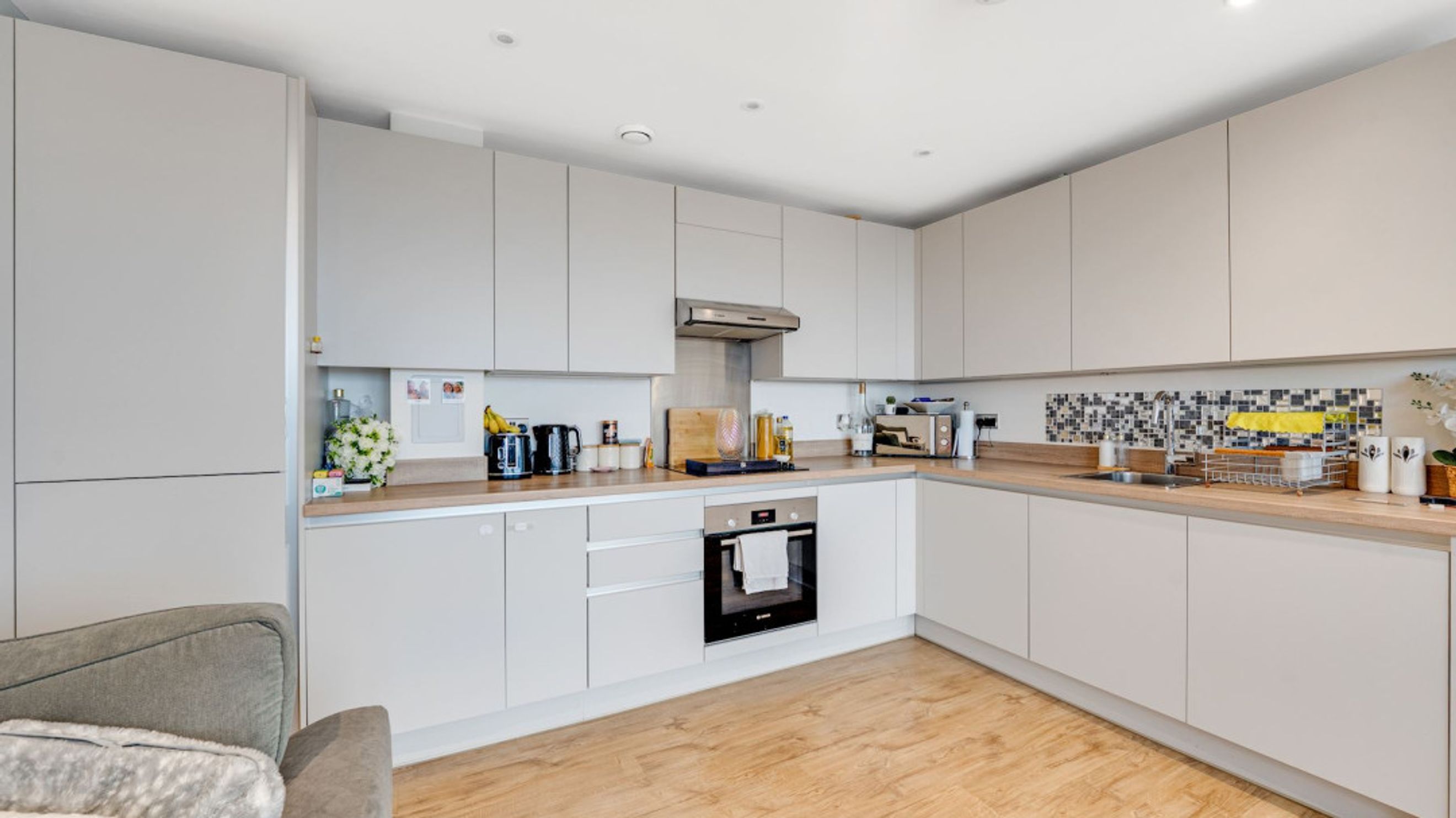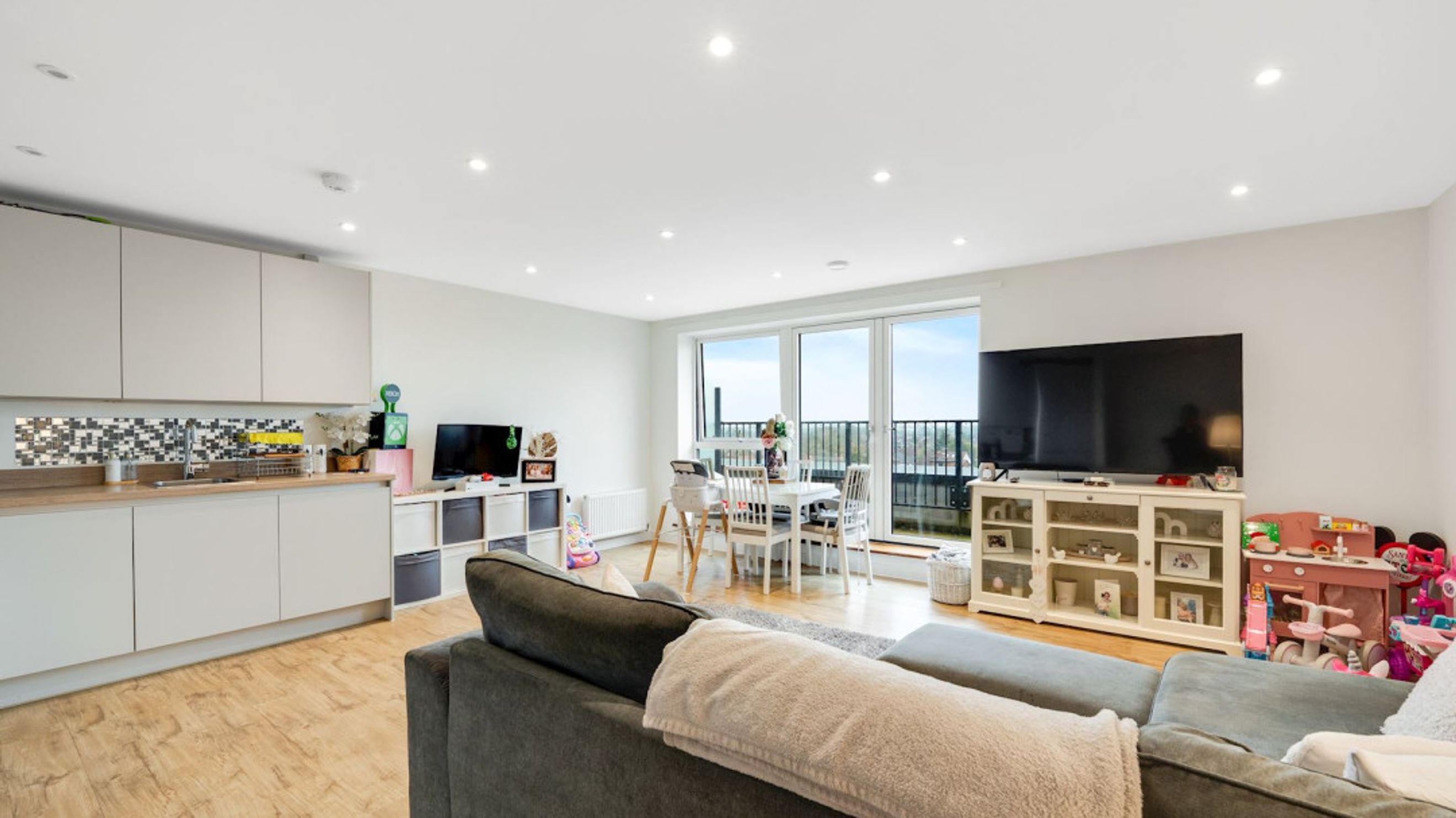 The property provides bright and well-proportioned accommodation throughout, comprising a spacious open-plan living and dining area, a modern fitted kitchen with a range of wall and base units, two generous double bedrooms, including a principal bedroom with en-suite shower room, and a contemporary family bathroom.