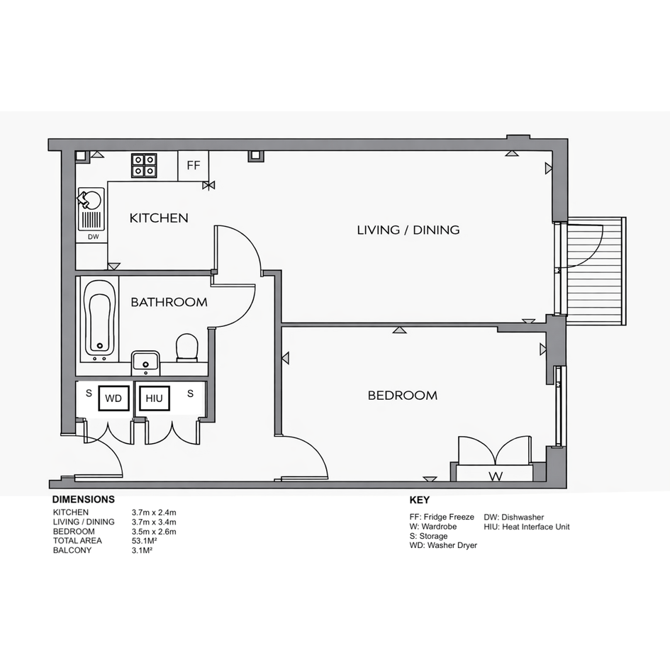 A modern 1-bedroom apartment with a private balcony in Bow, London.