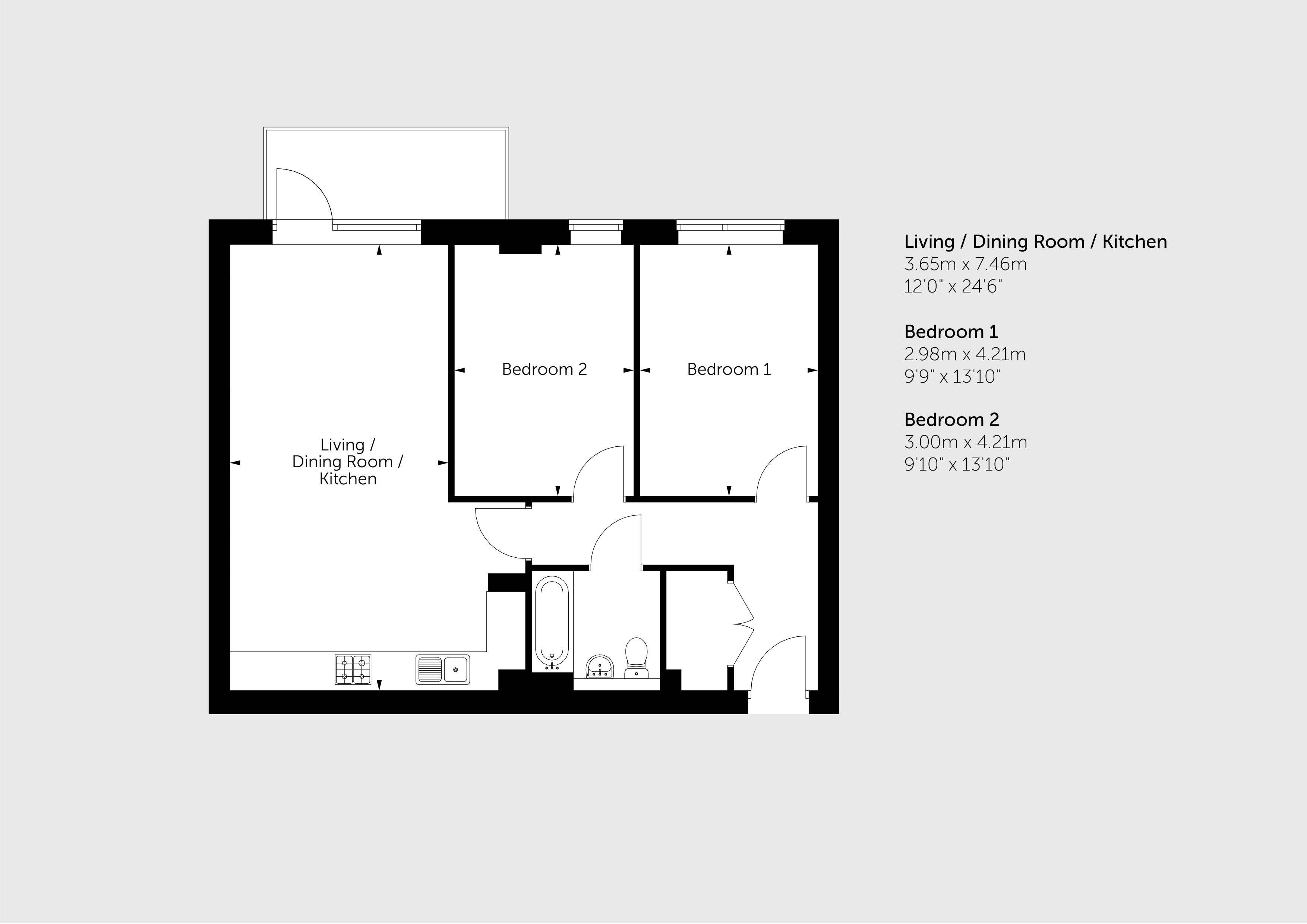 Featuring an open-plan kitchen / living / dining room with a door out to your balcony. The kitchen is fitted with an oven, hob and hood.