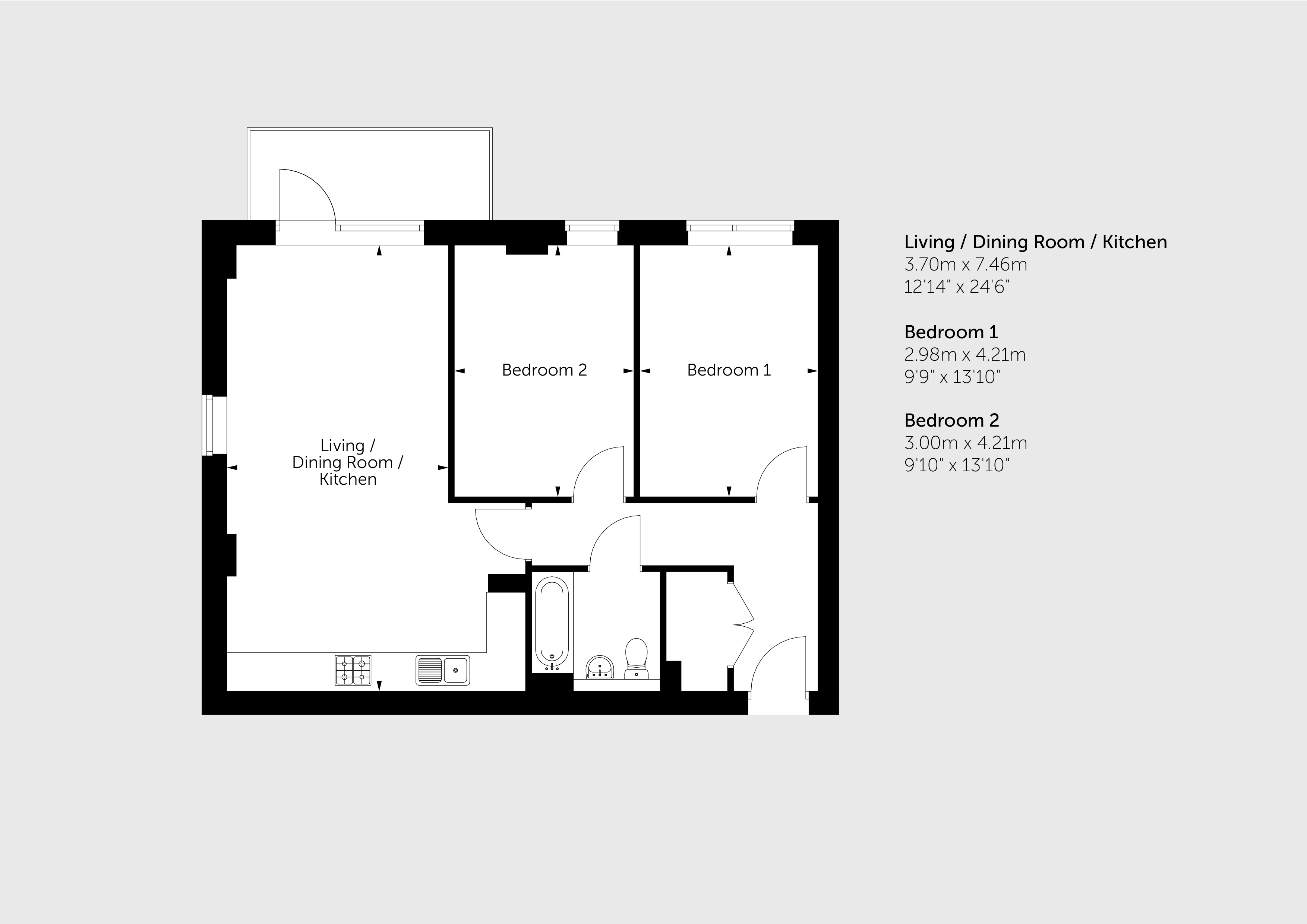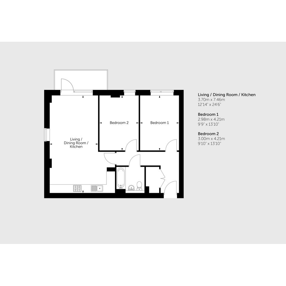 Featuring an open-plan kitchen / living / dining room with a door out to your balcony. The kitchen is fitted with an oven, hob and hood.
