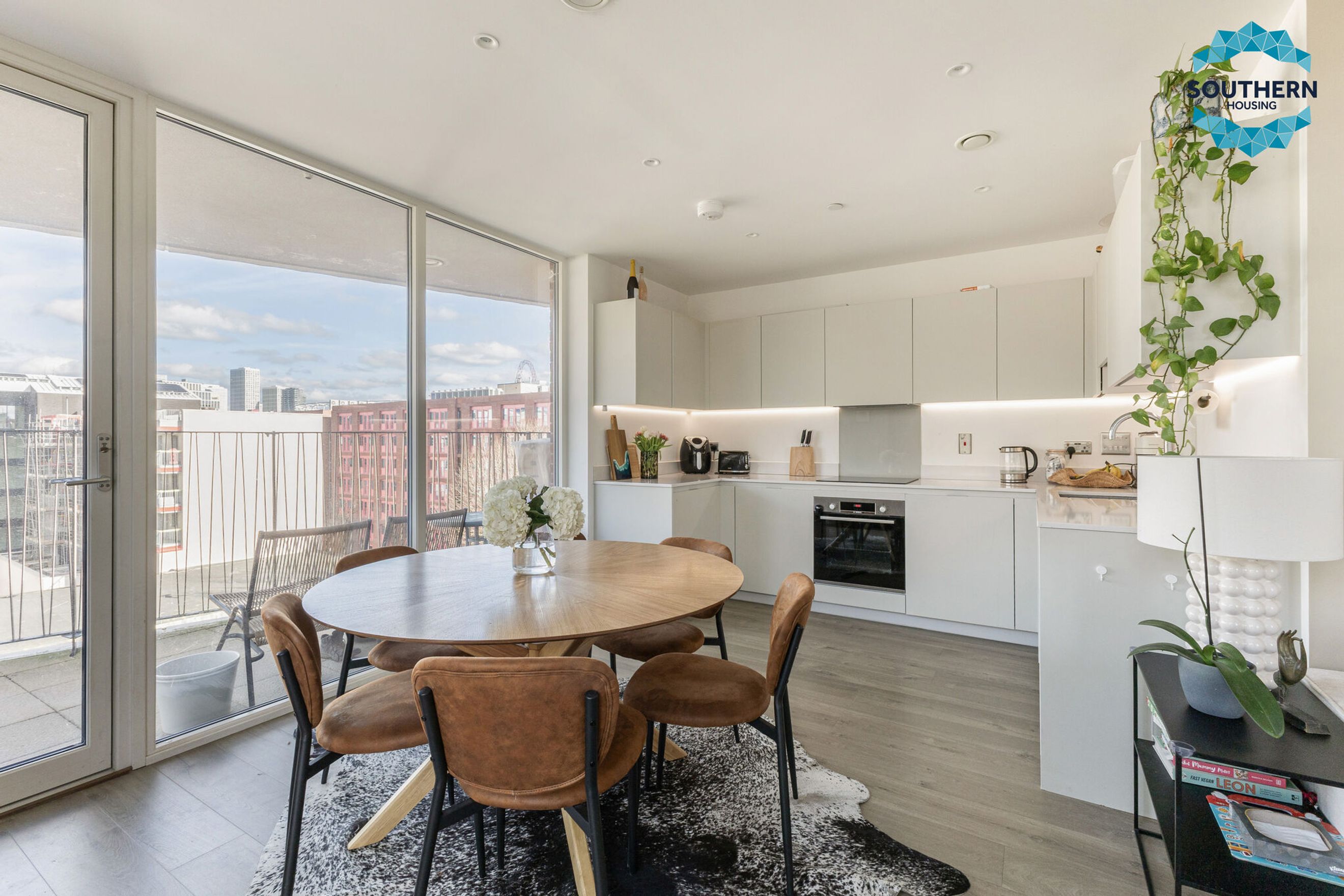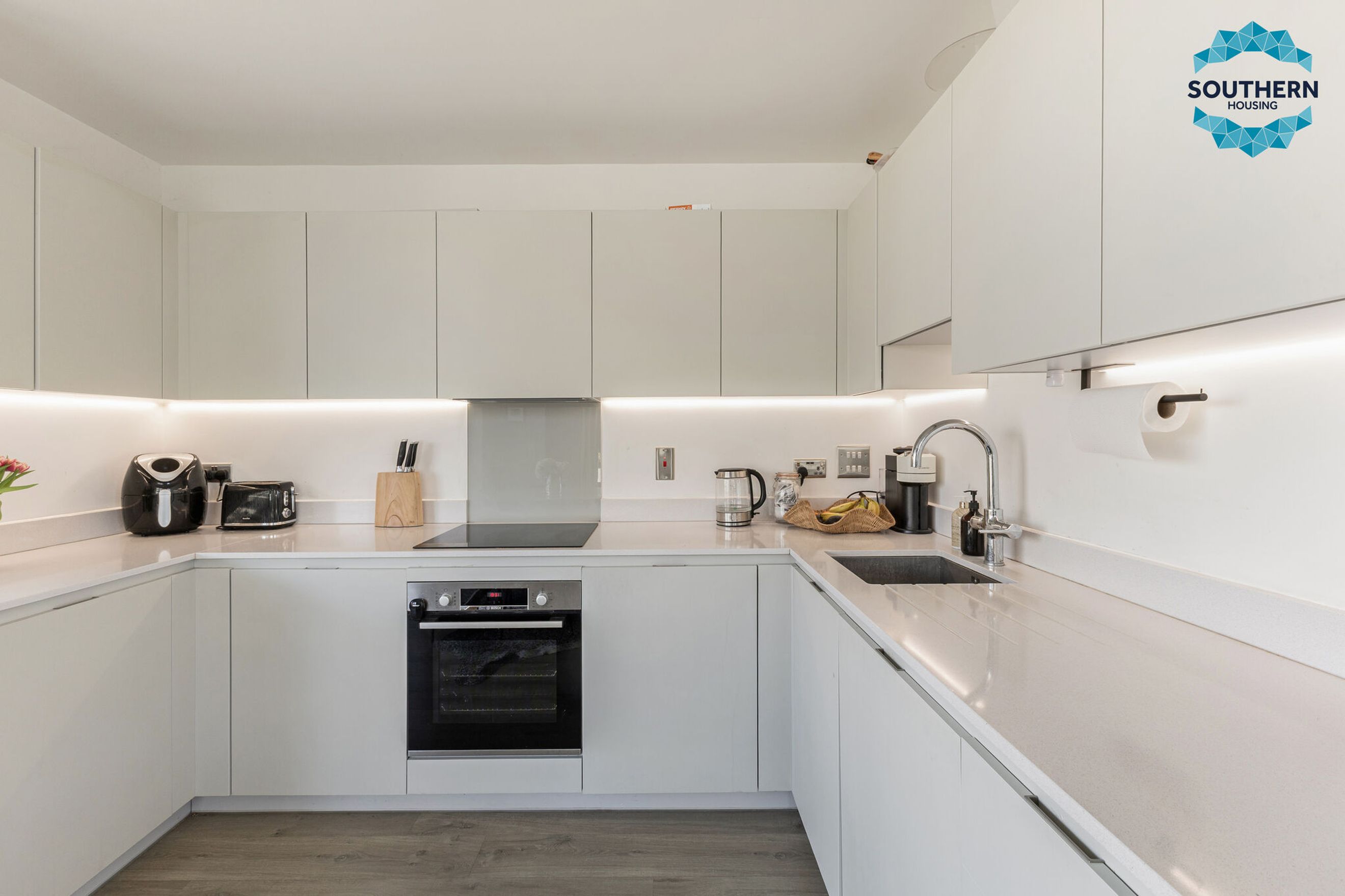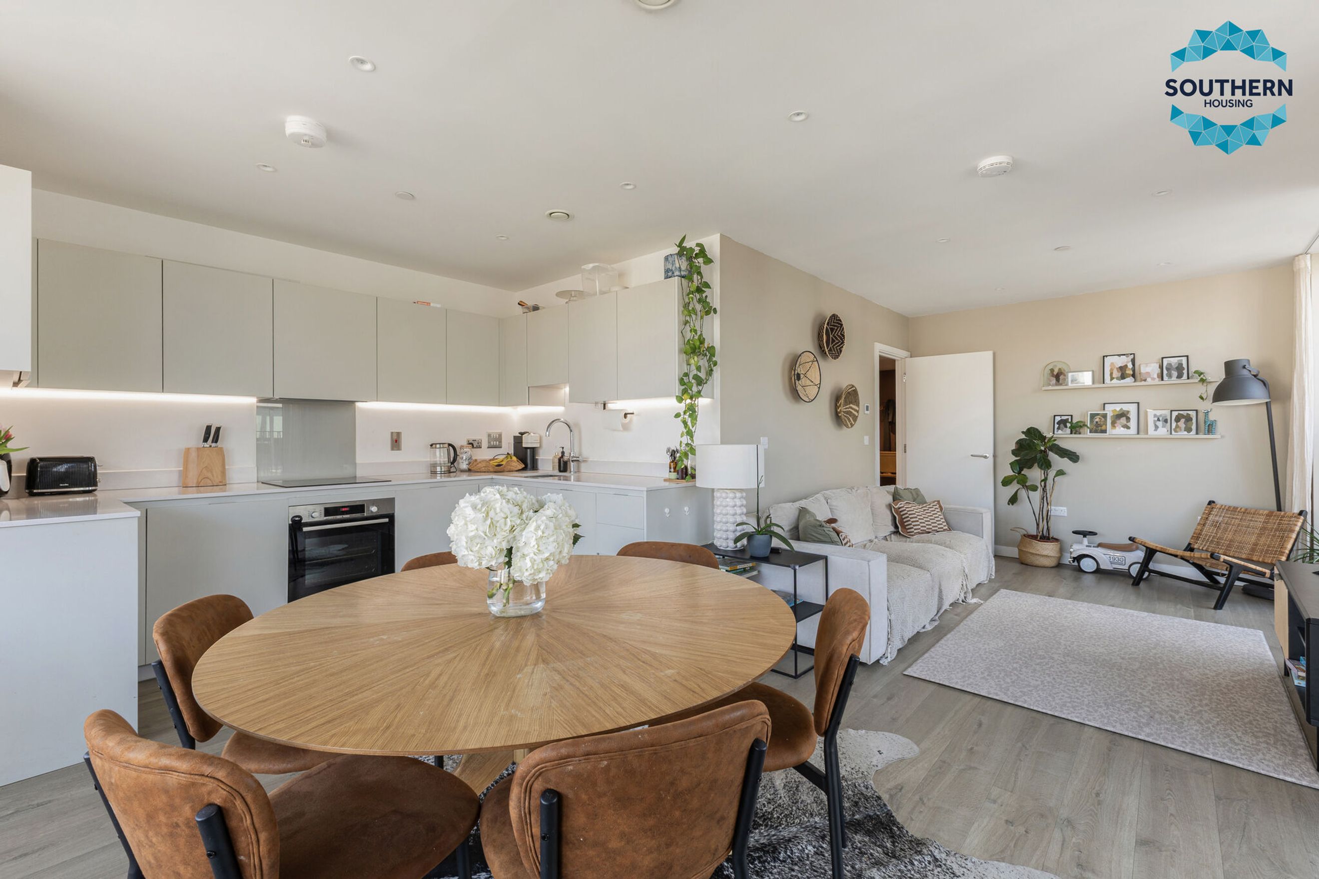 The bright and airy open‑plan kitchen, dining and living area forms the heart of the home, enhanced by floor‑to‑ceiling windows. The modern kitchen is fitted with integrated appliances including an oven, hob, extractor fan, fridge/freezer, and dishwasher.