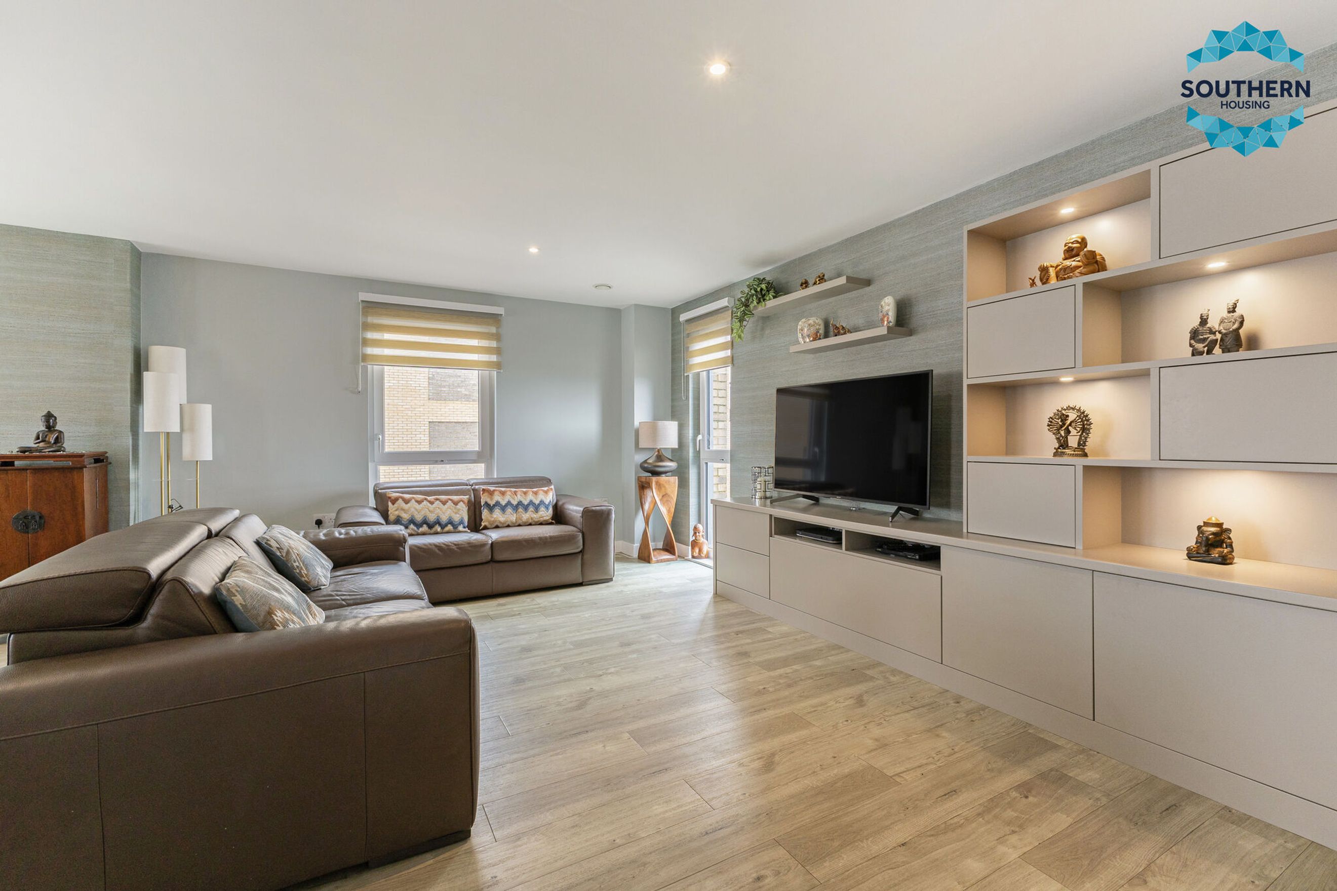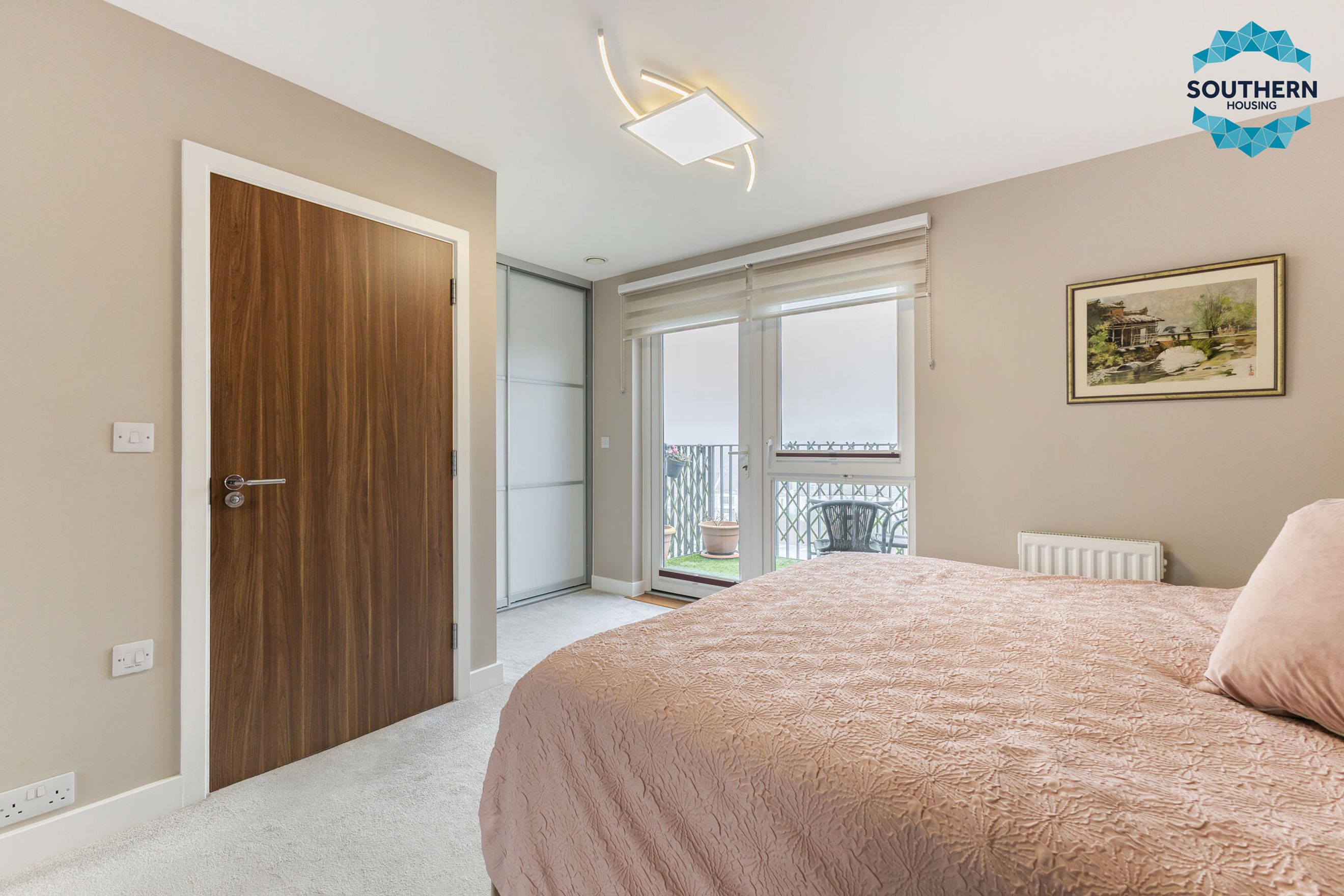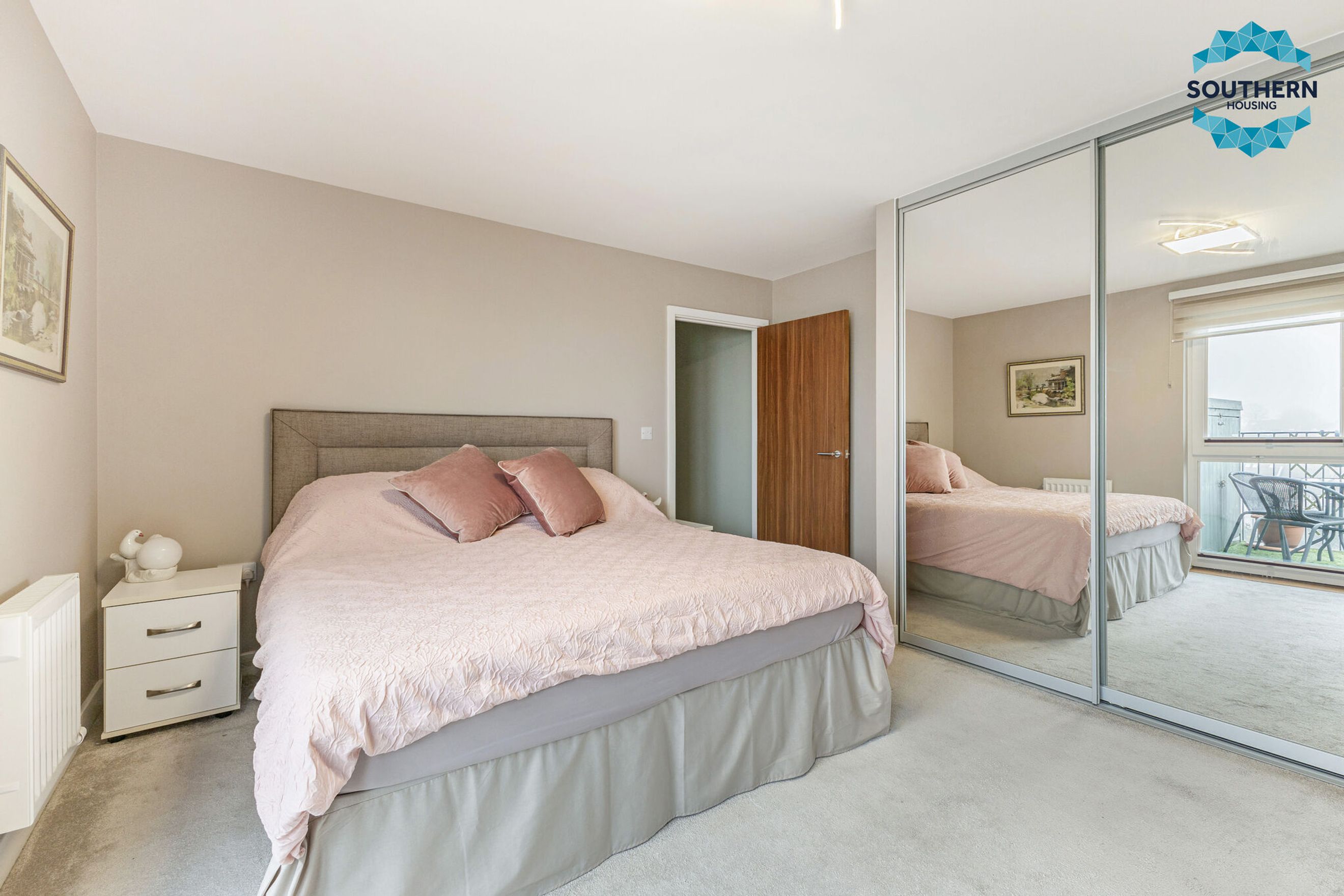 The master bedroom is generously proportioned, offering plenty of space for bedroom furniture and benefiting from two fitted double wardrobes. It also features a contemporary en‑suite shower room and direct access to an additional west facing private balcony.