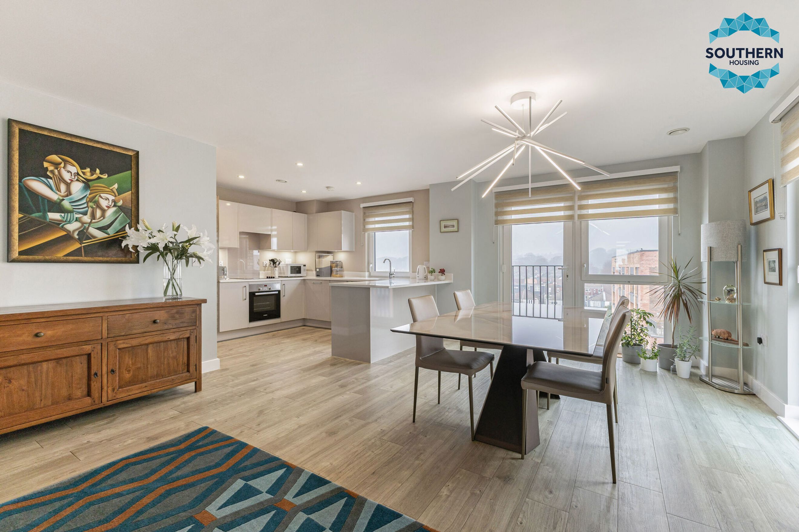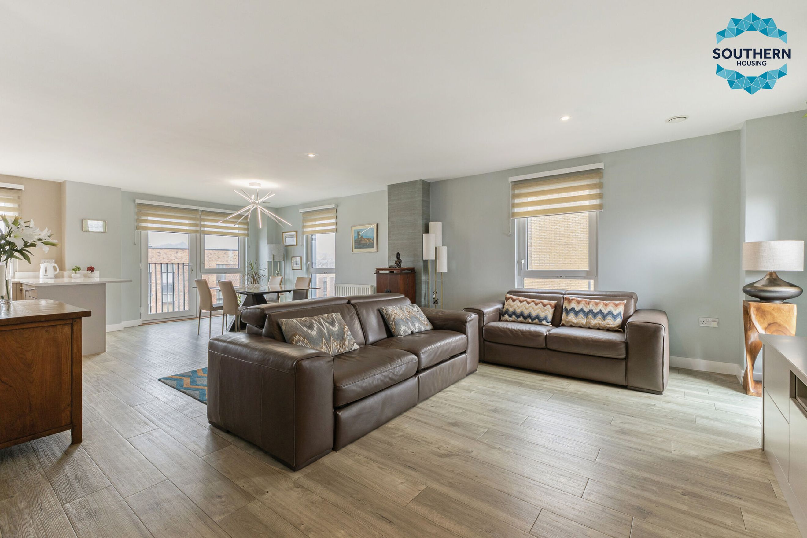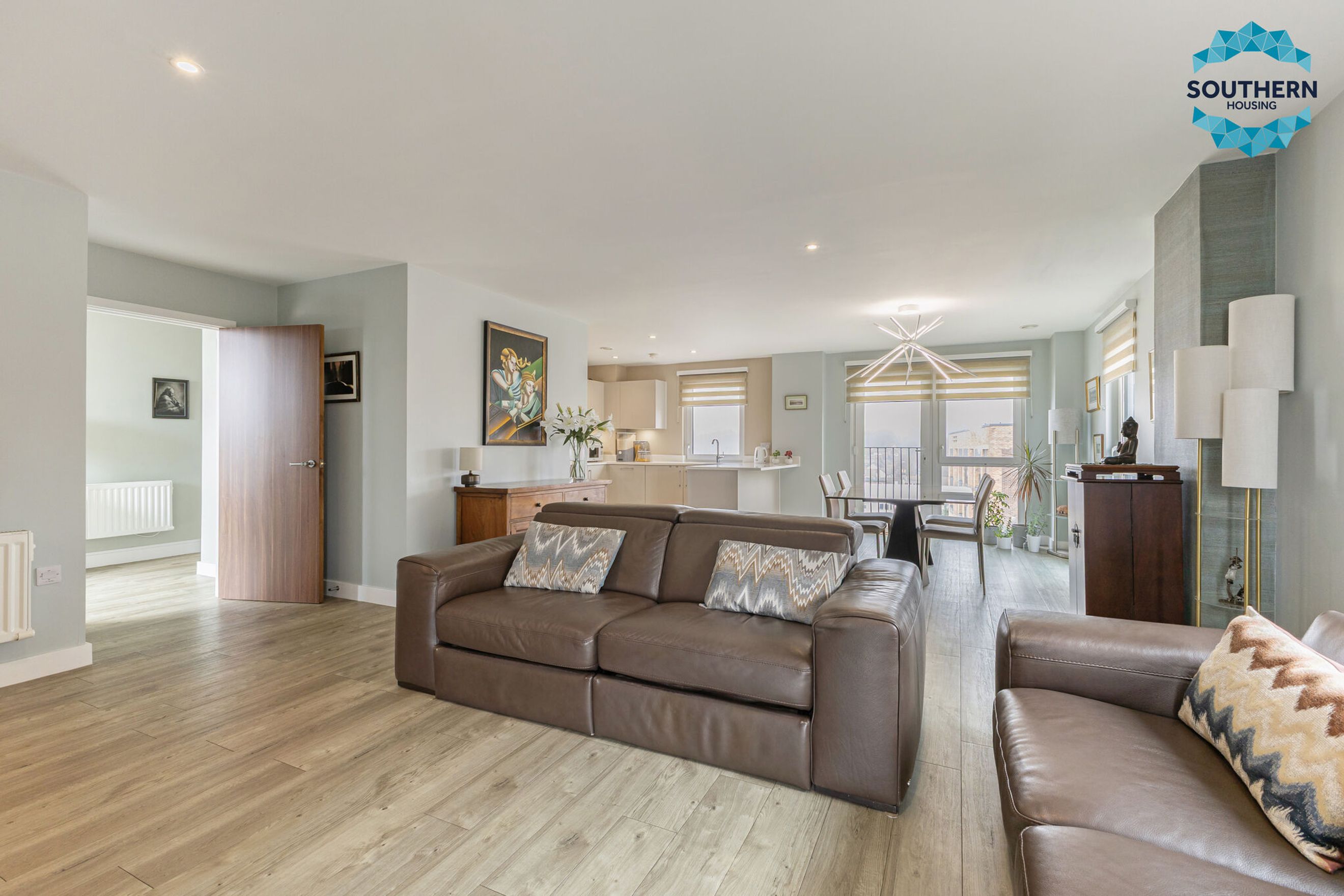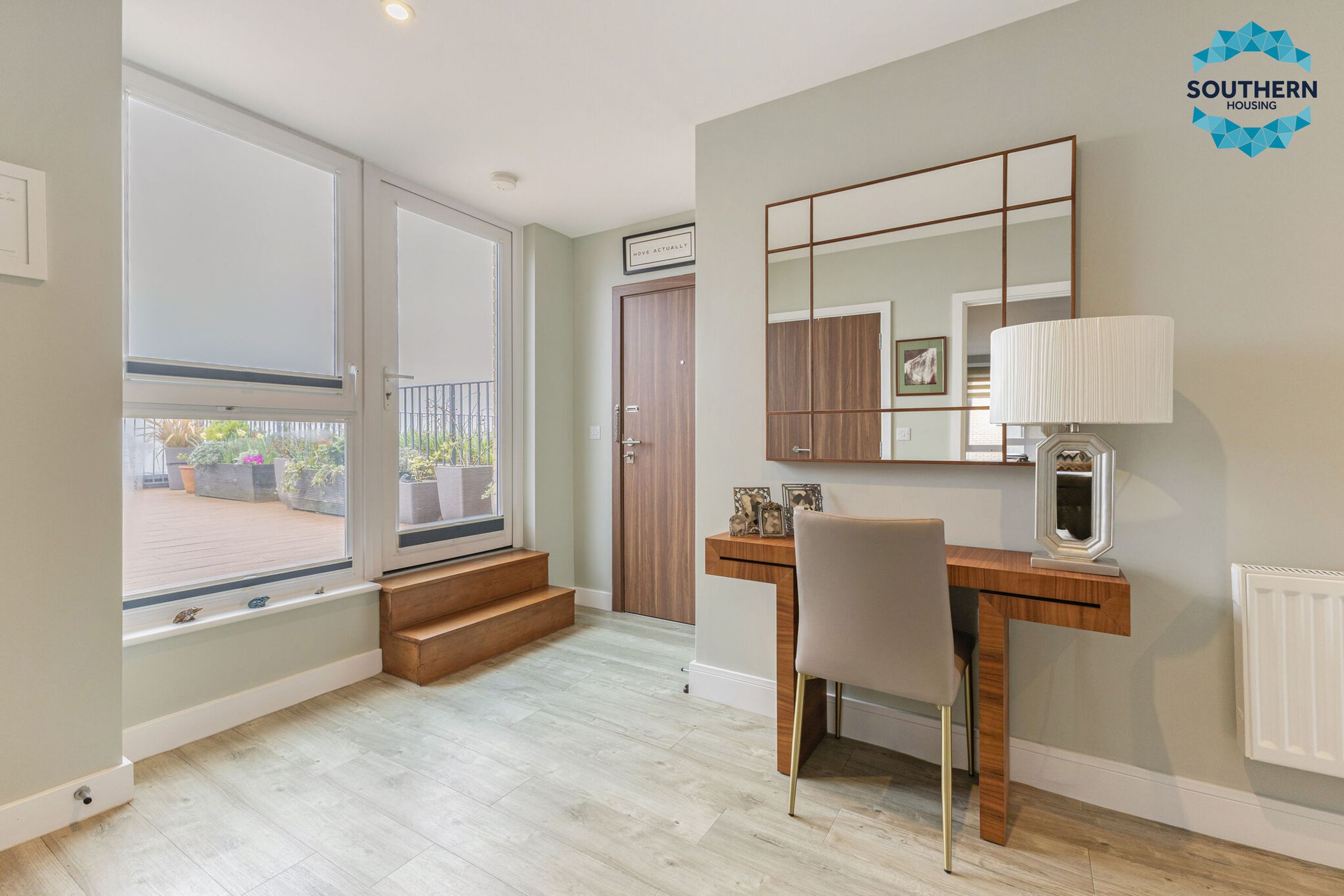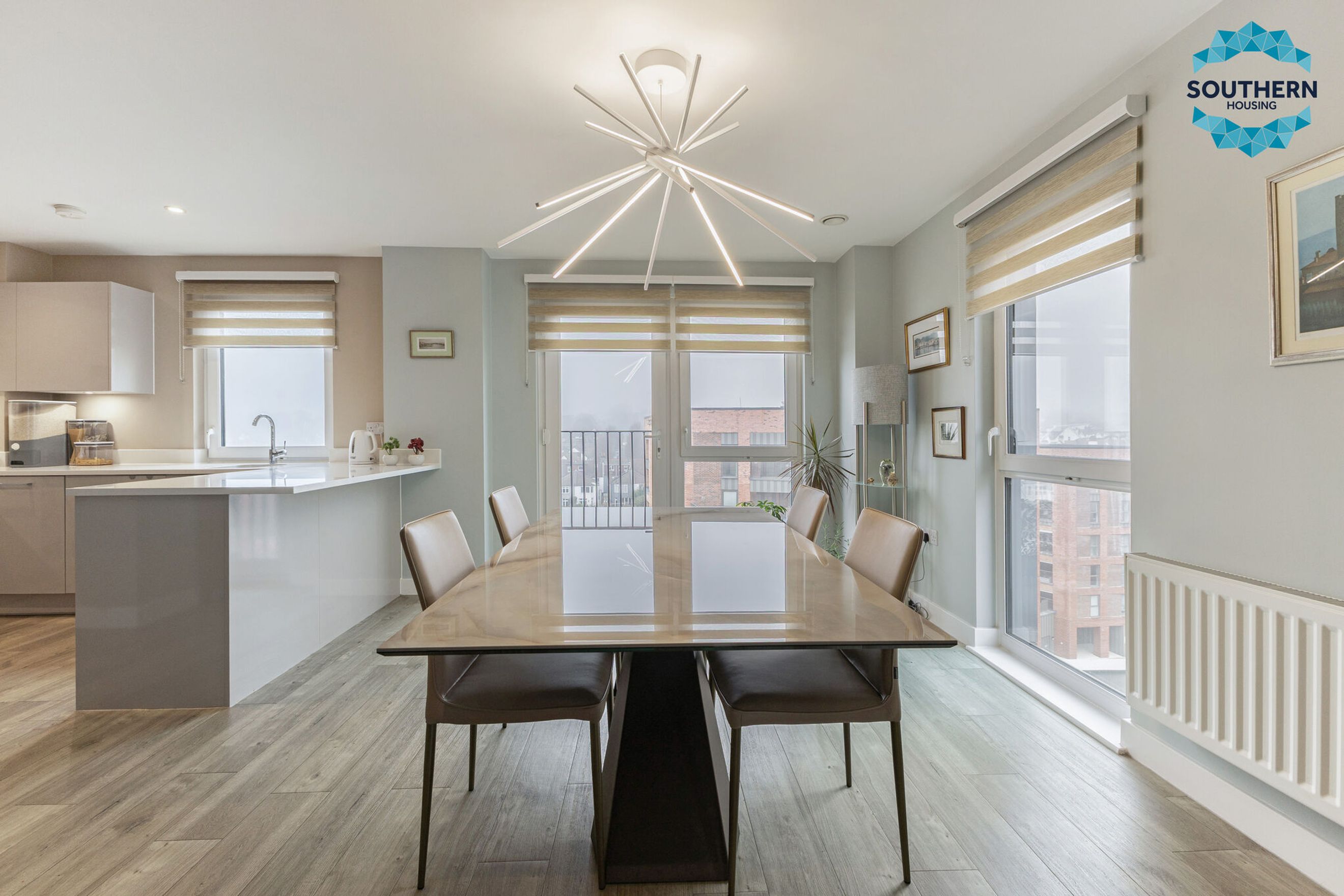 Upon entering, you are greeted by a spacious entrance hallway comprising a large usable space and utility cupboard with washing machine, boiler and Vent Axia climate system. From here, you are led into the expansive, bright open‑plan living area, an inviting space perfect for both relaxing and entertaining. The modern kitchen is well‑equipped with an integrated oven, hob, extractor fan, dishwasher and fridge/freezer. The large, bright dining area has a Juliet balcony with floor to ceiling opening doors.