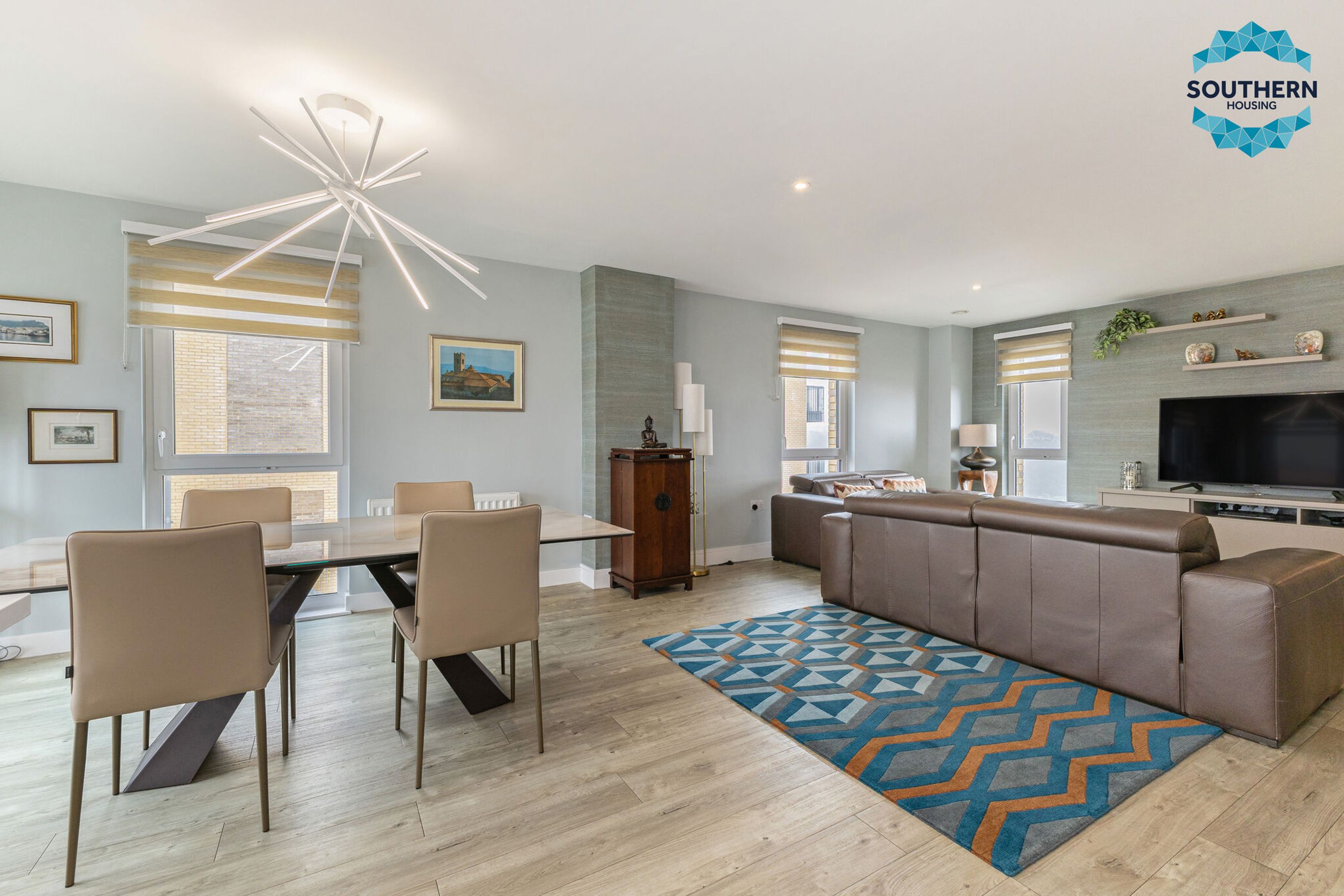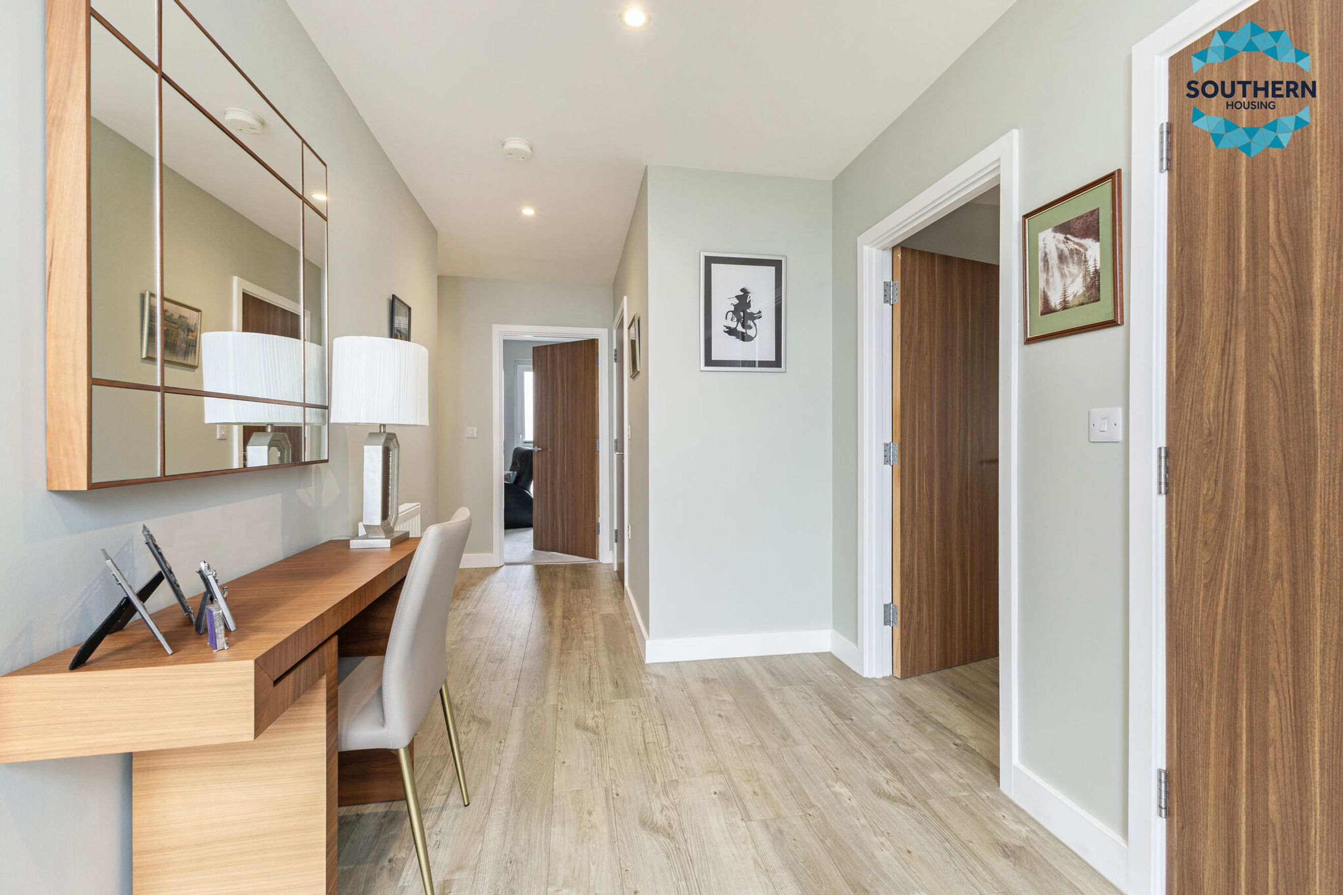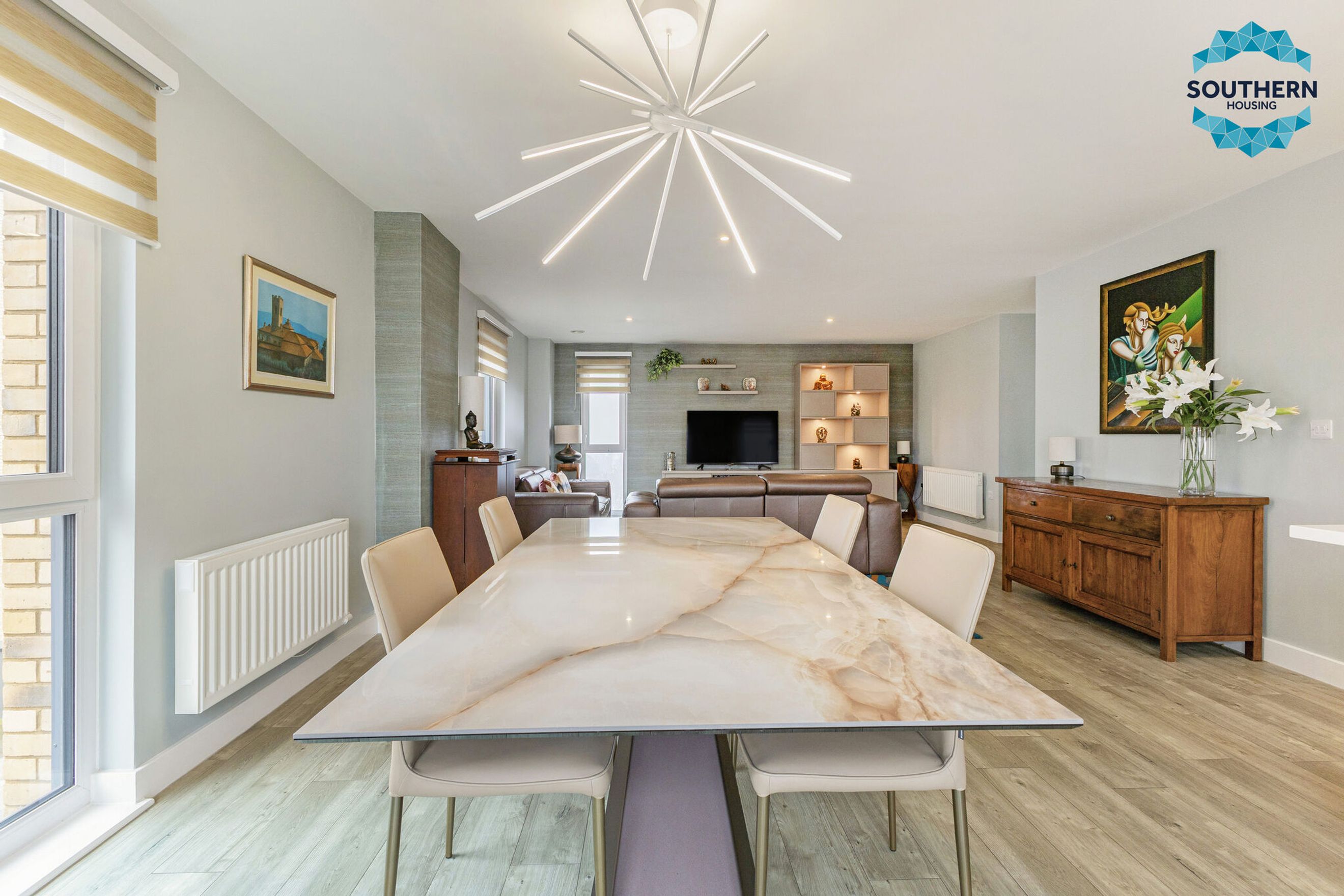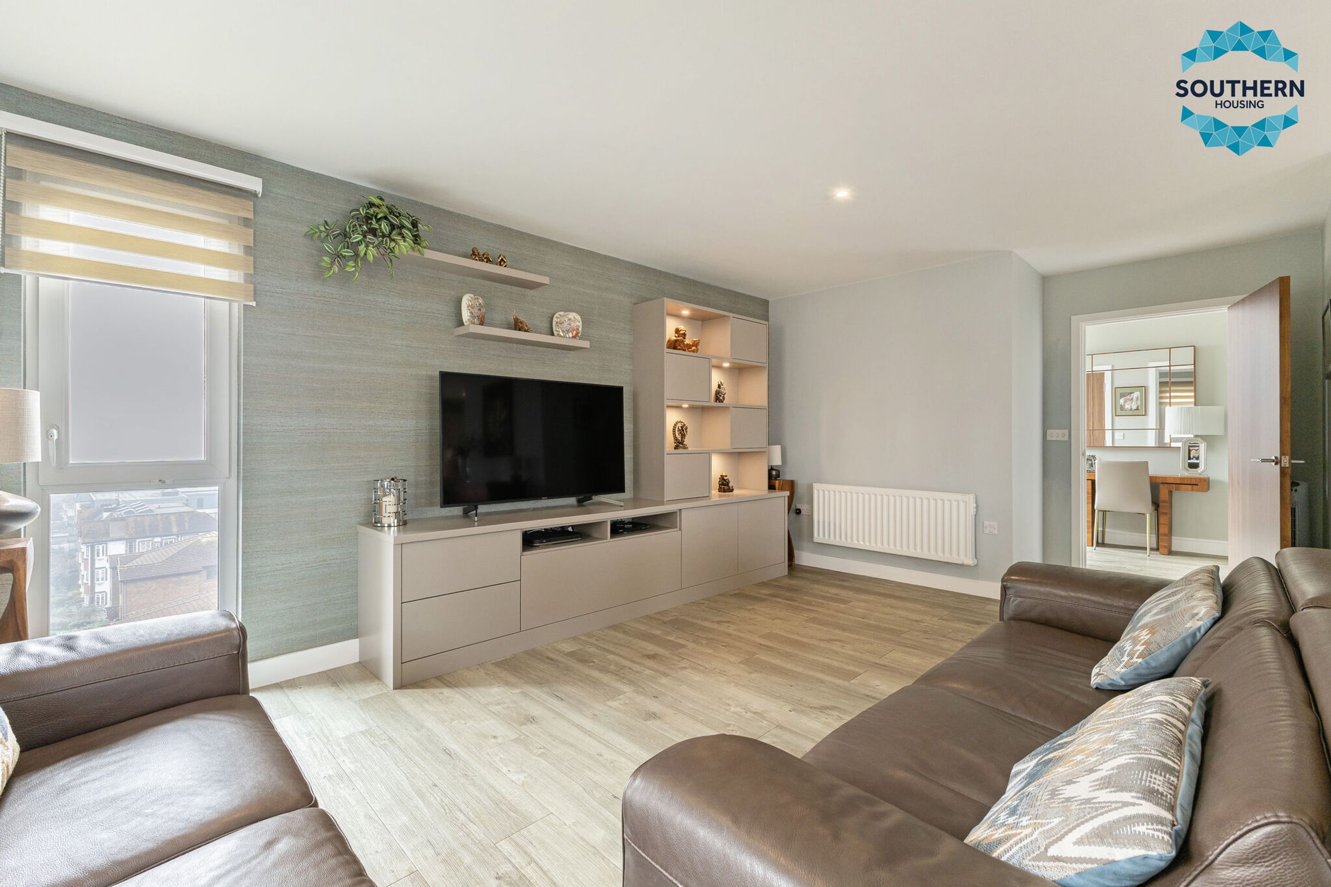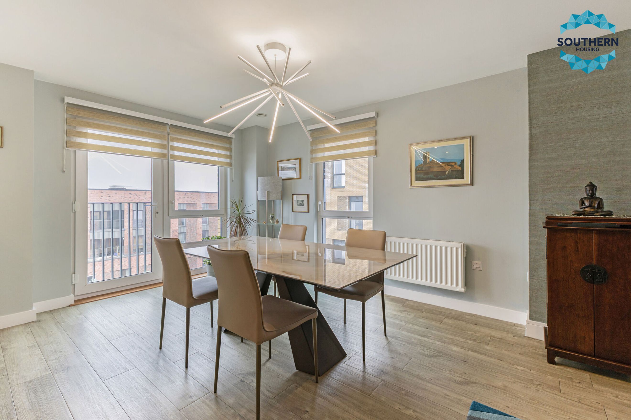 Upon entering, you are greeted by a spacious entrance hallway comprising a large usable space and utility cupboard with washing machine, boiler and Vent Axia climate system. From here, you are led into the expansive, bright open‑plan living area, an inviting space perfect for both relaxing and entertaining. The modern kitchen is well‑equipped with an integrated oven, hob, extractor fan, dishwasher and fridge/freezer. The large, bright dining area has a Juliet balcony with floor to ceiling opening doors.