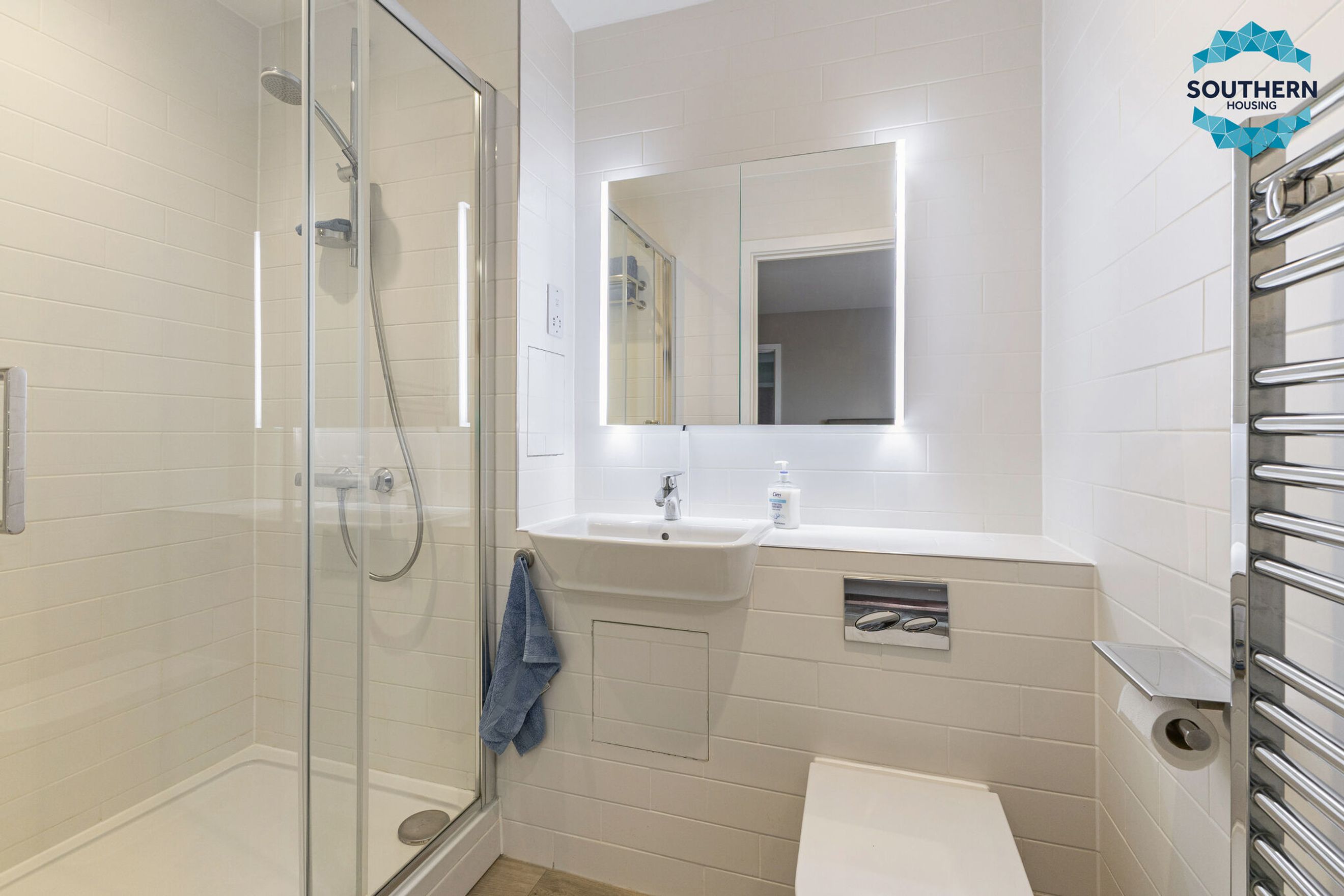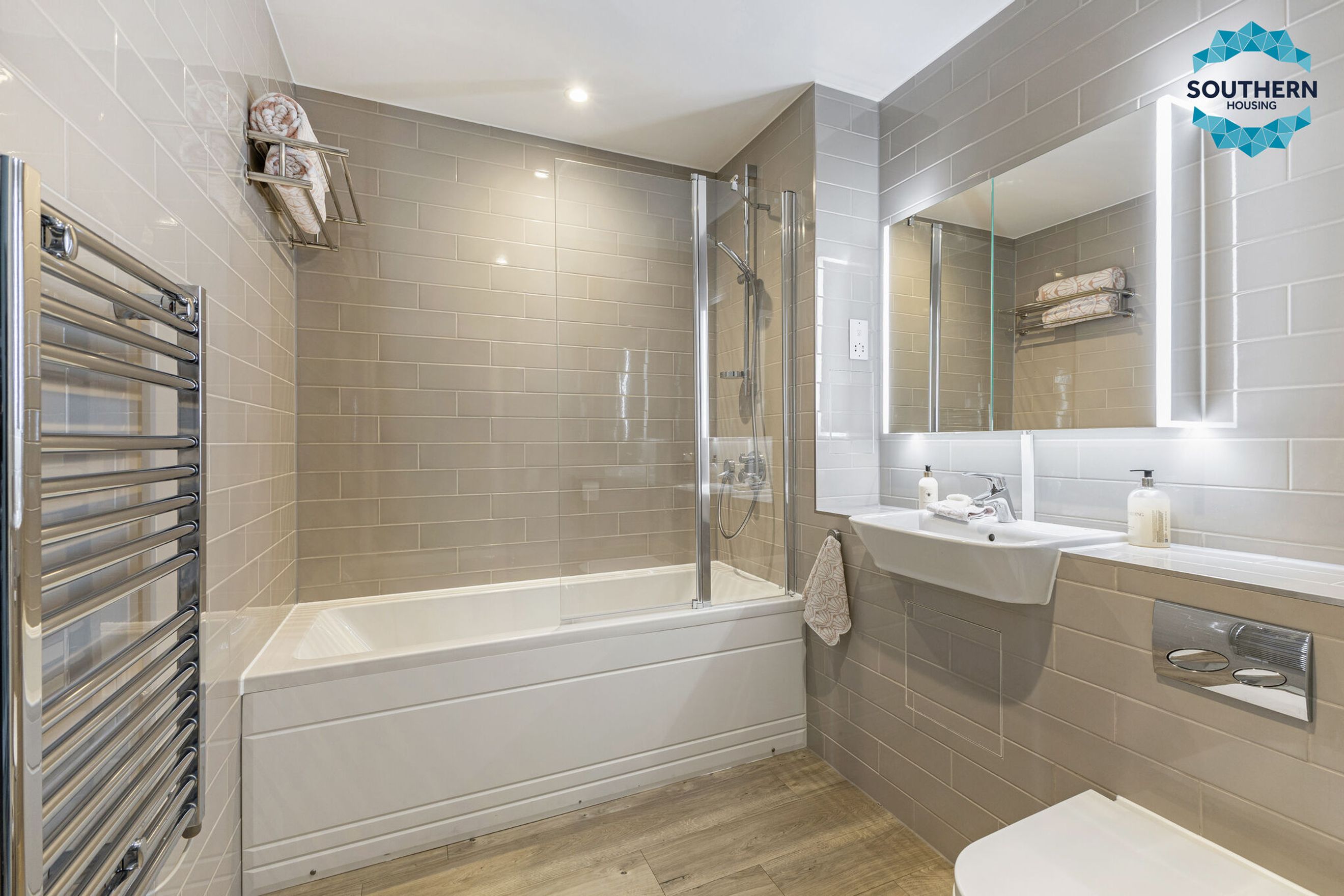 The main bathroom is finished to a high standard with floor‑to‑ceiling tiles and a bath with overhead shower.