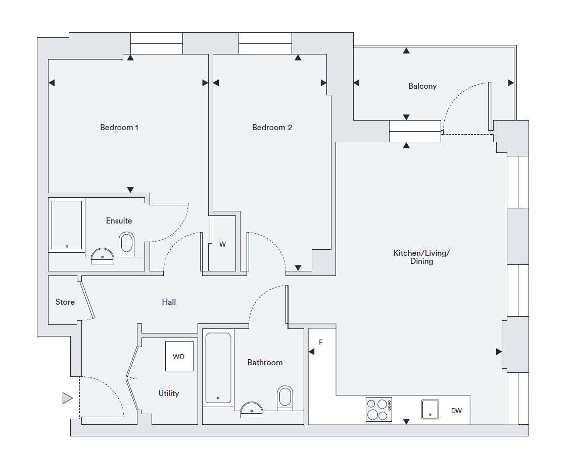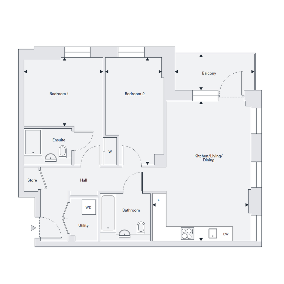 2 bedroom, 2 bathroom, 6th floor apartment offering 71.1 sq.m of internal floor area with outdoor space. Boosting a bright and airy open-plan kitchen/living/dining area with Bosch integrated appliances.