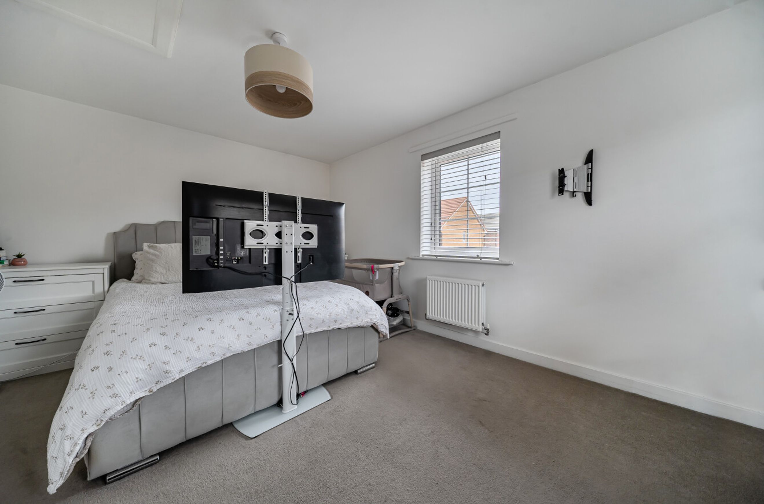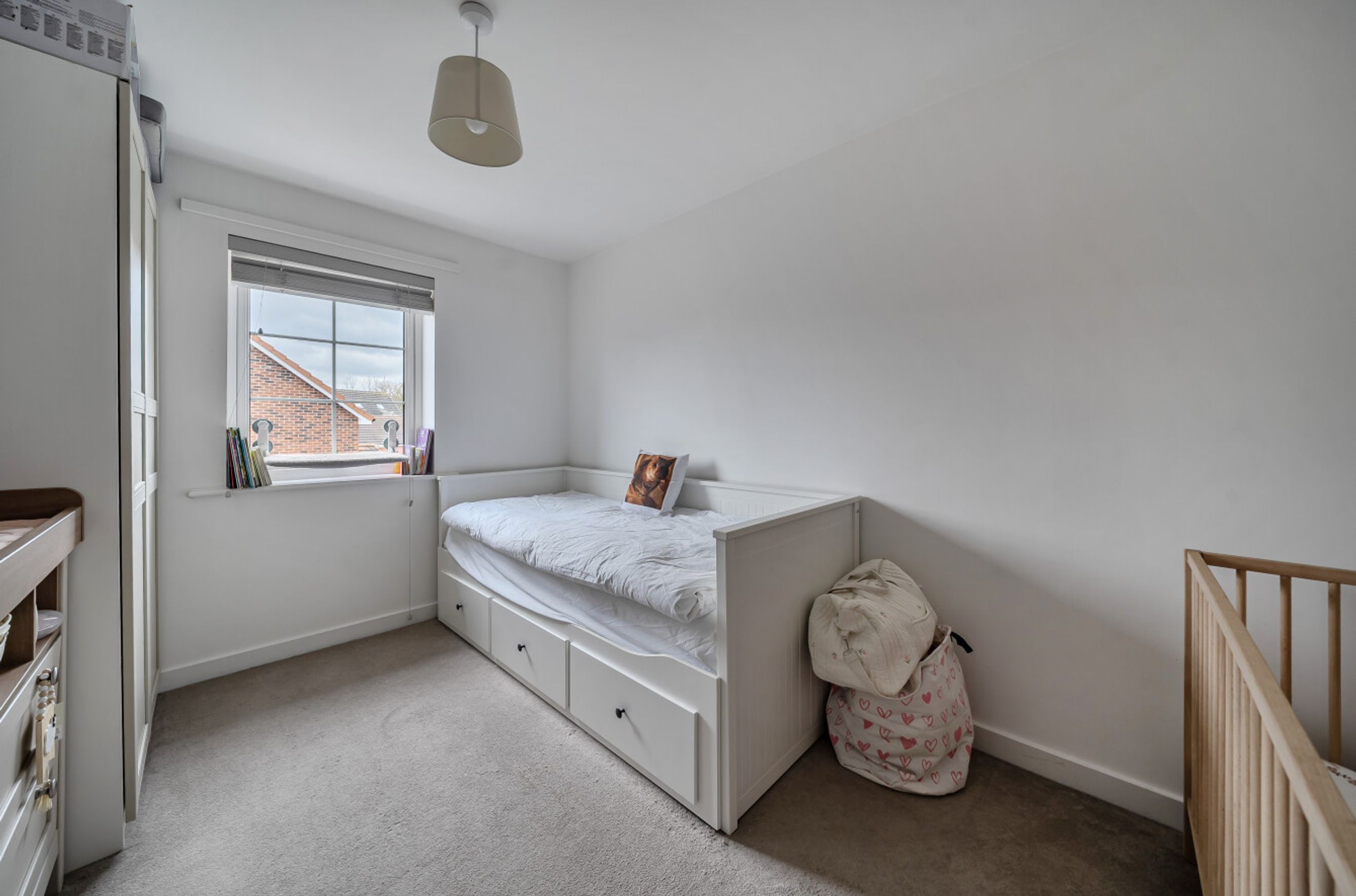 Upstairs, there are three comfortable bedrooms. The bathroom has a modern, white suite.