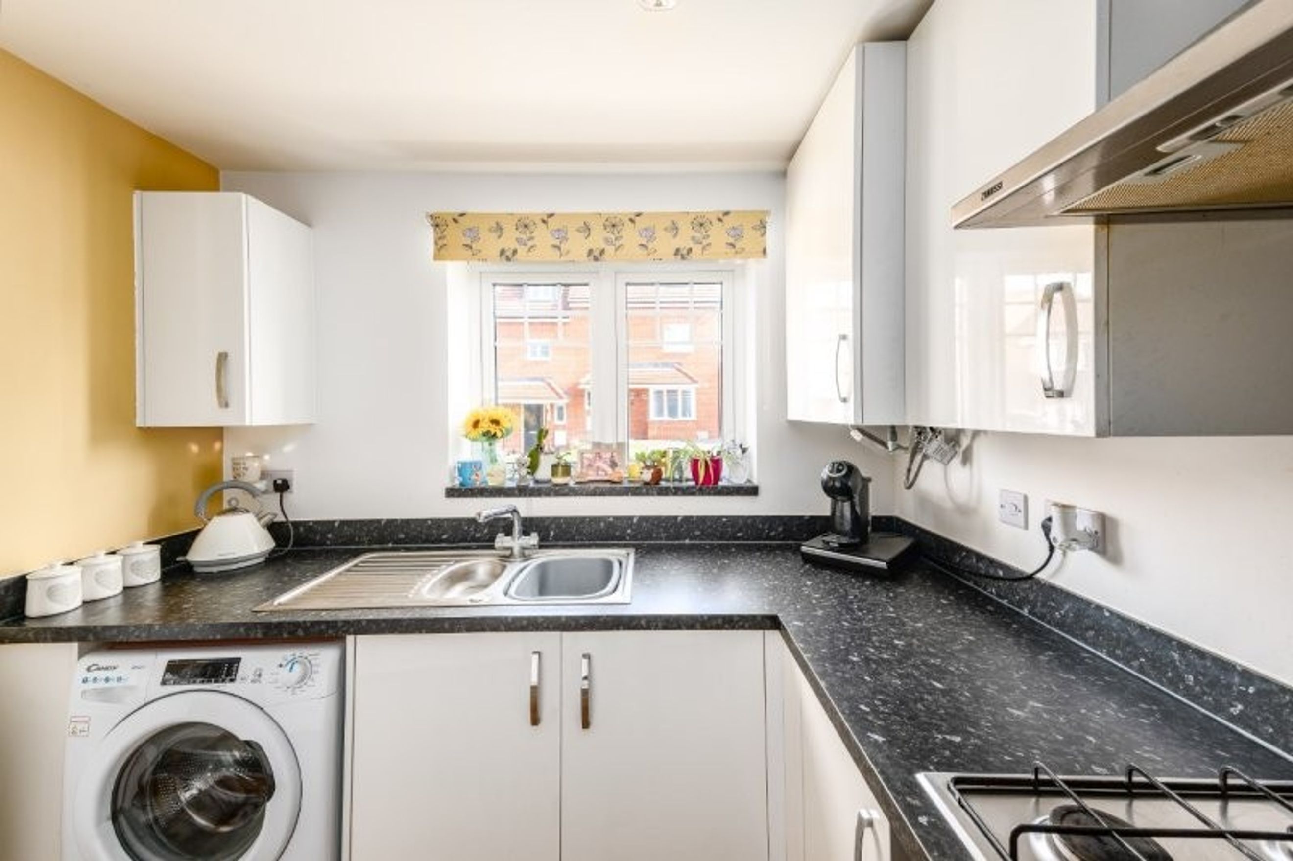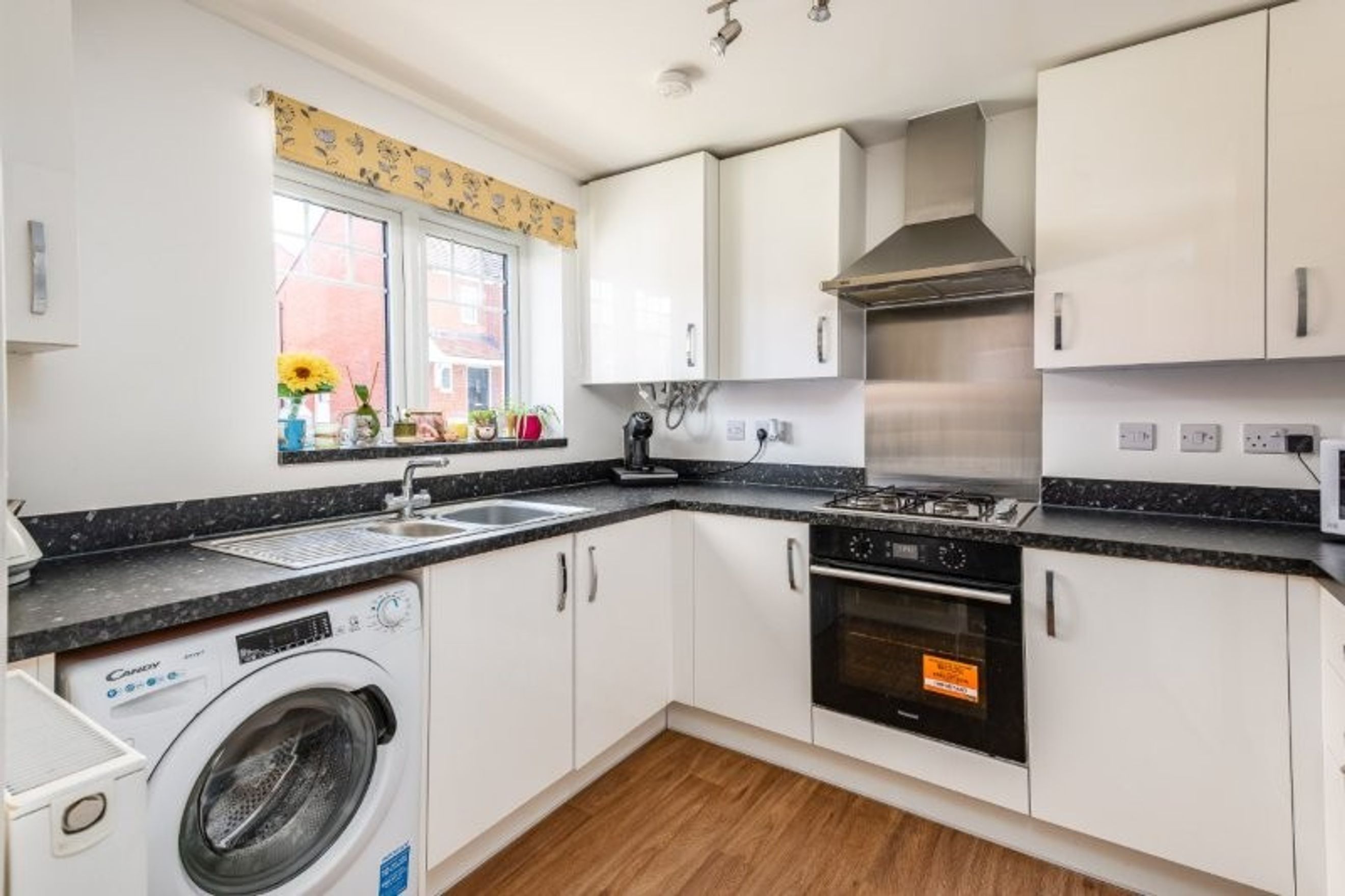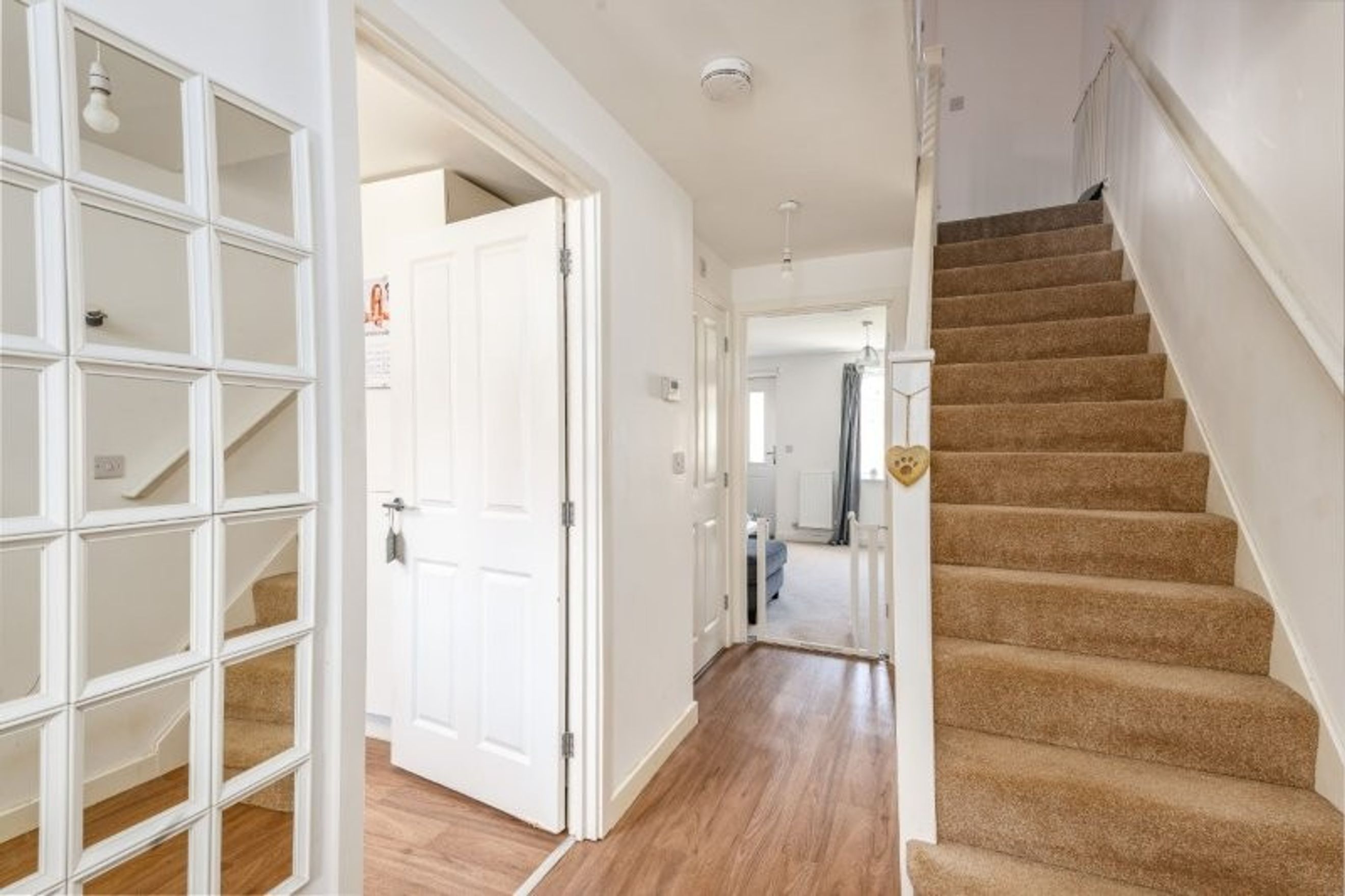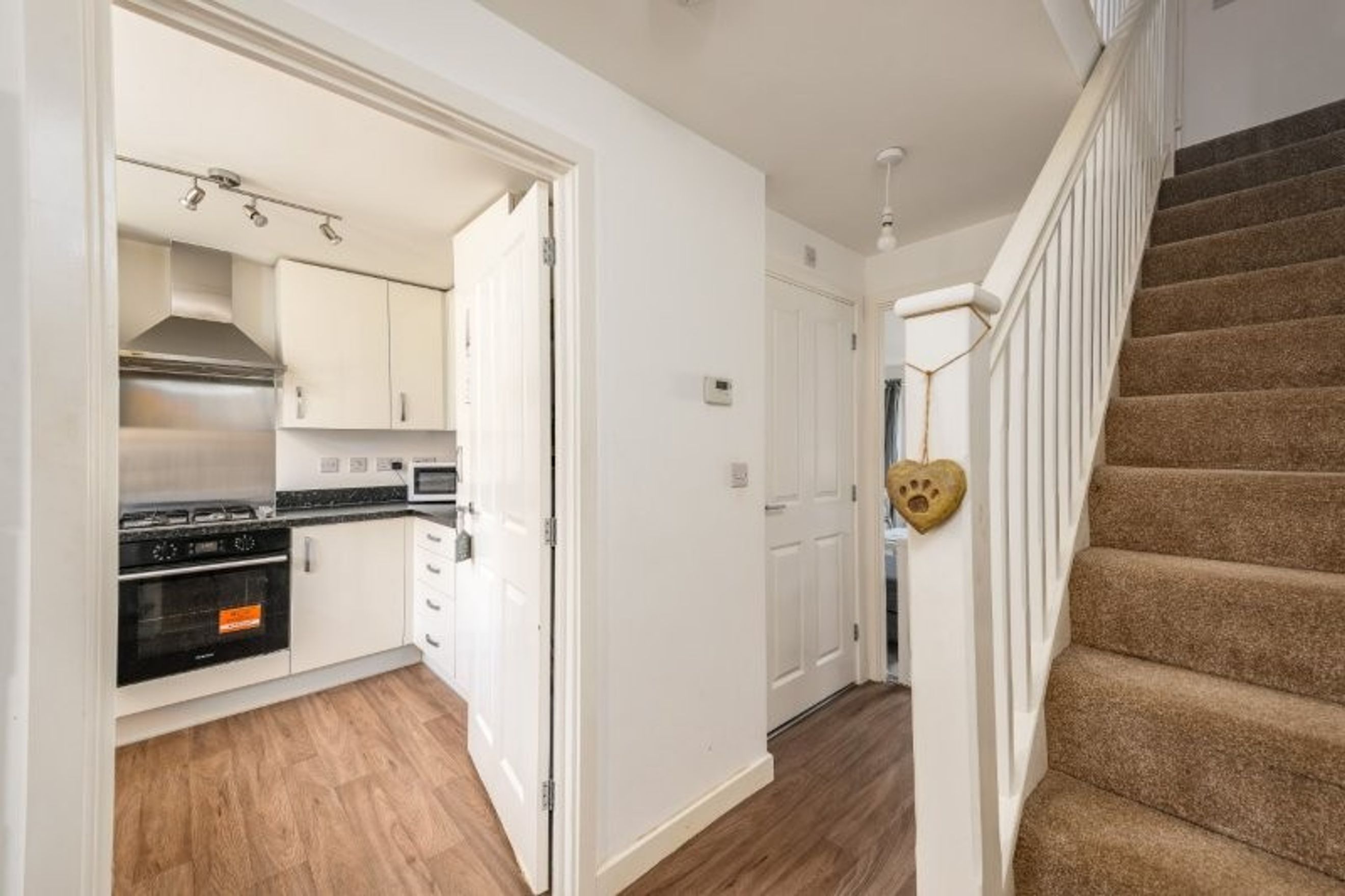 The property opens into a welcoming hallway, leading to a contemporary kitchen fitted with high-gloss white units and ample worktop space. A wide downstairs toilet and a useful under-stair storage cupboard add to the practicality of the layout just off the hallway.