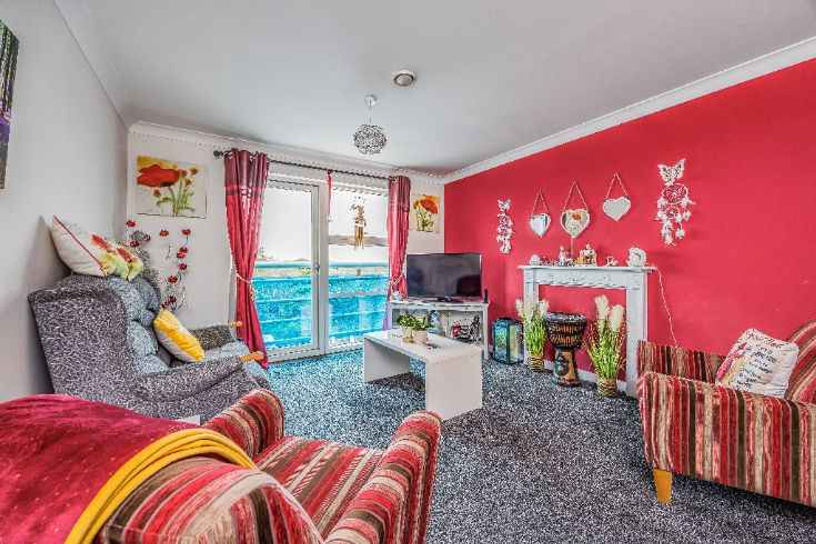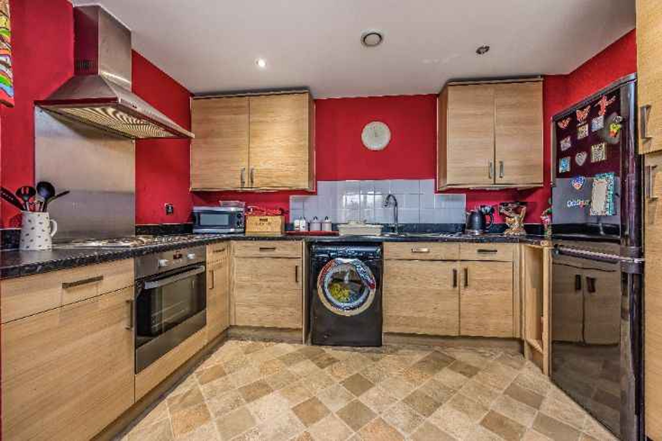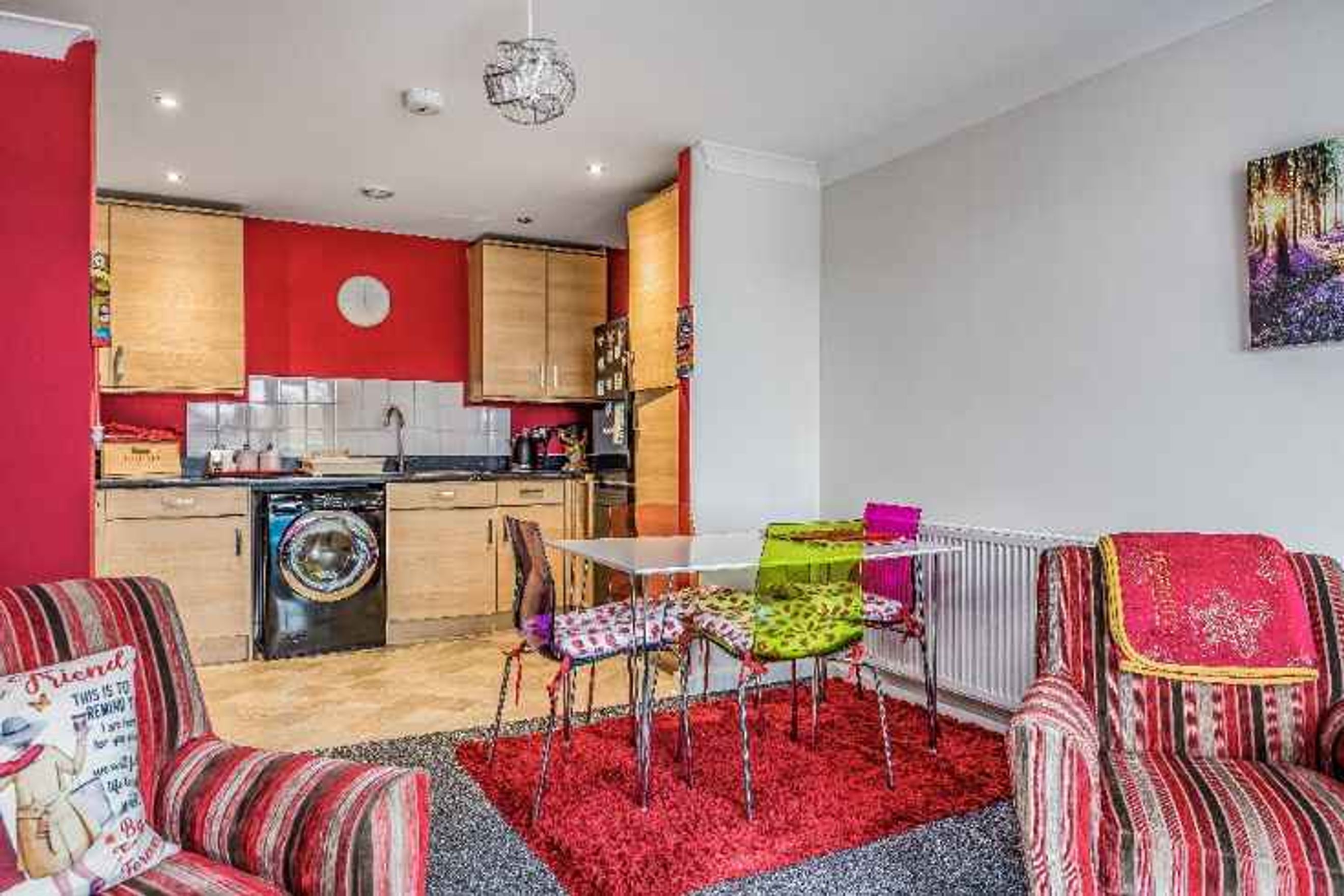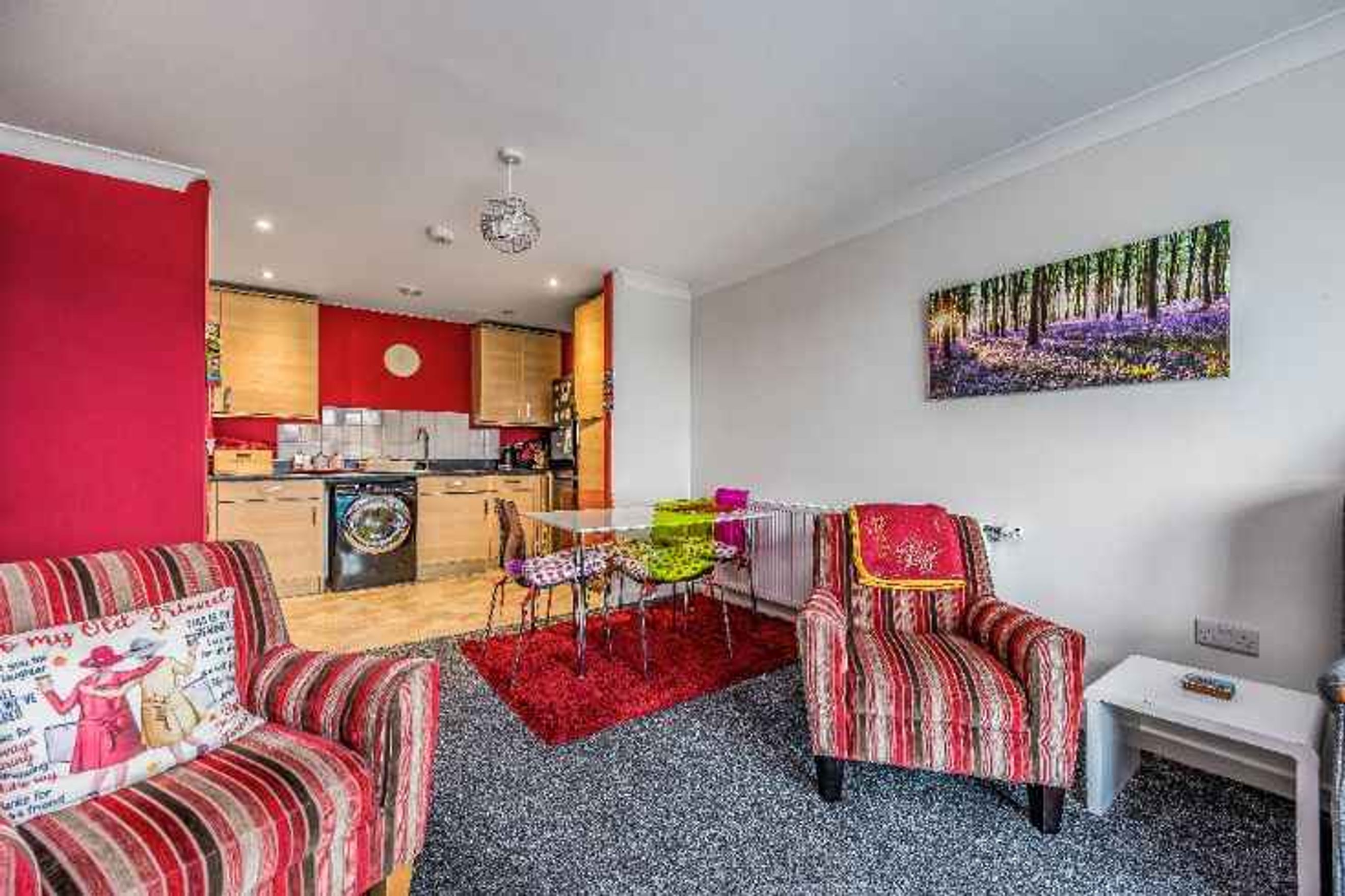 The property features an open‑plan kitchen and lounge, complete with an integrated oven, hob and extractor fan, and a Juliette balcony providing additional light and ventilation.