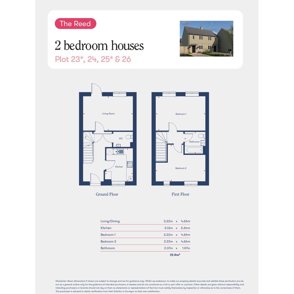 Inside, the separate kitchen (3.12m x 2.64m) keeps cooking space distinct from the living/dining room (3.22m x 4.66m). Upstairs there are 2 bedrooms and a bathroom, while a downstairs WC adds everyday convenience. Approx internal area: 72.9 m² (about 785 sq ft).